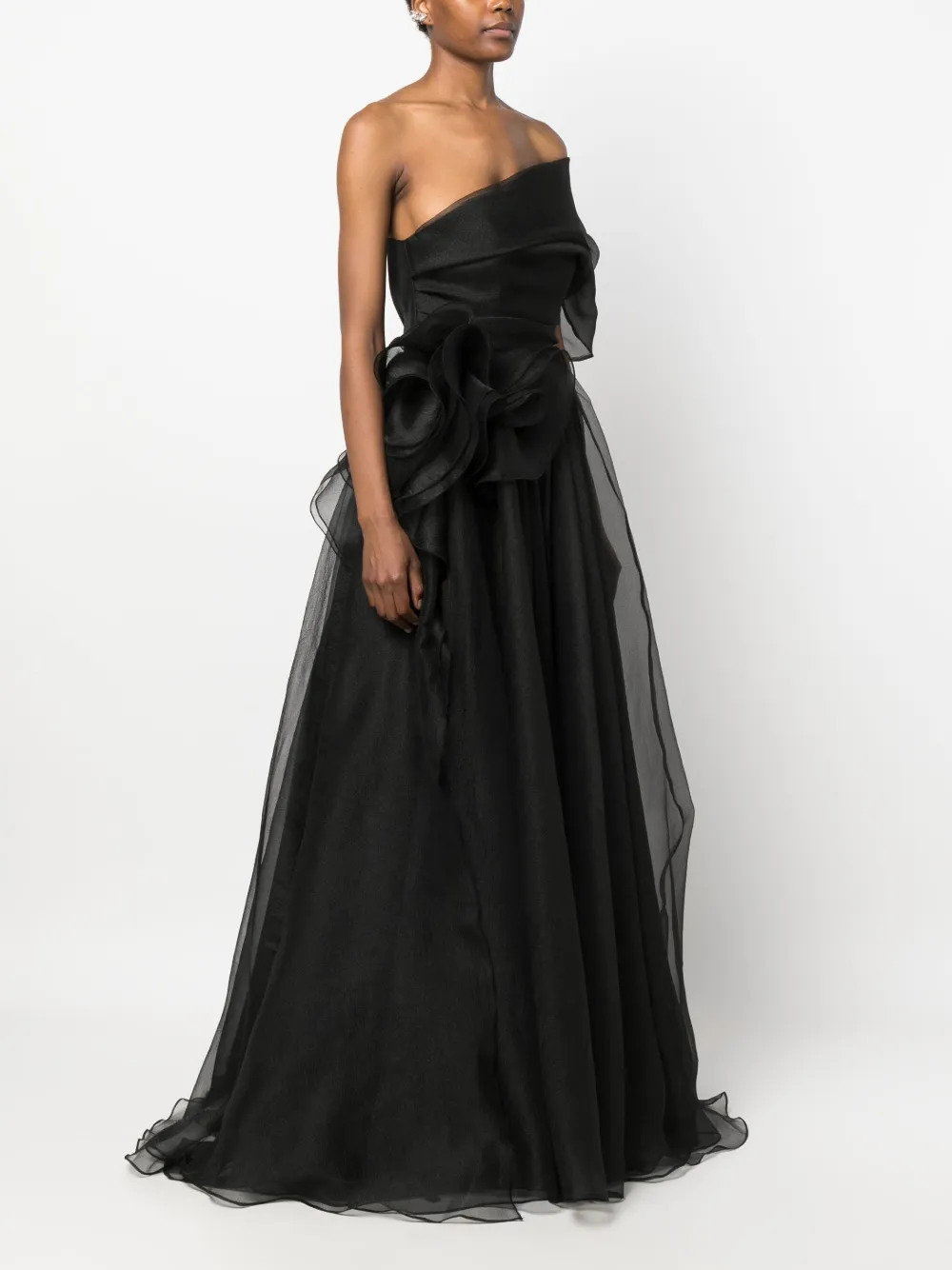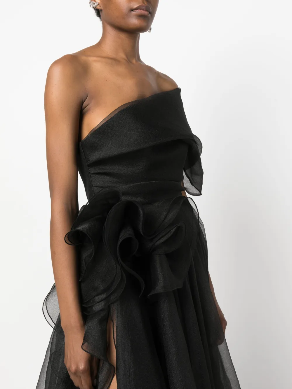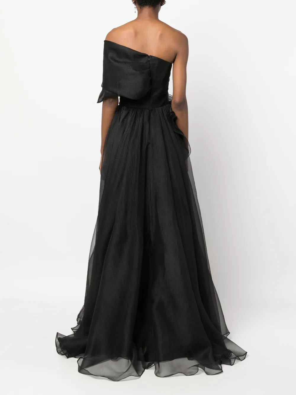 Черный, однотонная расцветка, модель на одном плече, драпировка, дизайн со сборками, застежка на молнии сзади, пышная юбка, разрез спереди и длина макси.