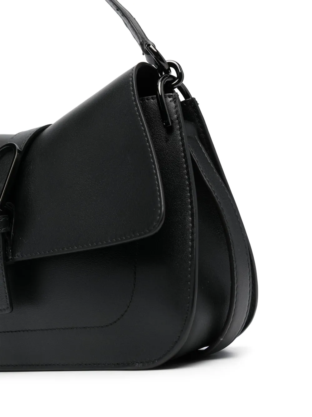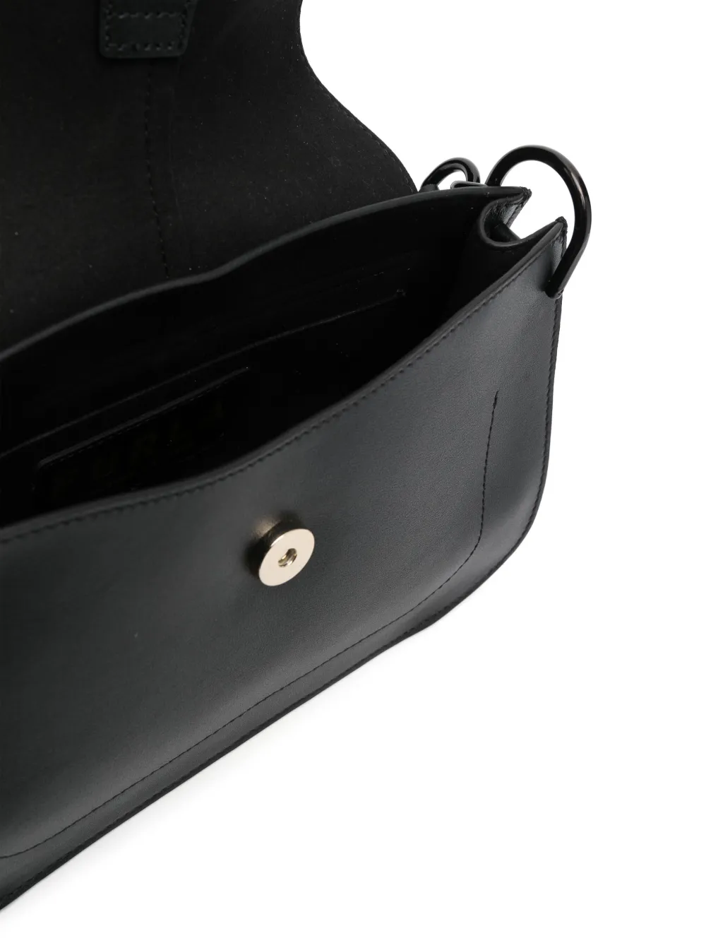 Черный, телячья кожа, серебристый металлический логотип, тисненый логотип сзади, строчка в тон, фурнитура в тон, откидной клапан на магните, ручка с плоским верхом, съемный ремень на плечо и прорезной карман сзади.