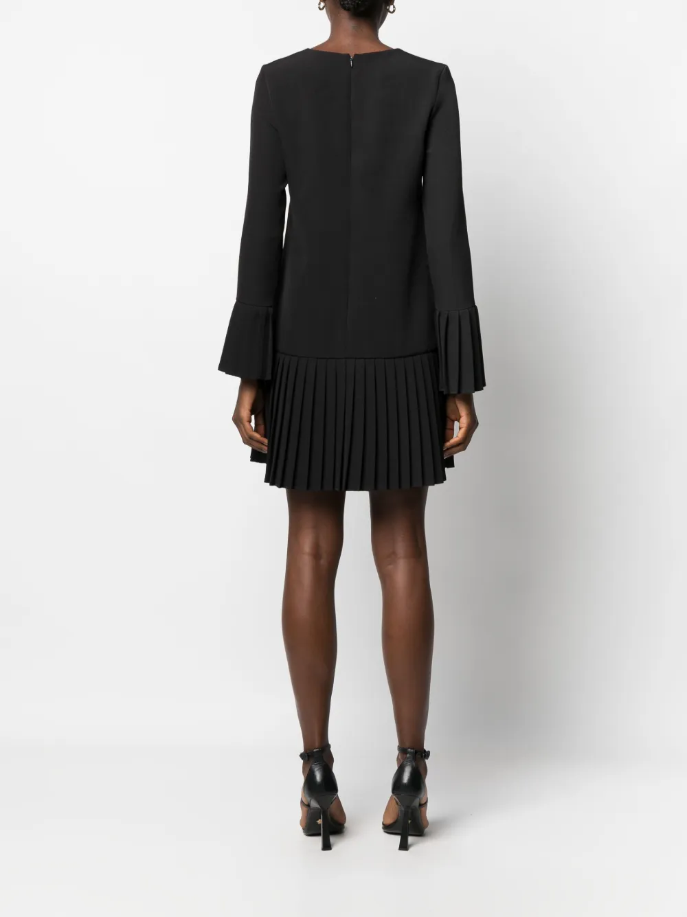 Черный, эластичный материал, золотистые заклепки, логотип из заклепок, складки, круглый вырез, длинные рукава, потайная застежка на молнии сзади, расклешенный подол и длина выше колена.