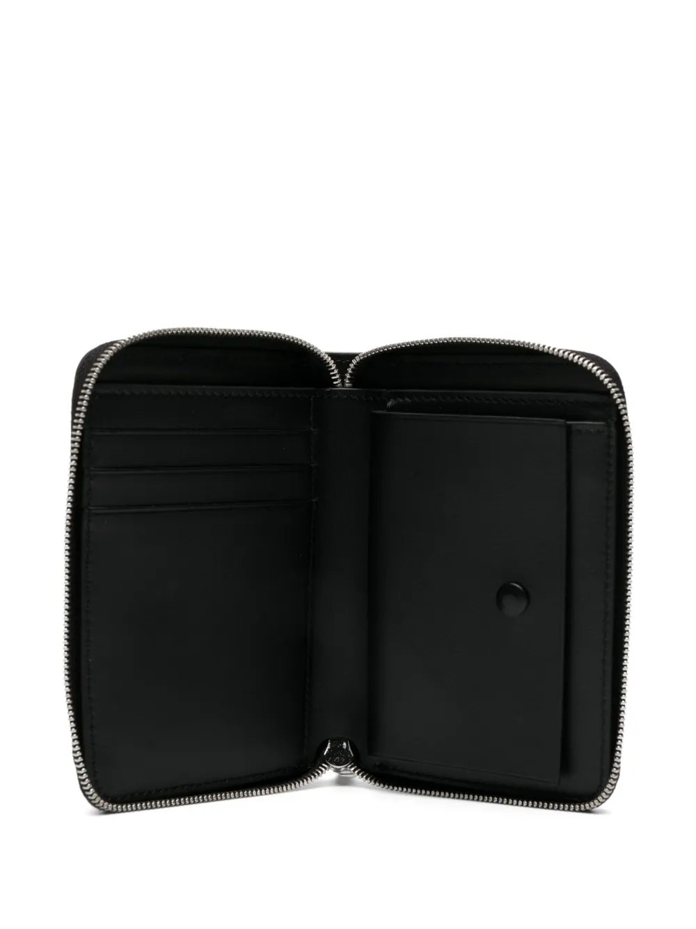 Черный, телячья кожа, тисненый логотип спереди, серебристая фурнитура, прямоугольная оправа, круговая молния, внутренние отделения для карт, отделение для купюр и внутренний карман на кнопке.