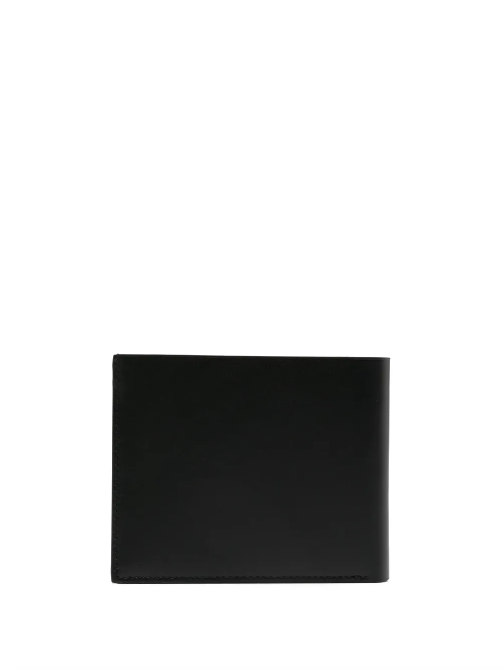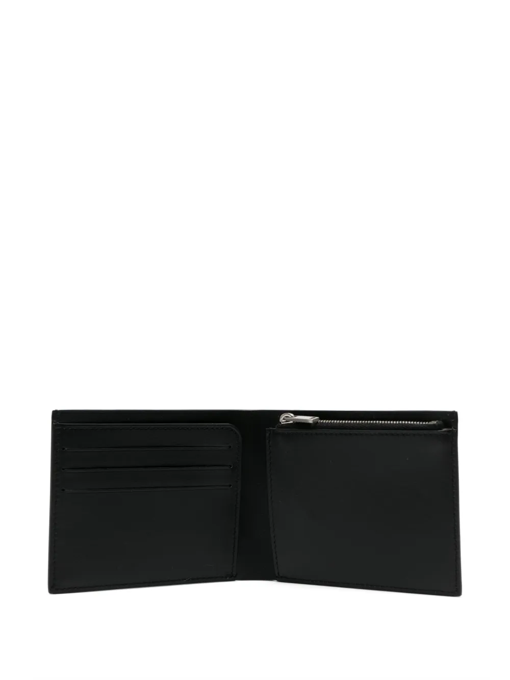 Черный, телячья кожа, гладкая текстура кожи, два сложения, тисненый логотип спереди, квадратная форма, серебристая фурнитура, отделение для купюр, отделения для карт и внутренний карман на молнии.