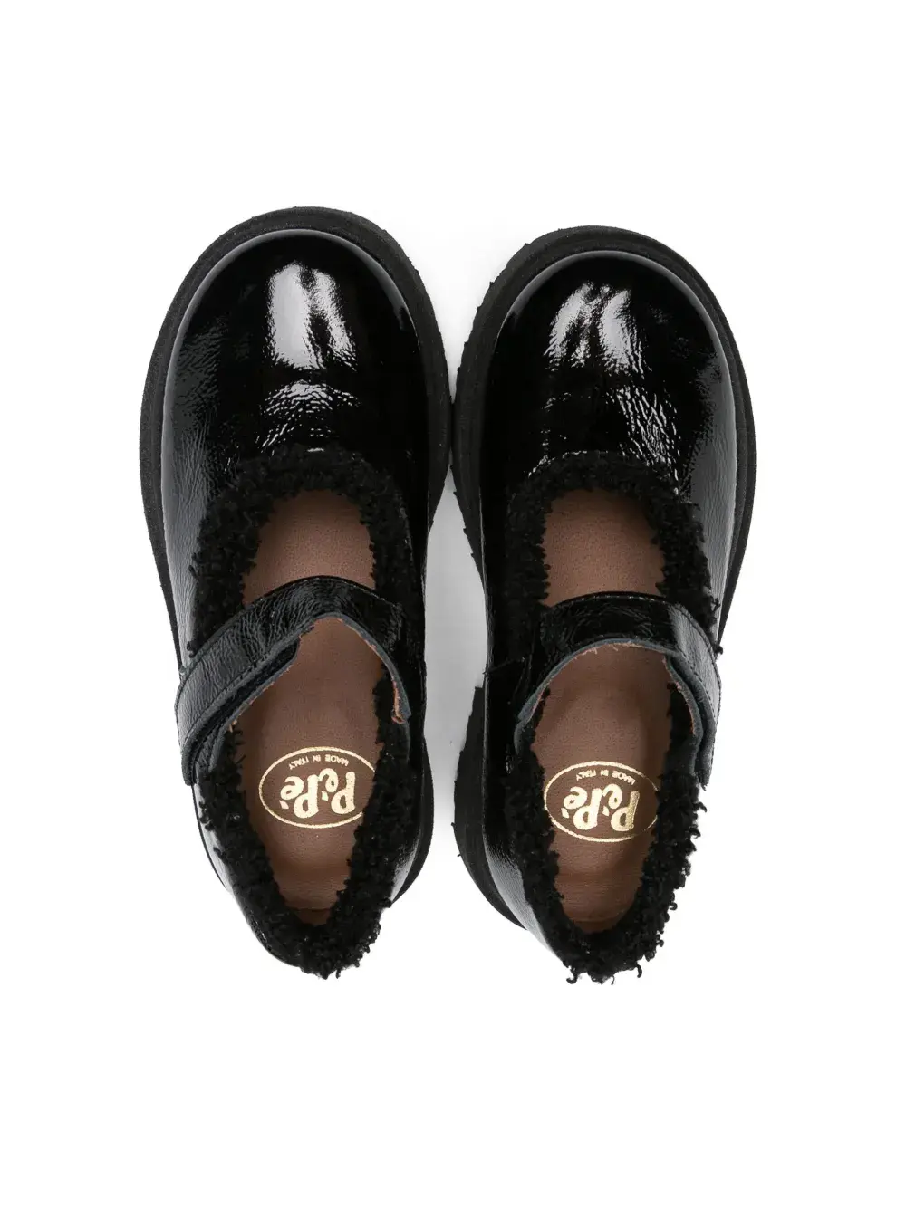 Черный, телячья кожа, лакированная отделка, жатый эффект, отделка из искусственного меха, застежка на липучке спереди, закругленный носок и рифленая резиновая подошва.