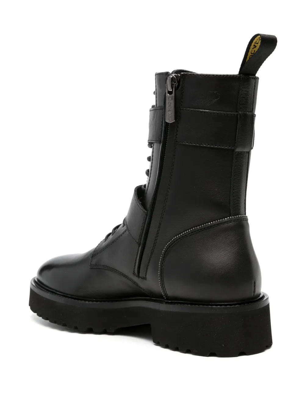 Черный, телячья кожа, закругленный носок, шнуровка спереди, боковые застежки с пряжками, петля для подтягивания сзади и резиновая подошва.