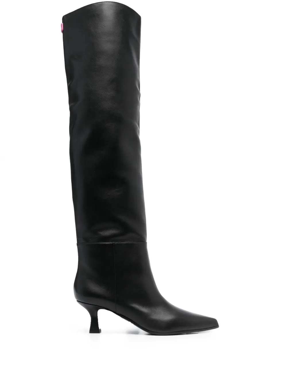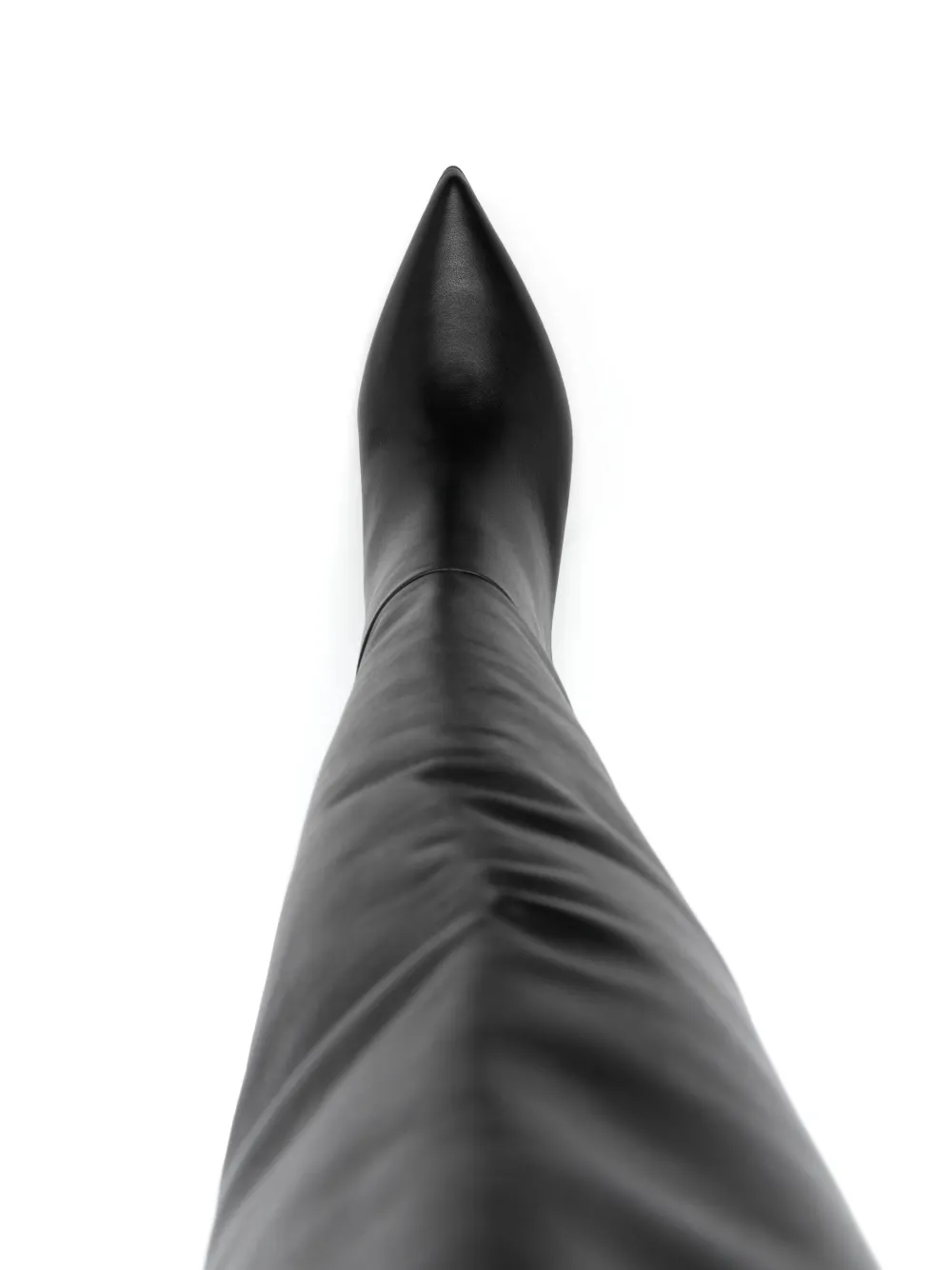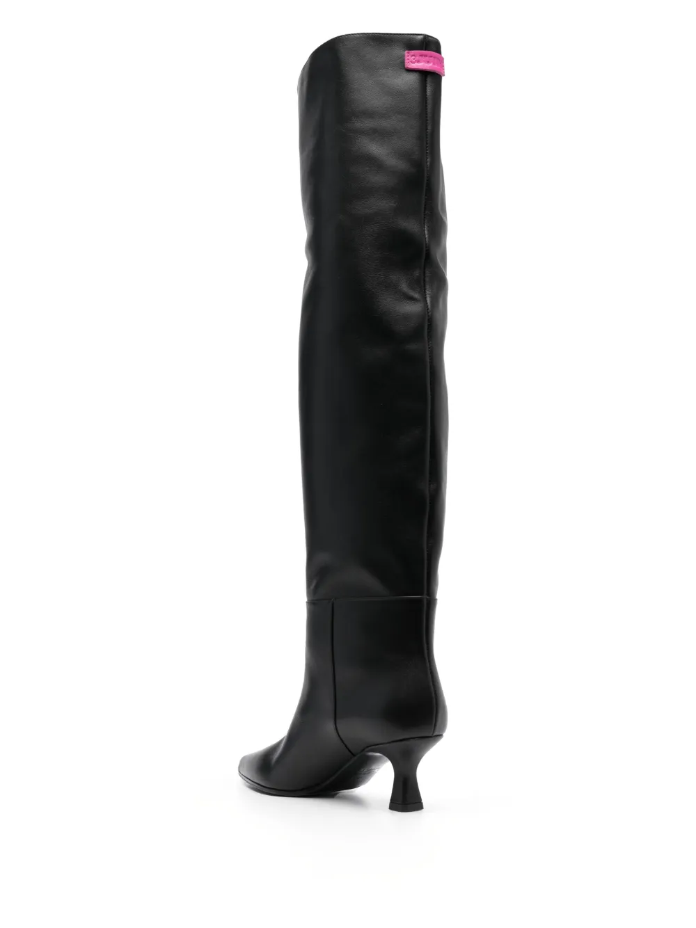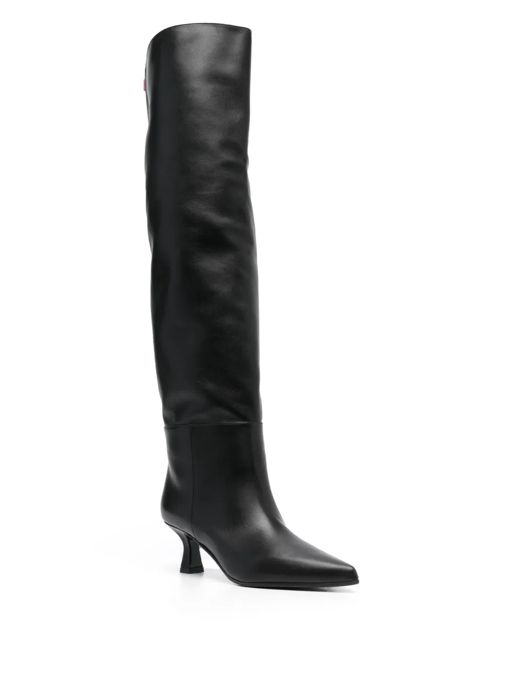 Черный, телячья кожа, тисненый логотип сзади, длина по колено, заостренный носок, модель без застежки, кожаная стелька с логотипом, кожаная подошва и высокий каблук.