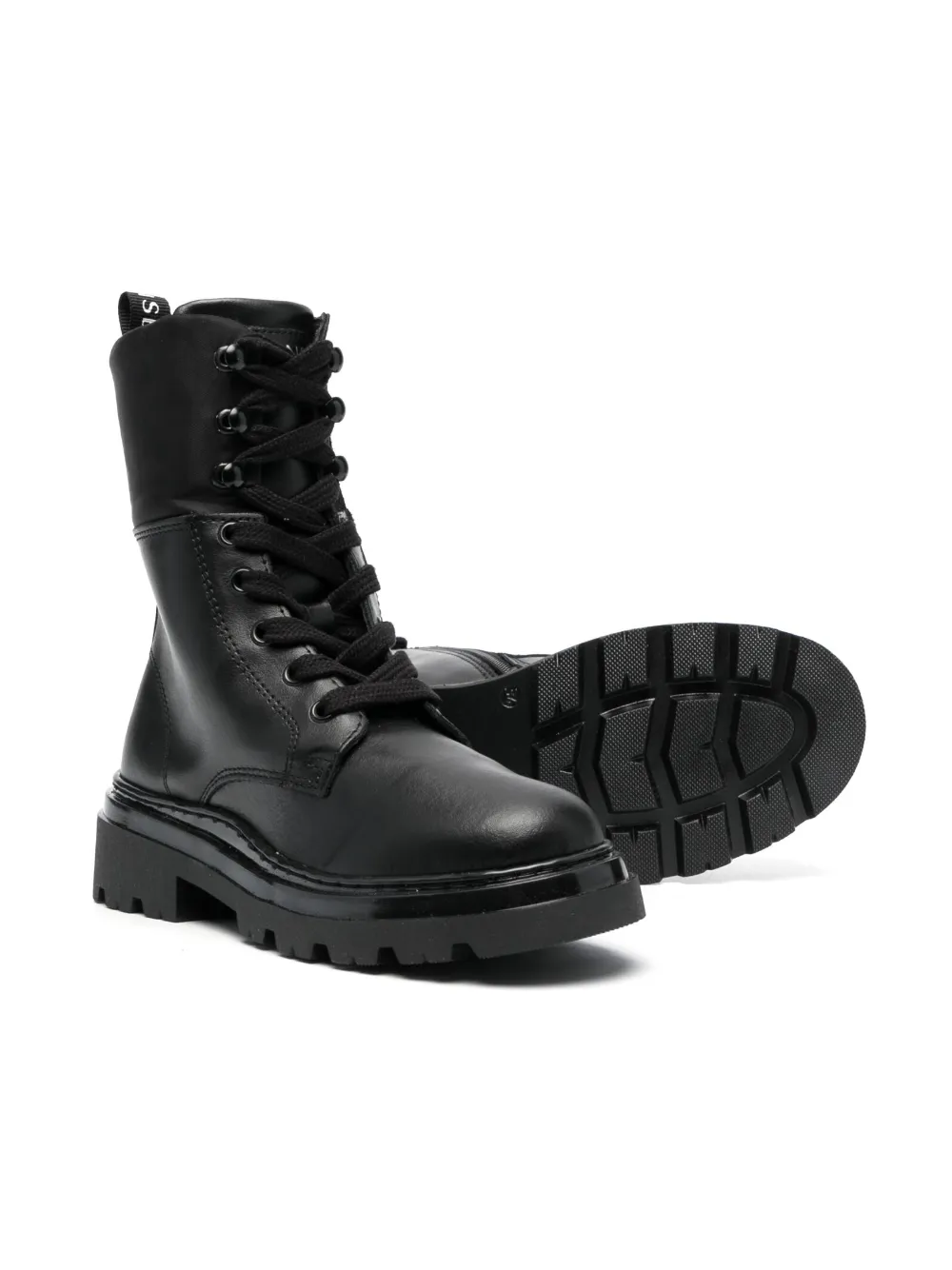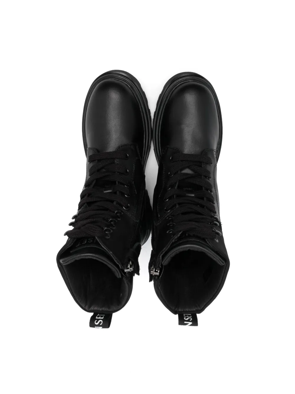 Черный, телячья кожа, петля для подтягивания с логотипом, закругленный носок, шнуровка спереди, застежка на молнии сбоку и массивная резиновая подошва c протектором.