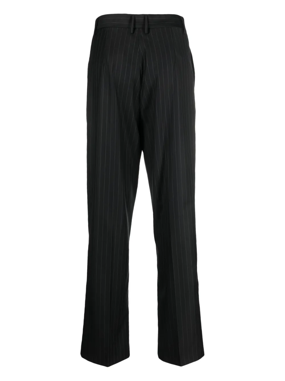Черный, смесь шерсти и шелка, принт в тонкую полоску, петли для ремня, смещенная застежка спереди, потайная застежка спереди и строгий крой.