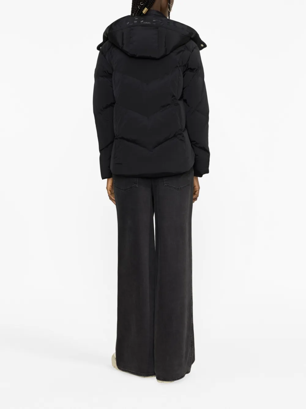 Черный, наполнитель из пуха и перьев, дутый материал, гравировка, съемный капюшон, воротник-труба, двусторонняя молния спереди, длинные рукава, эластичные манжеты, два боковых кармана с застежкой на кнопки и прямой подол.