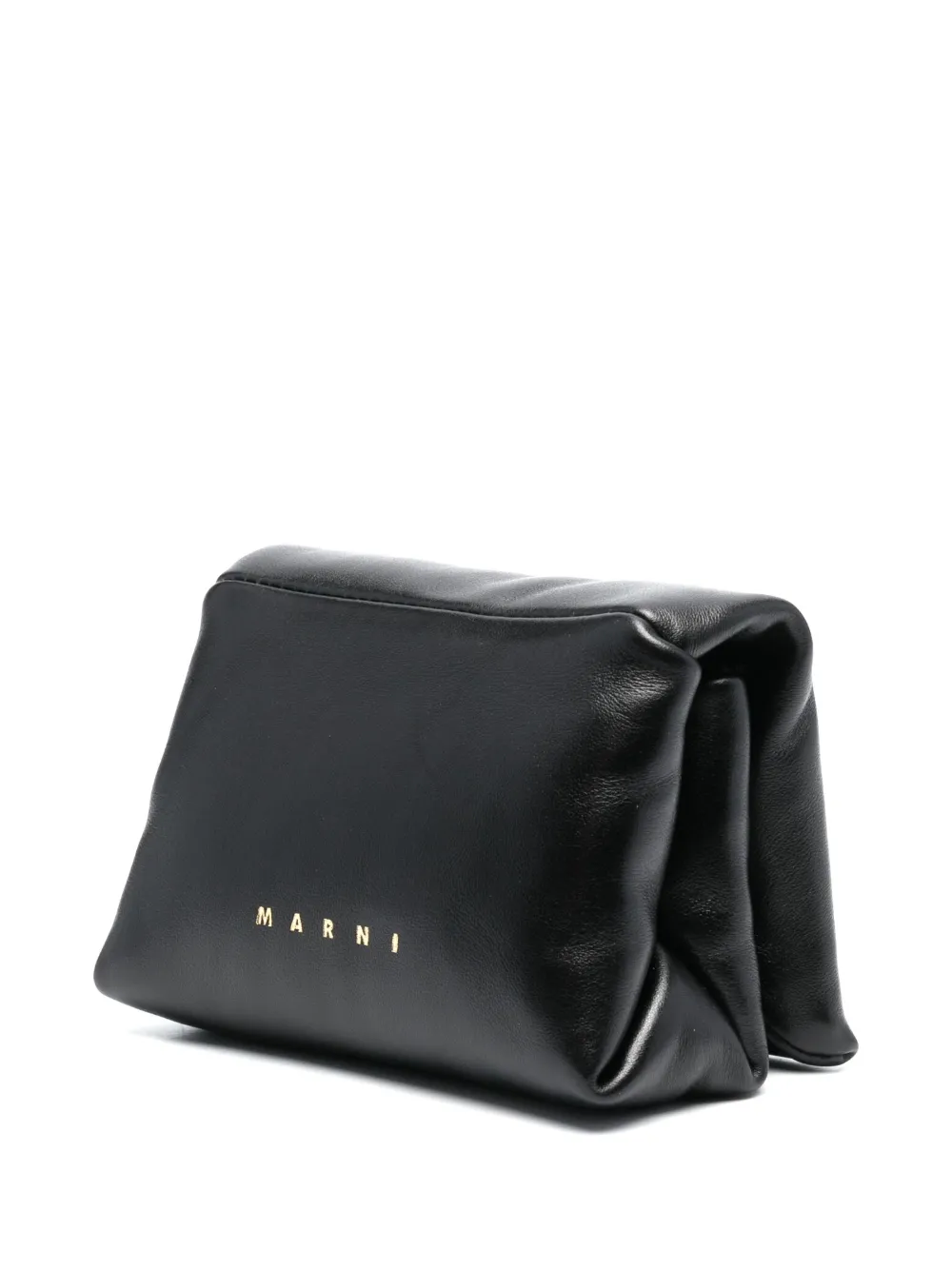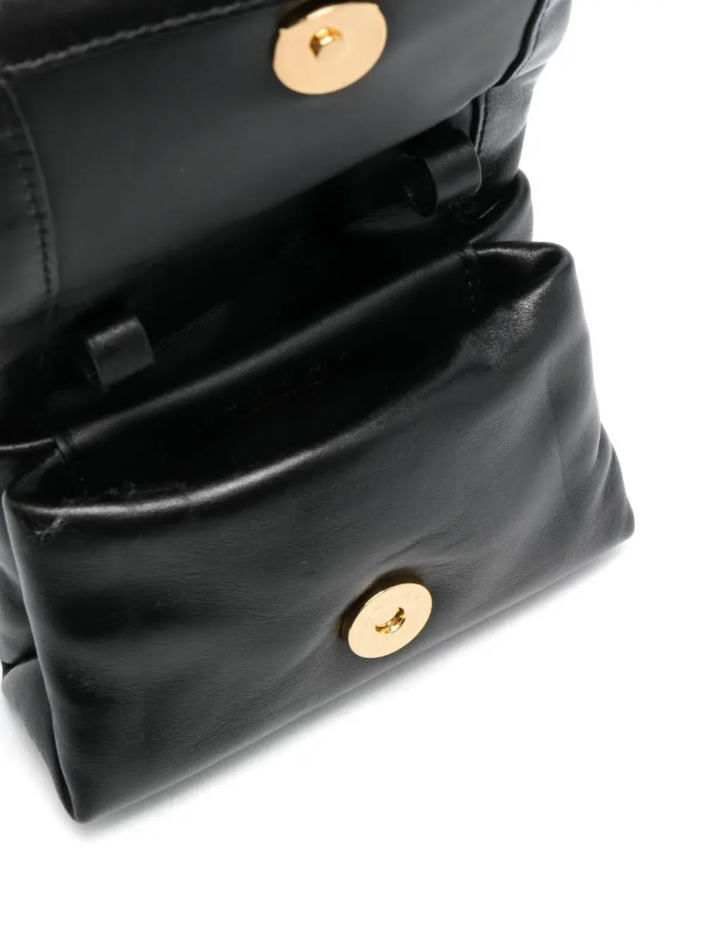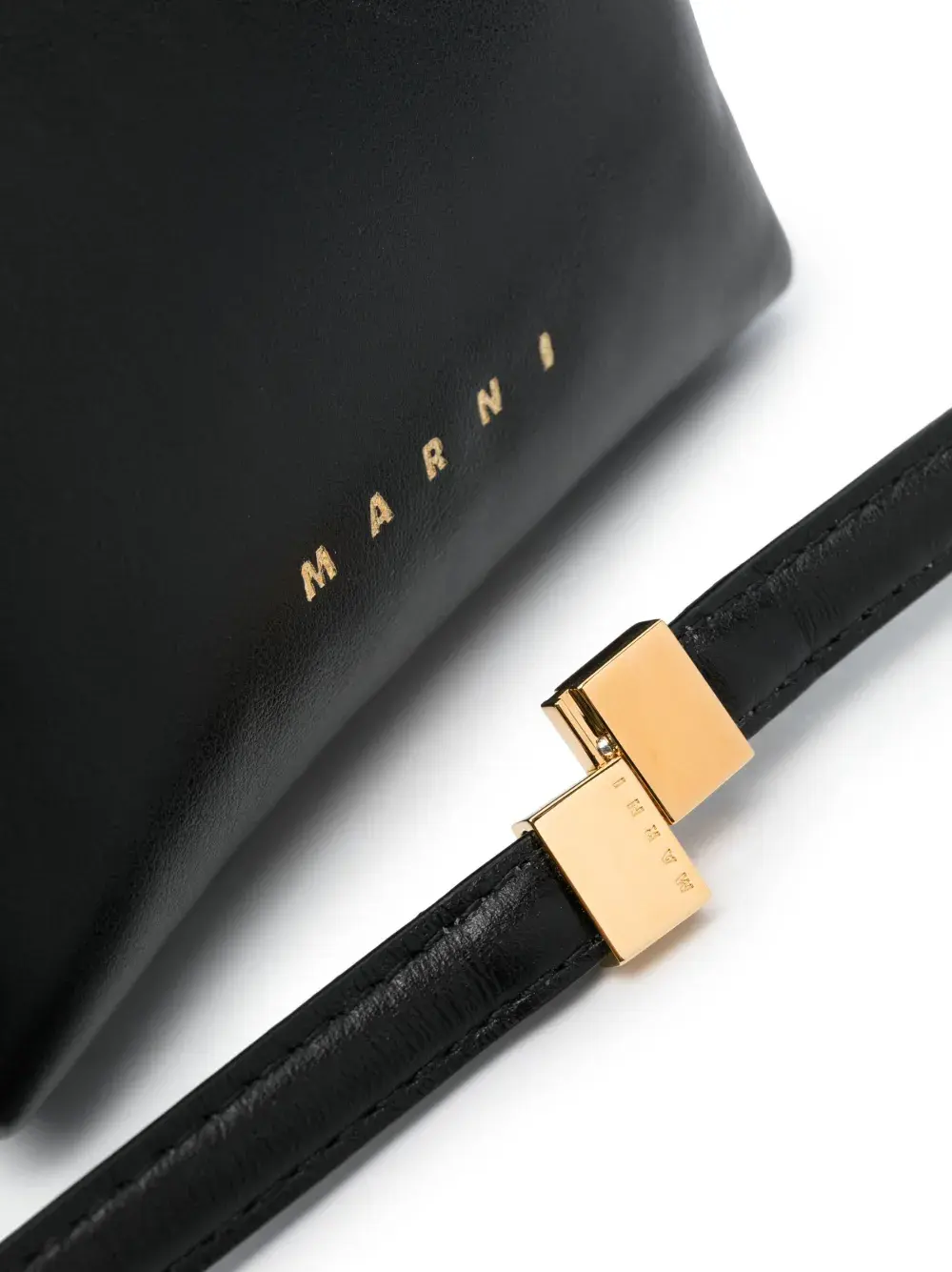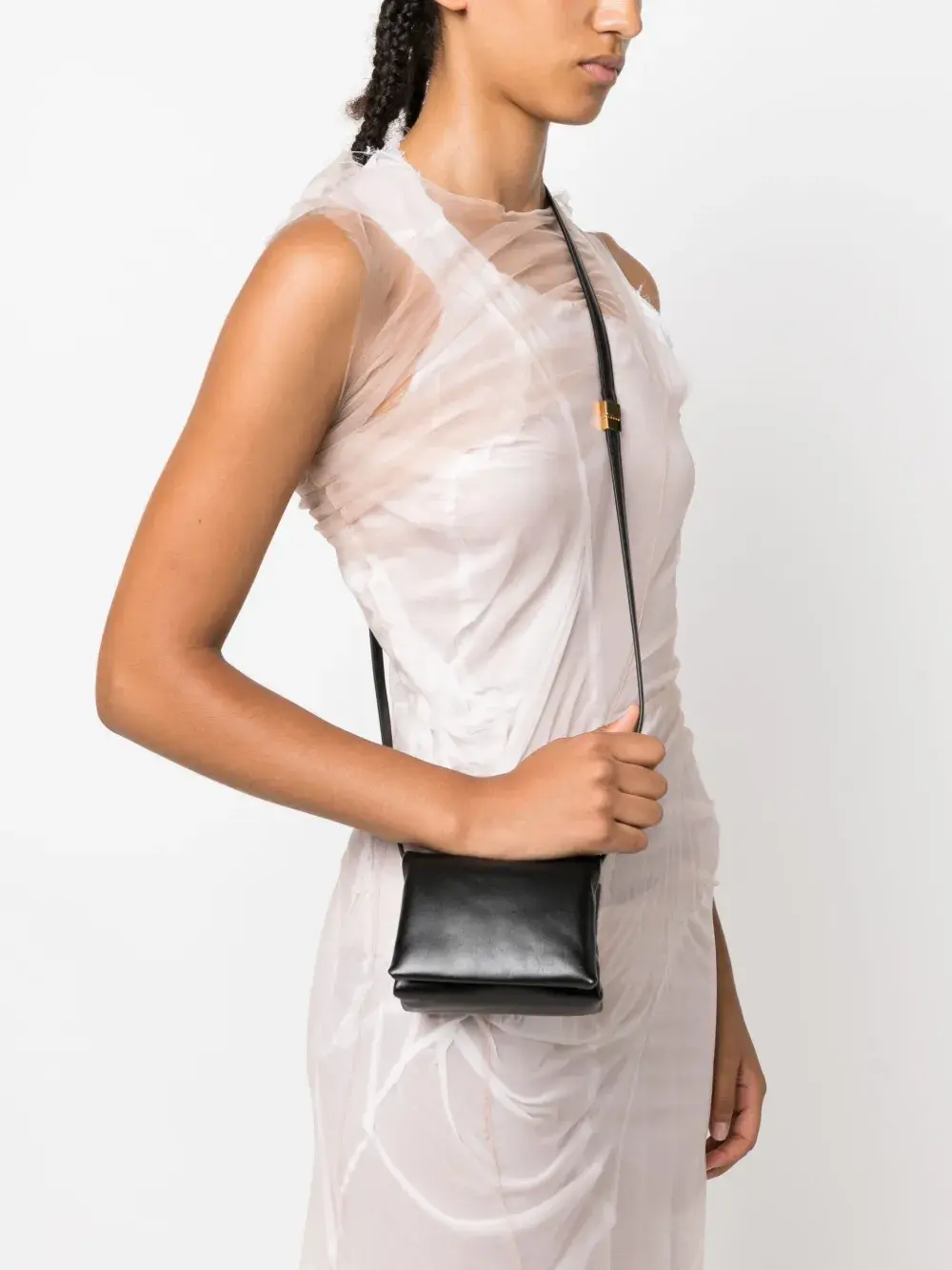 Черный, телячья кожа, гладкая текстура кожи, откидной клапан на магните, несколько отделений, тисненый логотип внутри и съемный ремень на плечо.