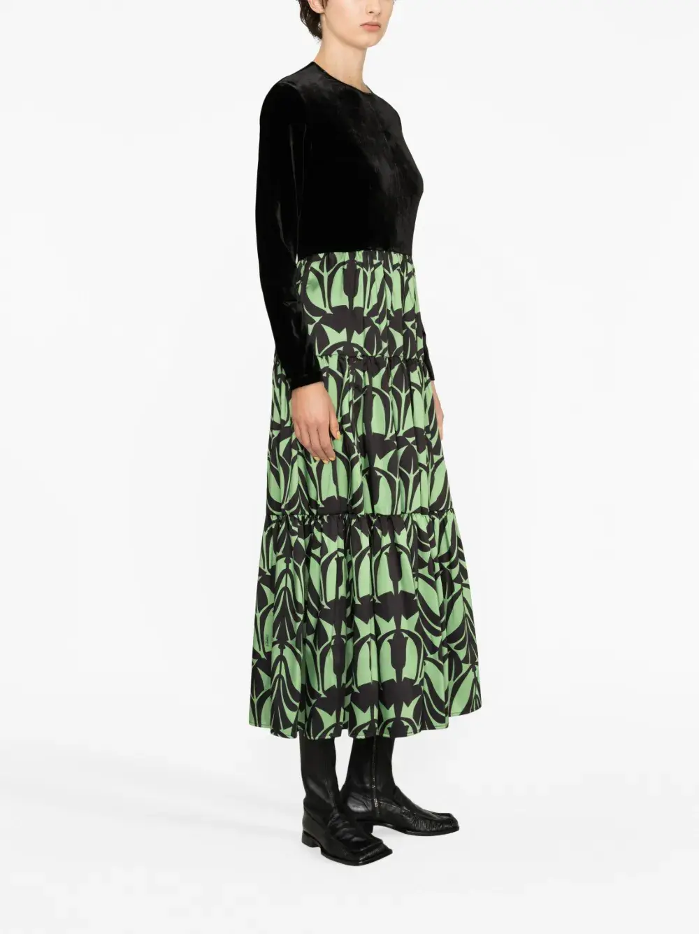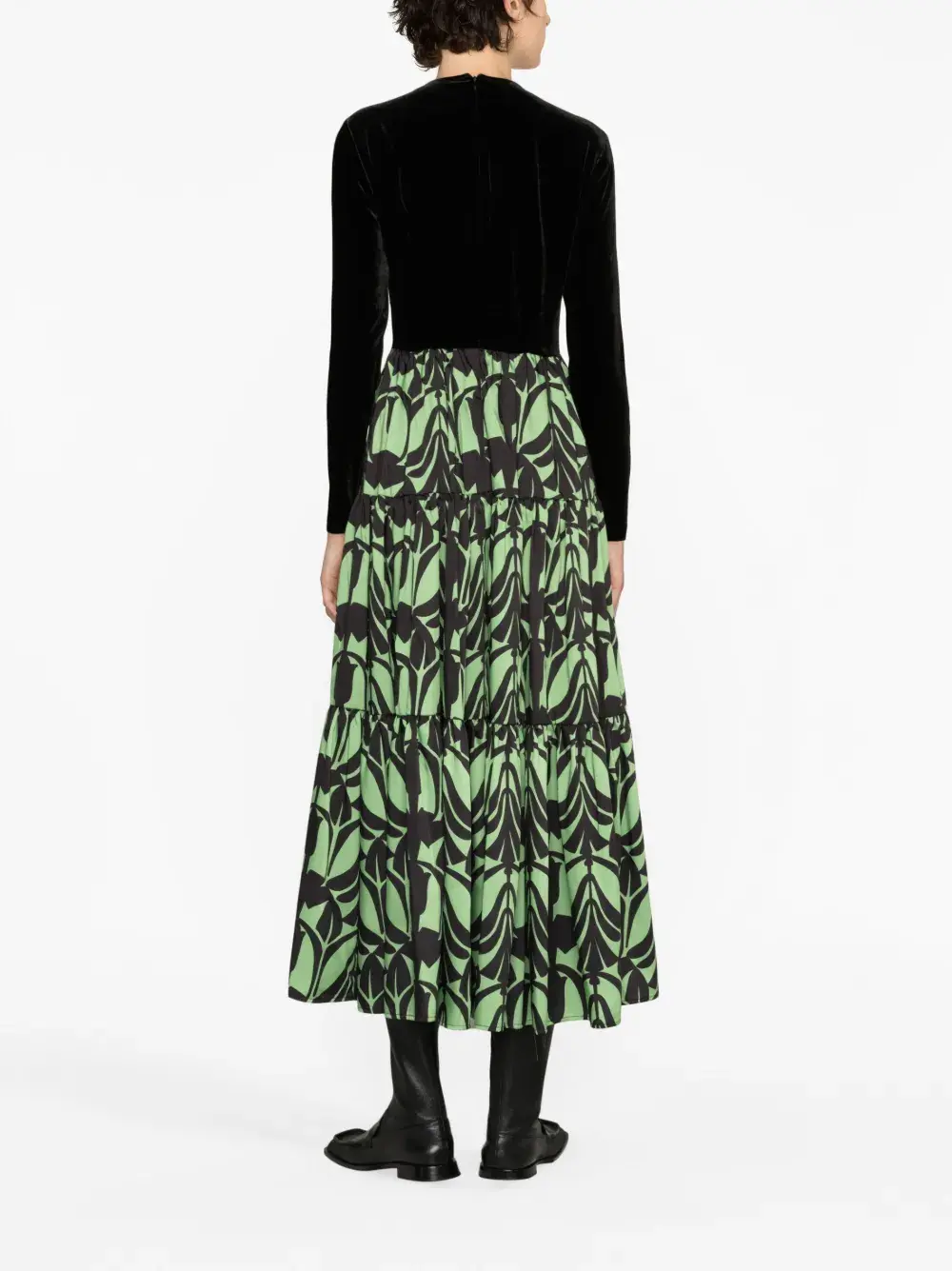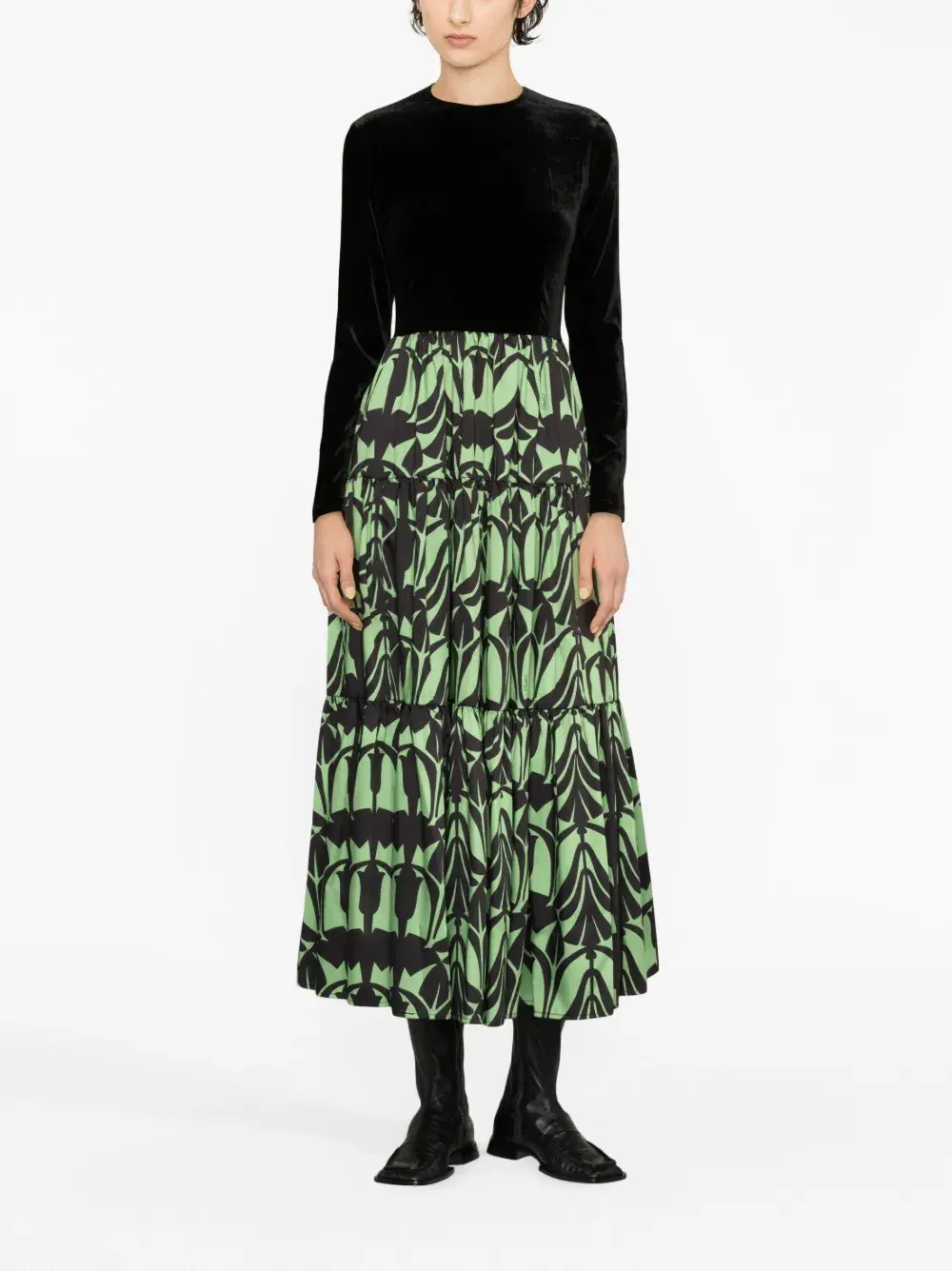 Черный, пастельно-зеленый, бархатистое покрытие, сплошной графичный принт, круглый вырез, длинные рукава, потайная застежка на молнии сзади, юбка А-образного силуэта, ярусная юбка и высота по щиколотку.