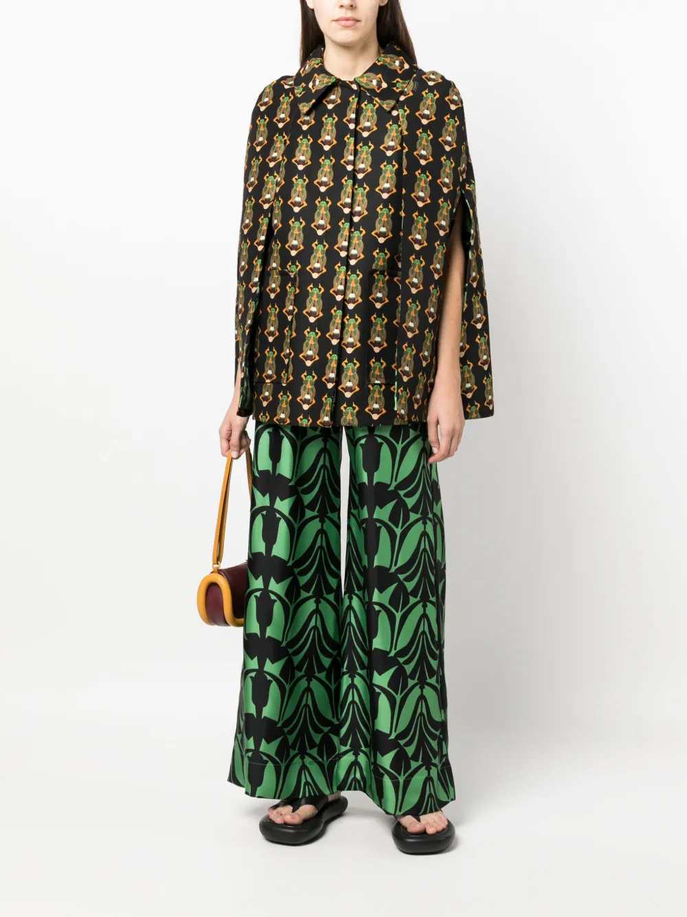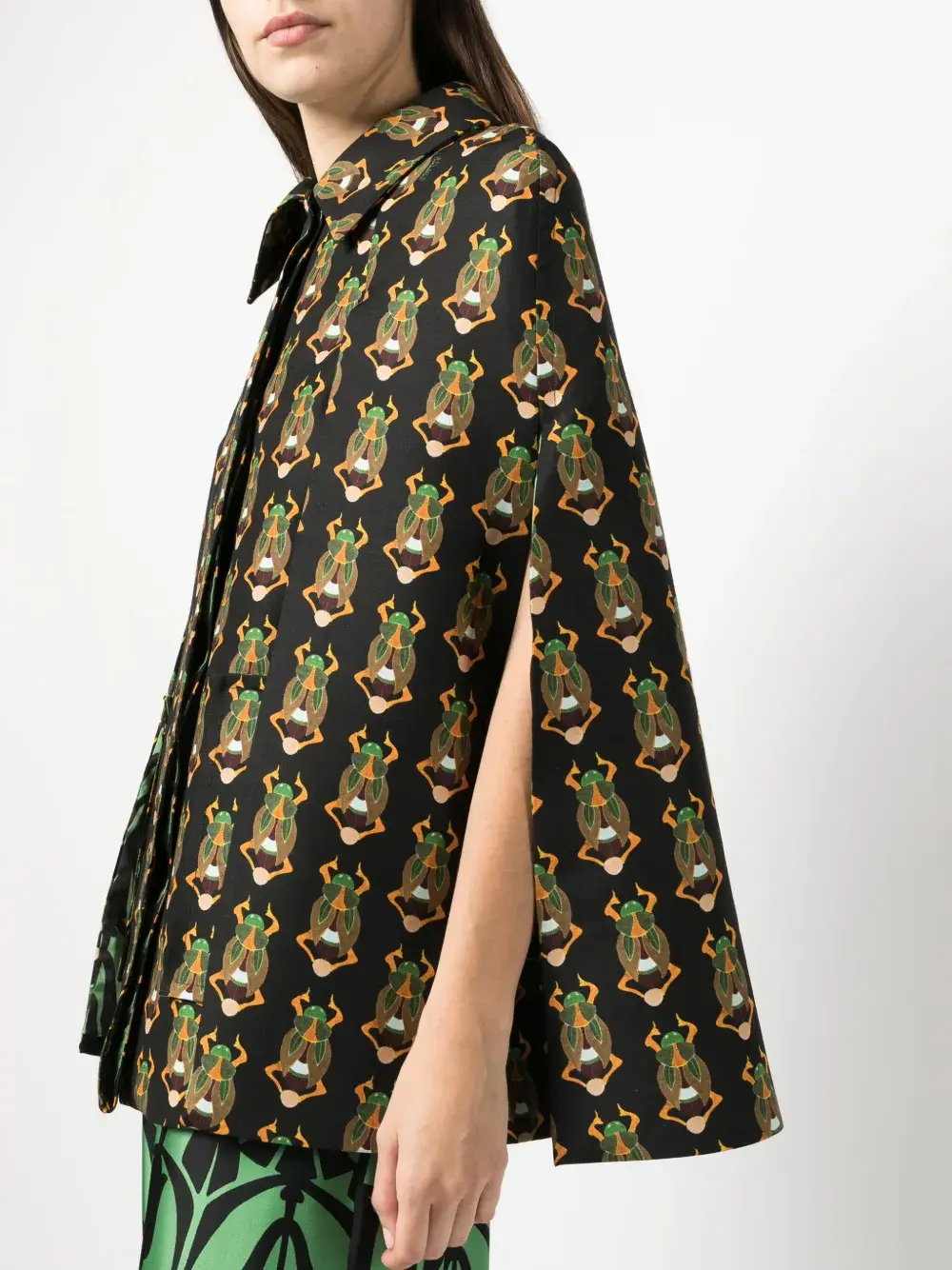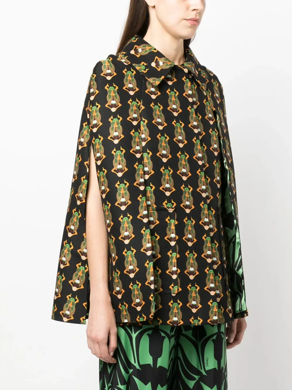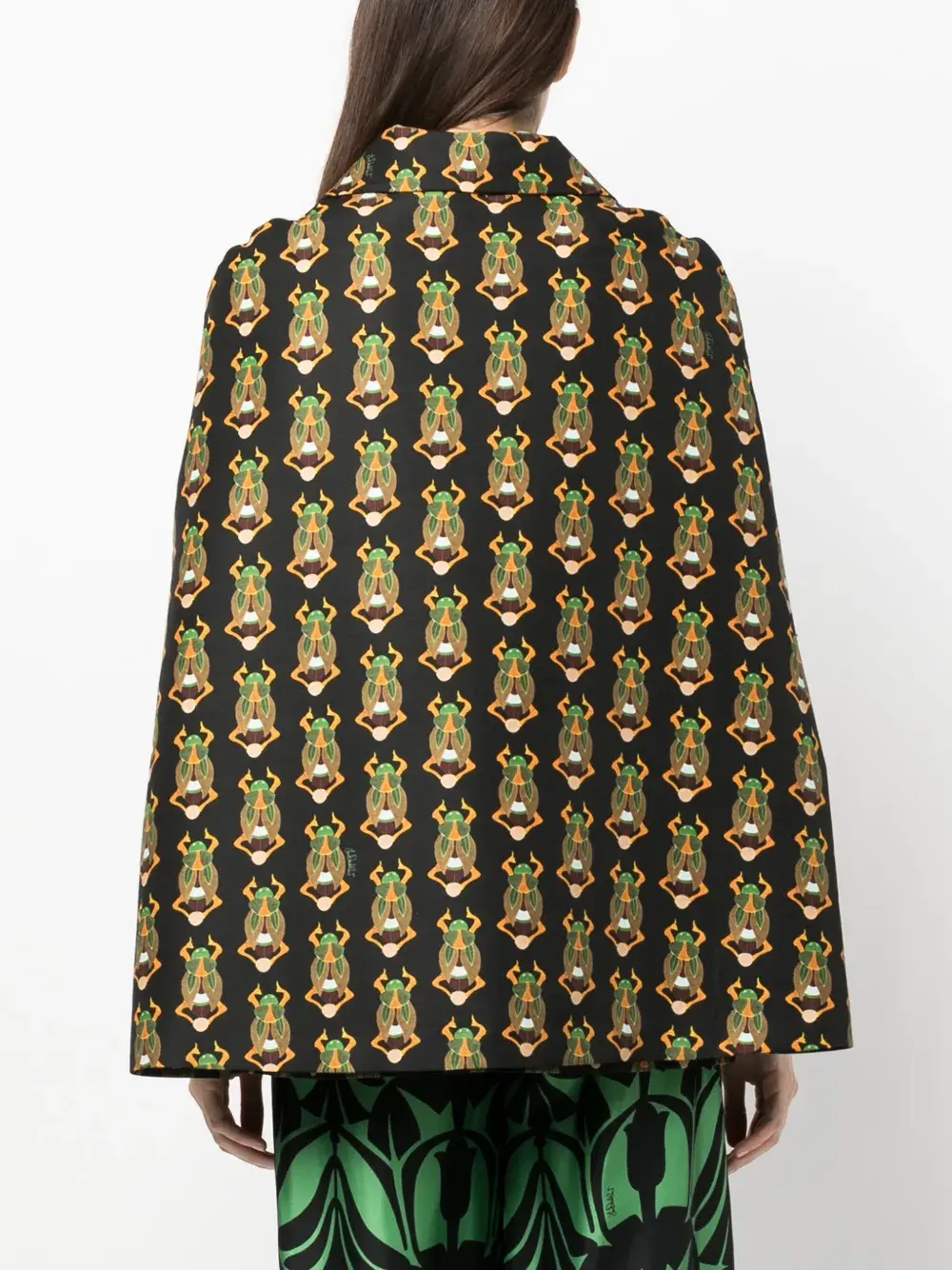 Черный/разноцветный, смесовая шерсть, сплошной графичный принт, классический воротник, застежка на пуговицах спереди, боковые разрезы и боковой карман.