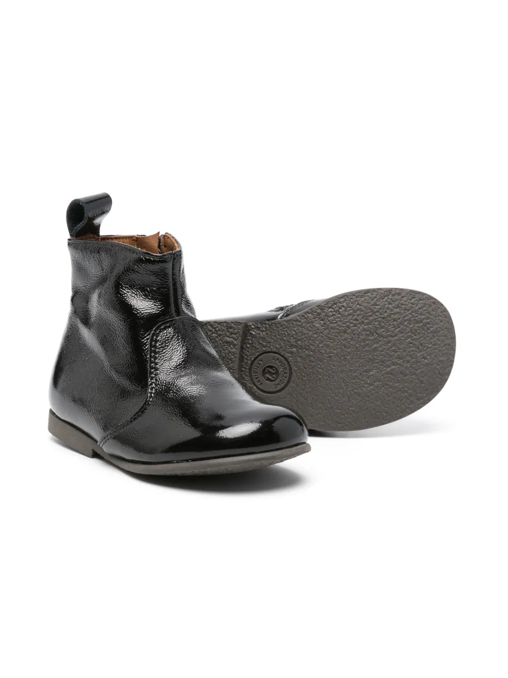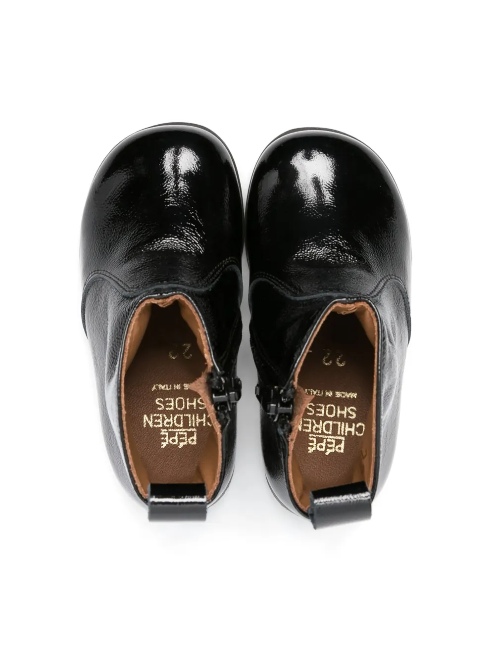Лакированная отделка, строчка в тон, петля для подтягивания сзади, закругленный носок, застежка на молнии сбоку, кожаная стелька с логотипом, плоская резиновая подошва и высота по щиколотку.