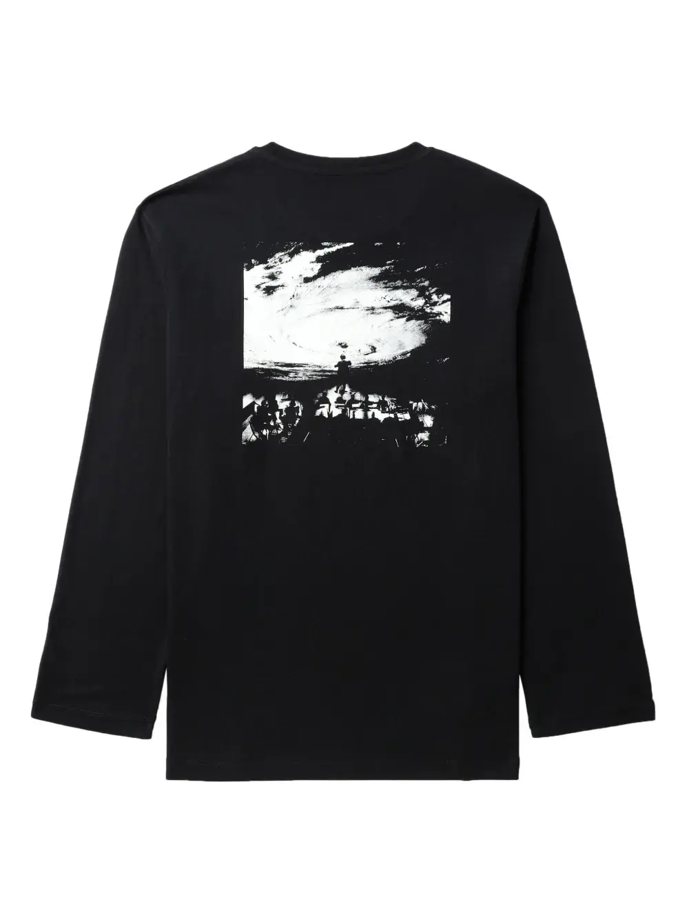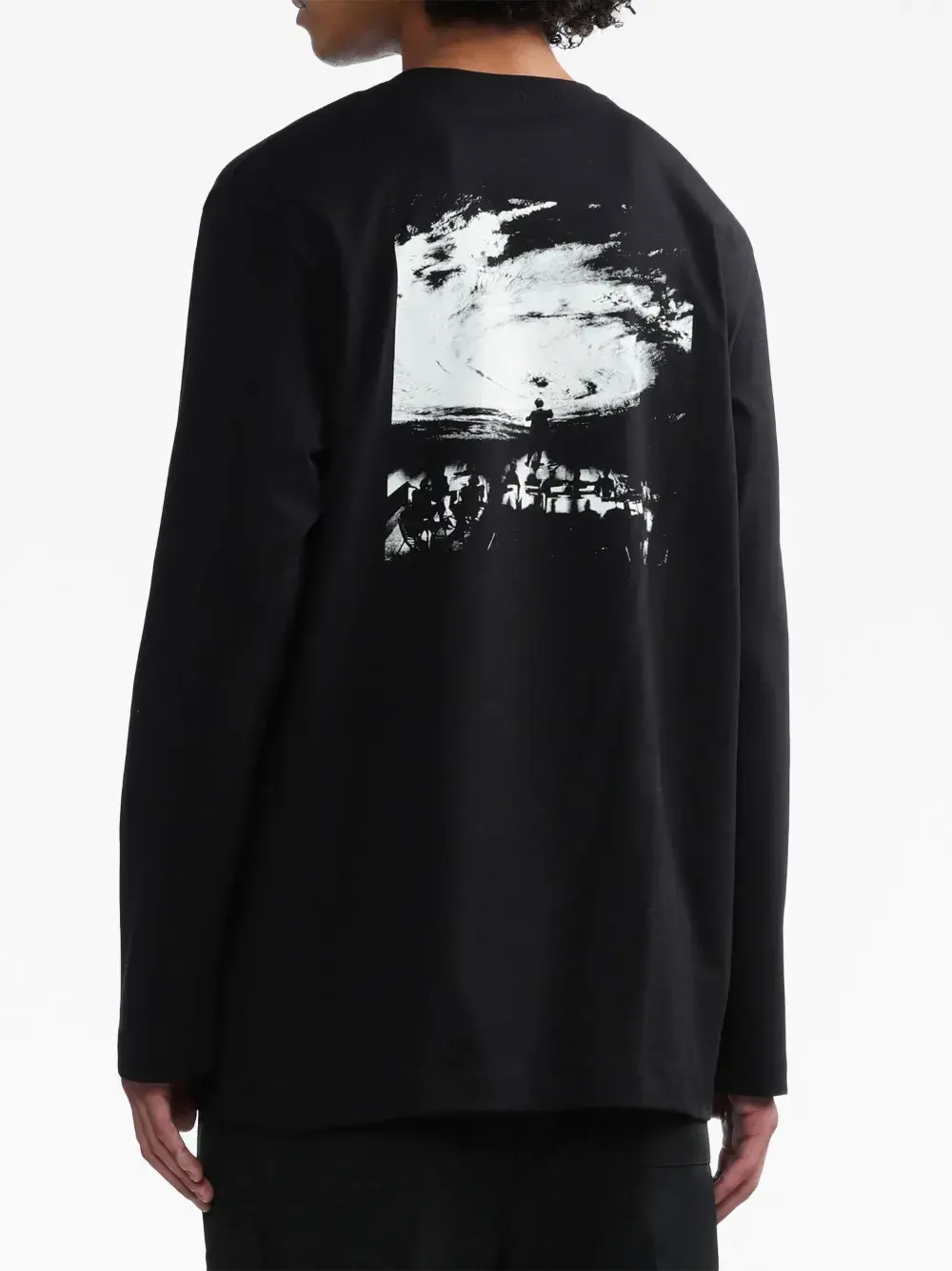 Черный, белый, хлопок, графичный принт на спине, логотип спереди, круглый вырез, длинные рукава и прямой подол.