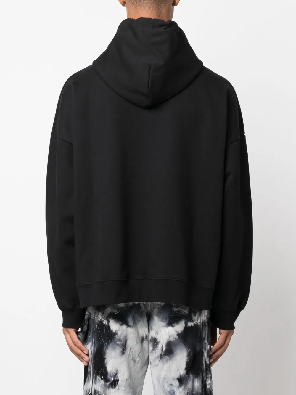 Черный, хлопок, логотип-аппликация, затягивающийся на шнурок капюшон, карман-муфта, приспущенные плечи и длинные рукава.
