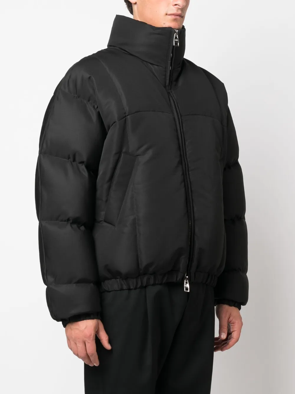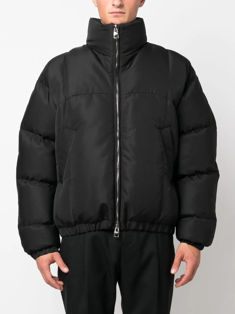 Черный, дутый материал, вышитый логотип сзади, воротник-труба, длинные рукава, двусторонняя молния сзади, два вшитых кармана по бокам, эластичные манжеты и прямой подол.