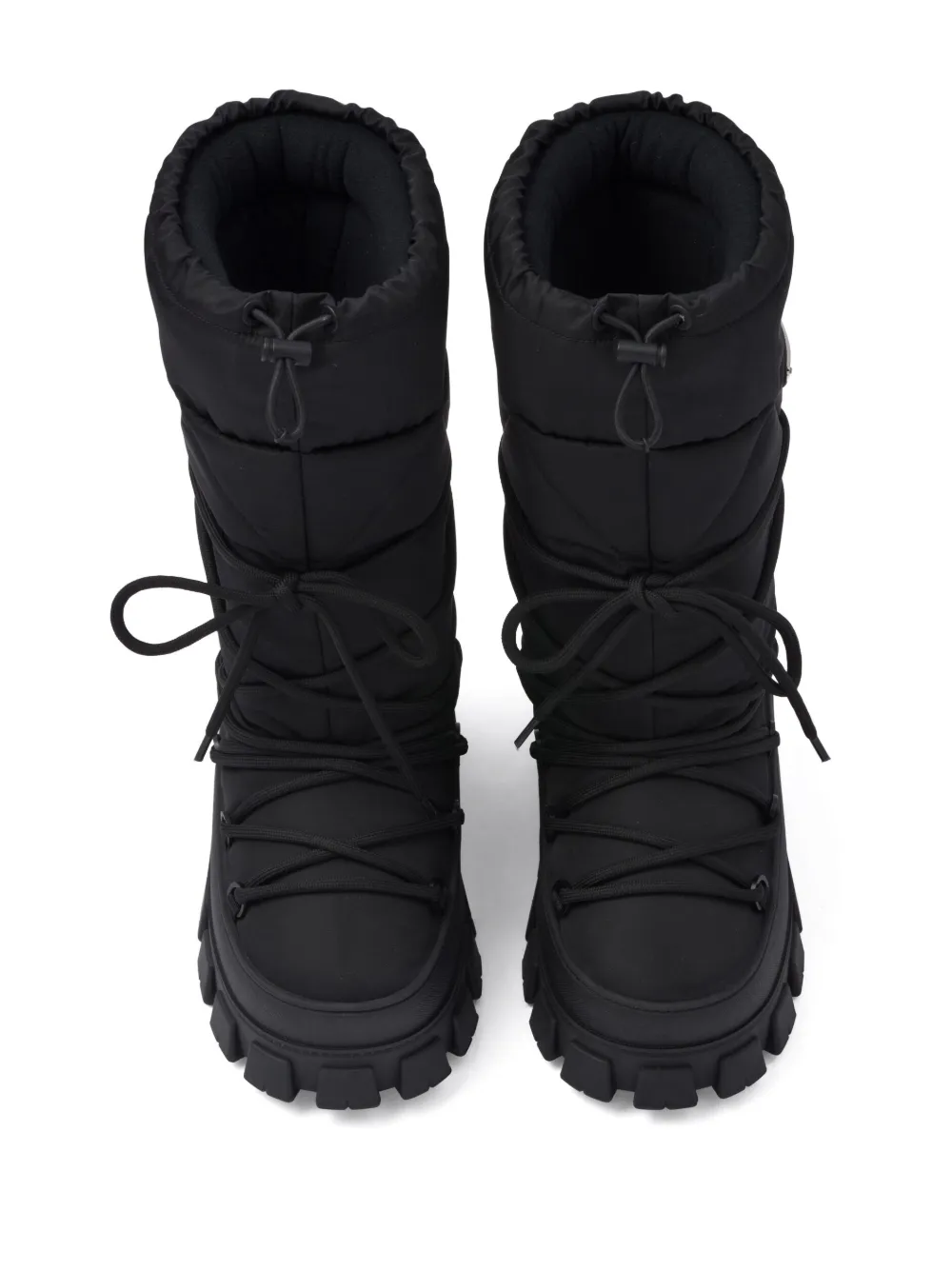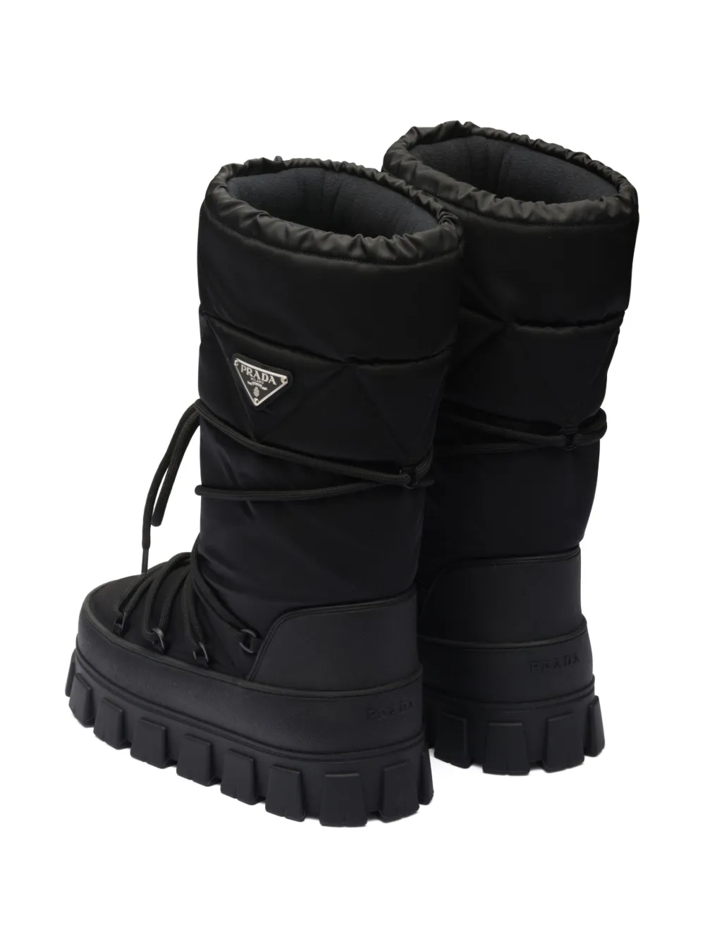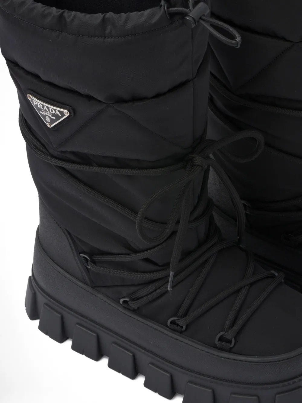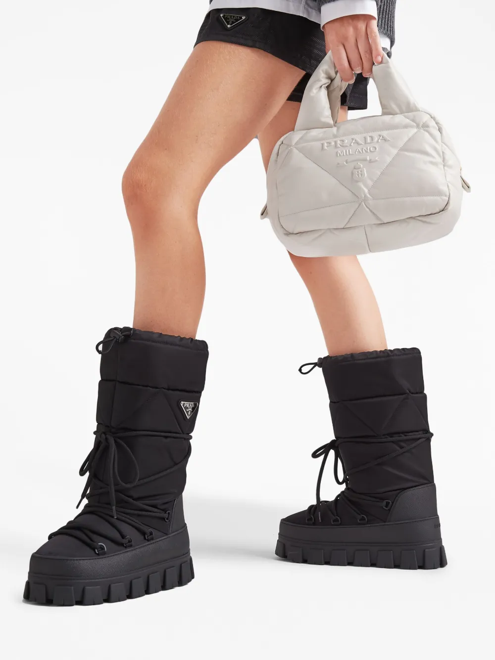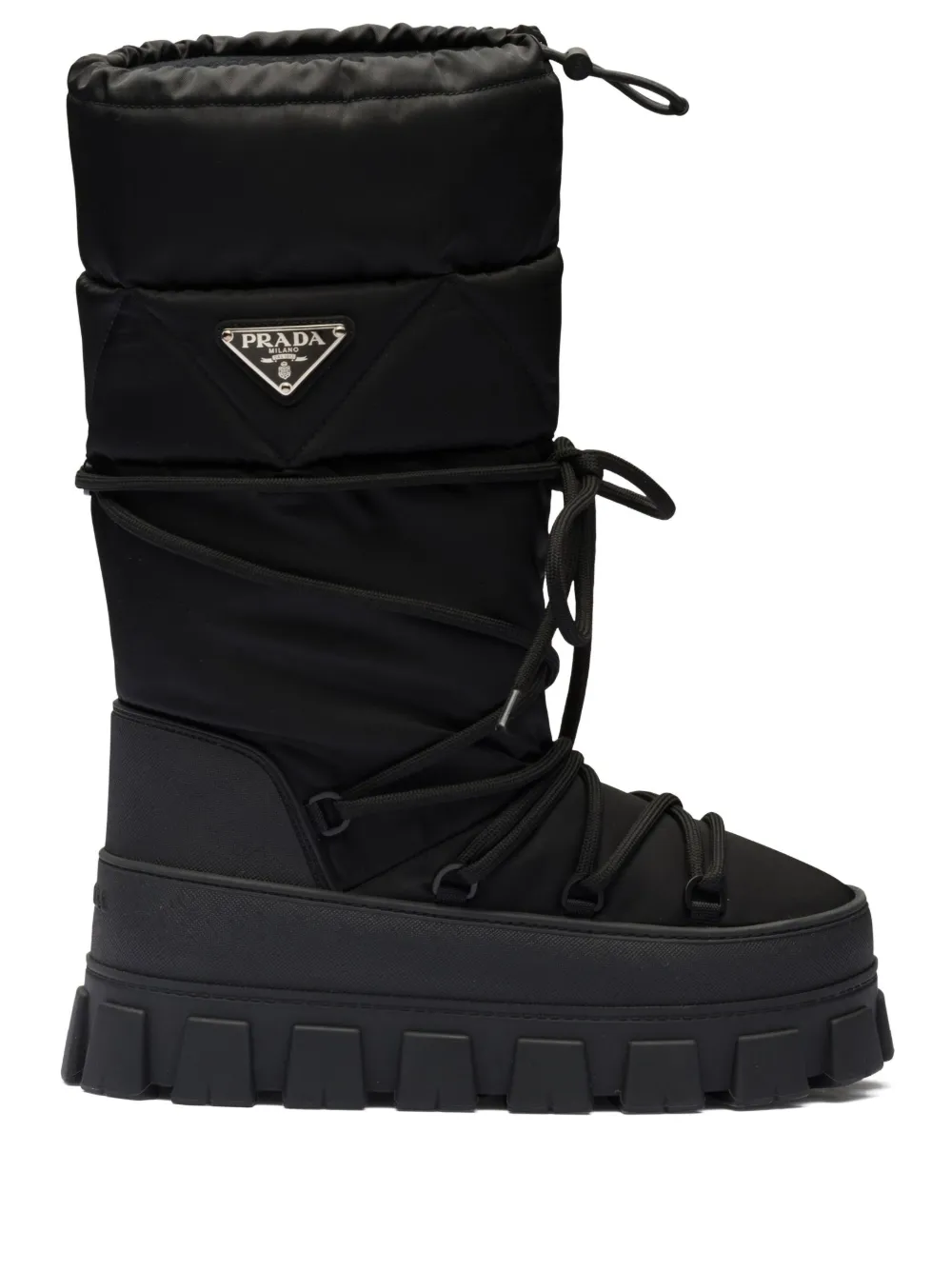 Черный, переработанный нейлон, телячья кожа, дутый материал, треугольный эмалированный логотип, резиновый носок, длина до середины икры, закругленный носок, кулиска, шнуровка спереди и массивная резиновая подошва c протектором.