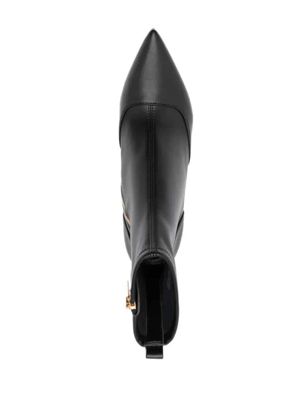 Черный, телячья кожа, гладкая текстура кожи, петля для подтягивания сзади, золотистая фурнитура, заостренный носок, застежка на молнии сбоку и высокий скульптурный каблук.