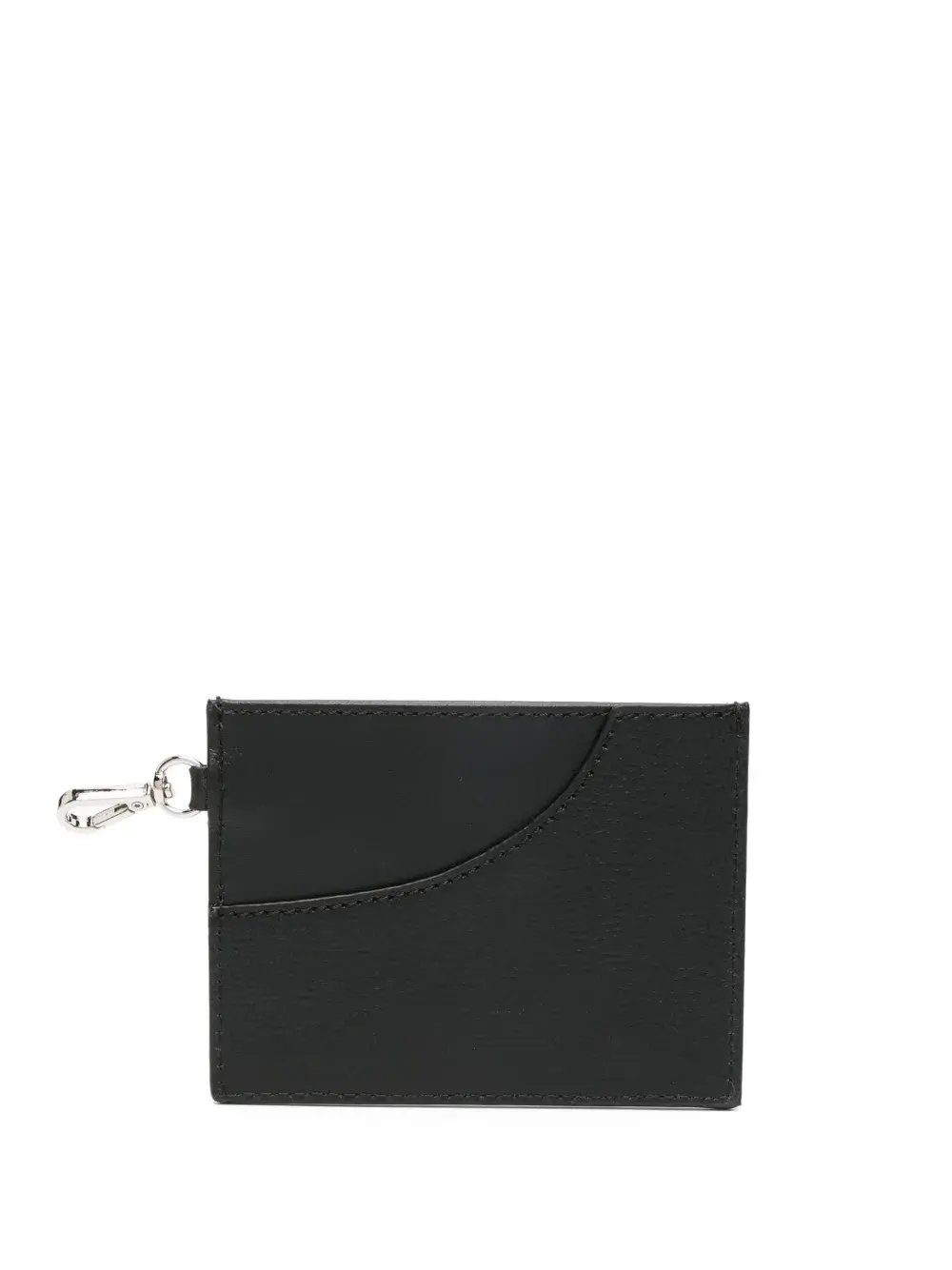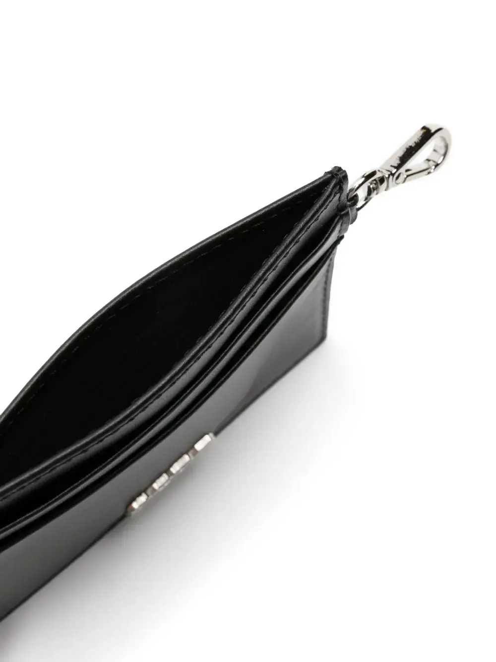 Телячья кожа, металлический логотип, отделения для карт и серебристая фурнитура.