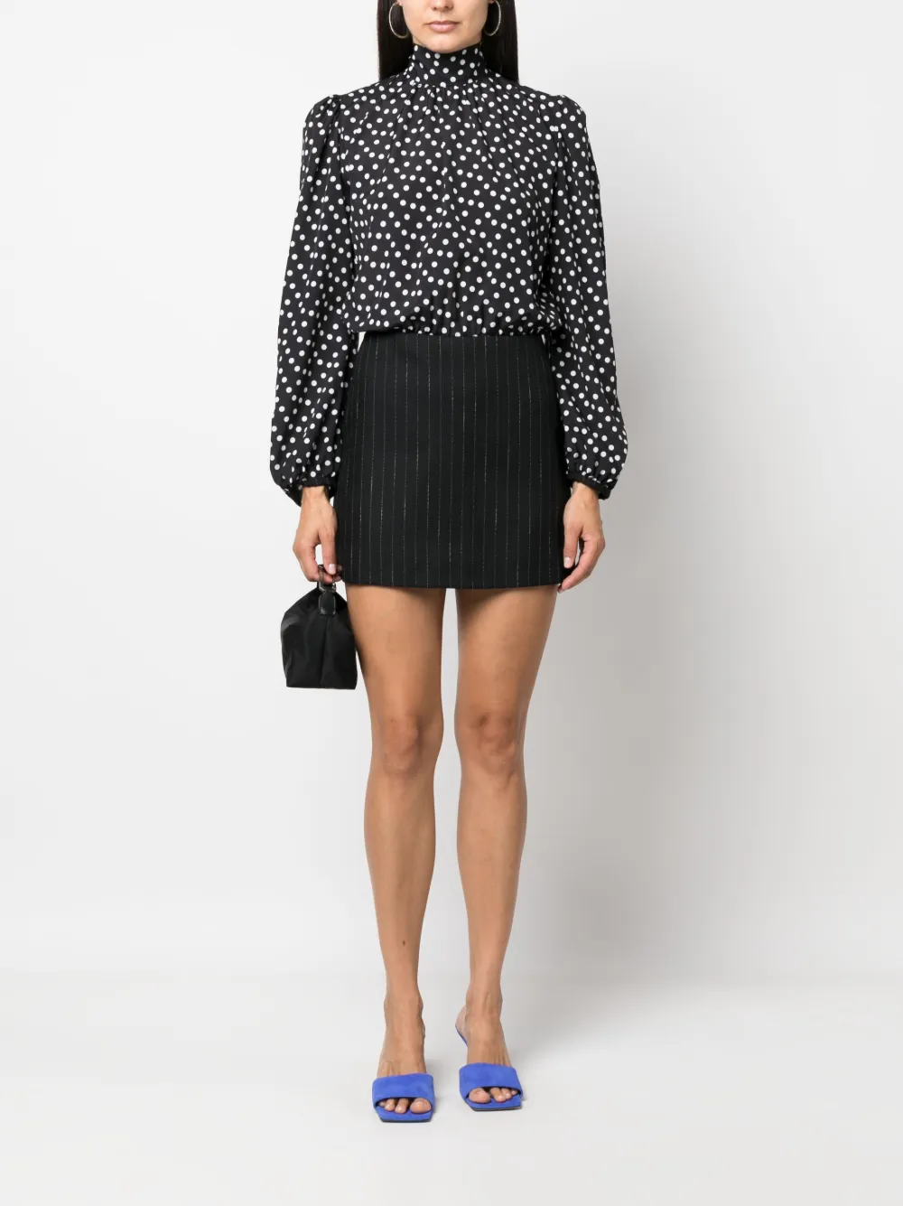 Черный, принт в горох, узор в тонкую полоску, высокий воротник, застежка на завязке сзади, открытая спина, объемные рукава, потайная застежка на молнии сзади, прямой подол и длина до бедер.