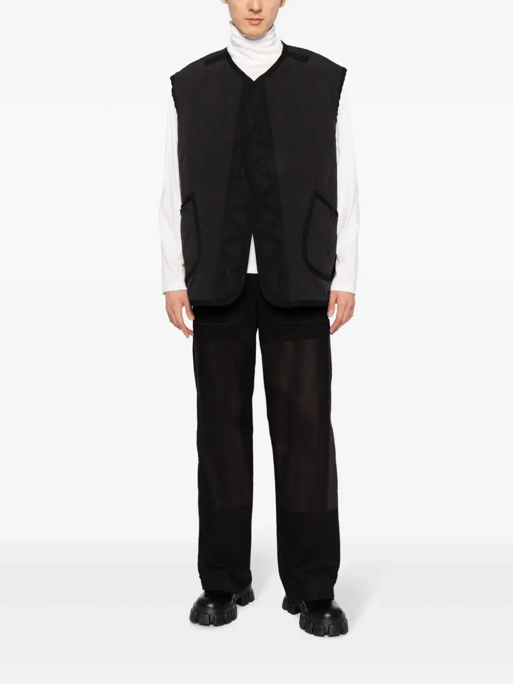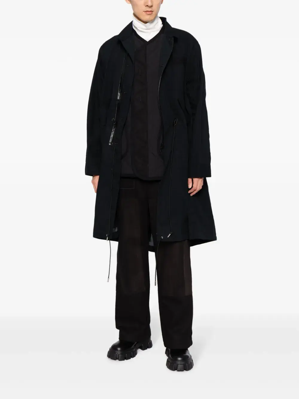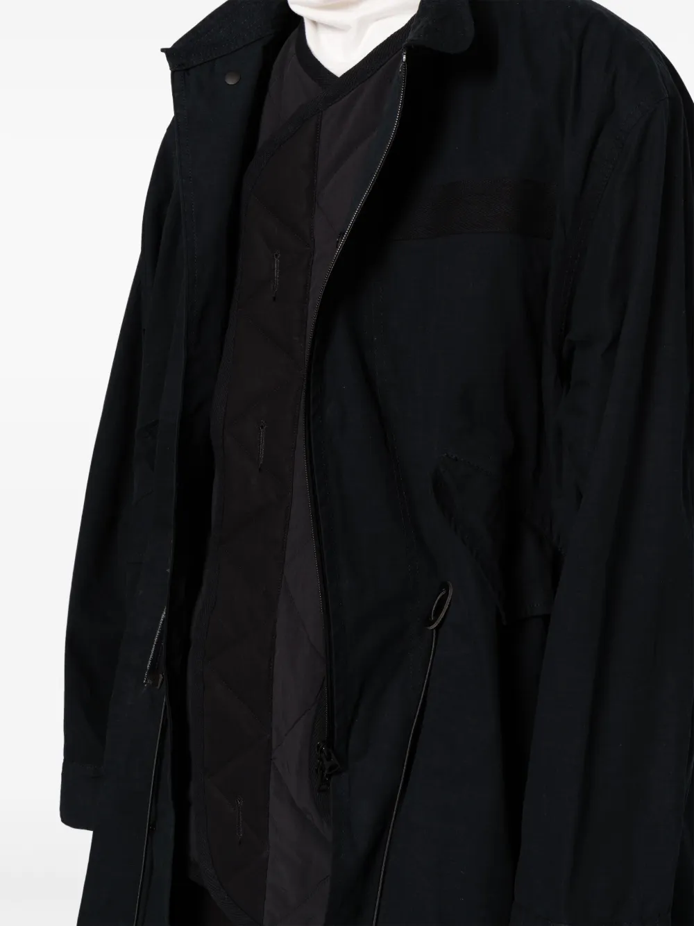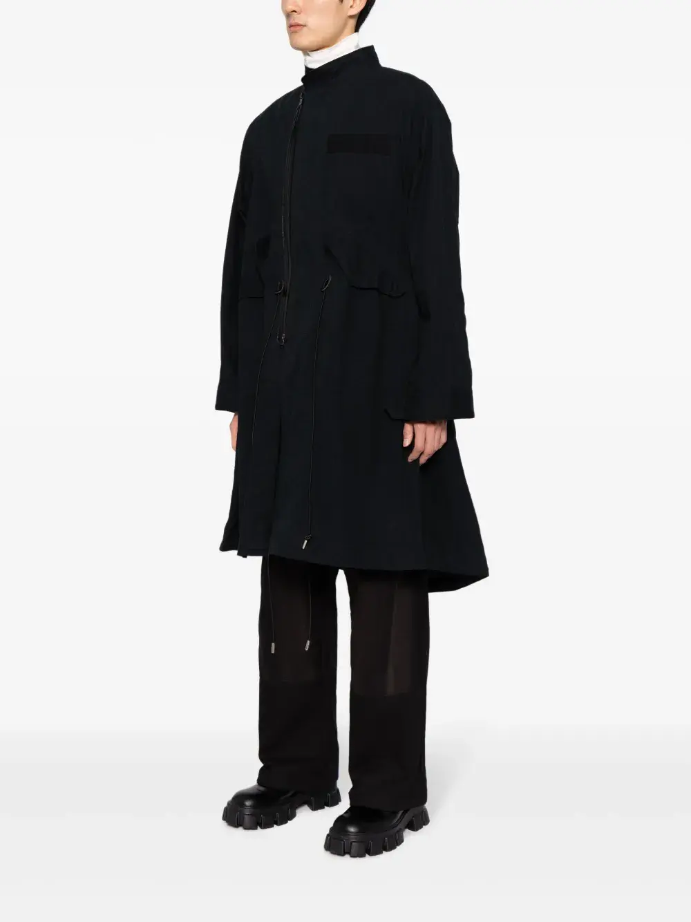 Черный, воротник-труба, застежка на молнии спереди, кулиска на талии, два передних кармана с клапанами, длинные рукава и закругленный подол.