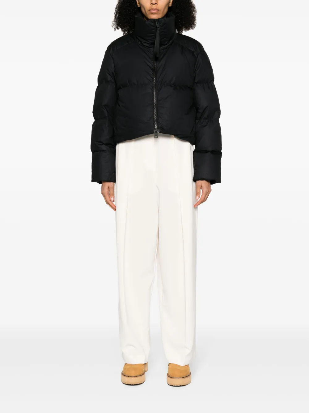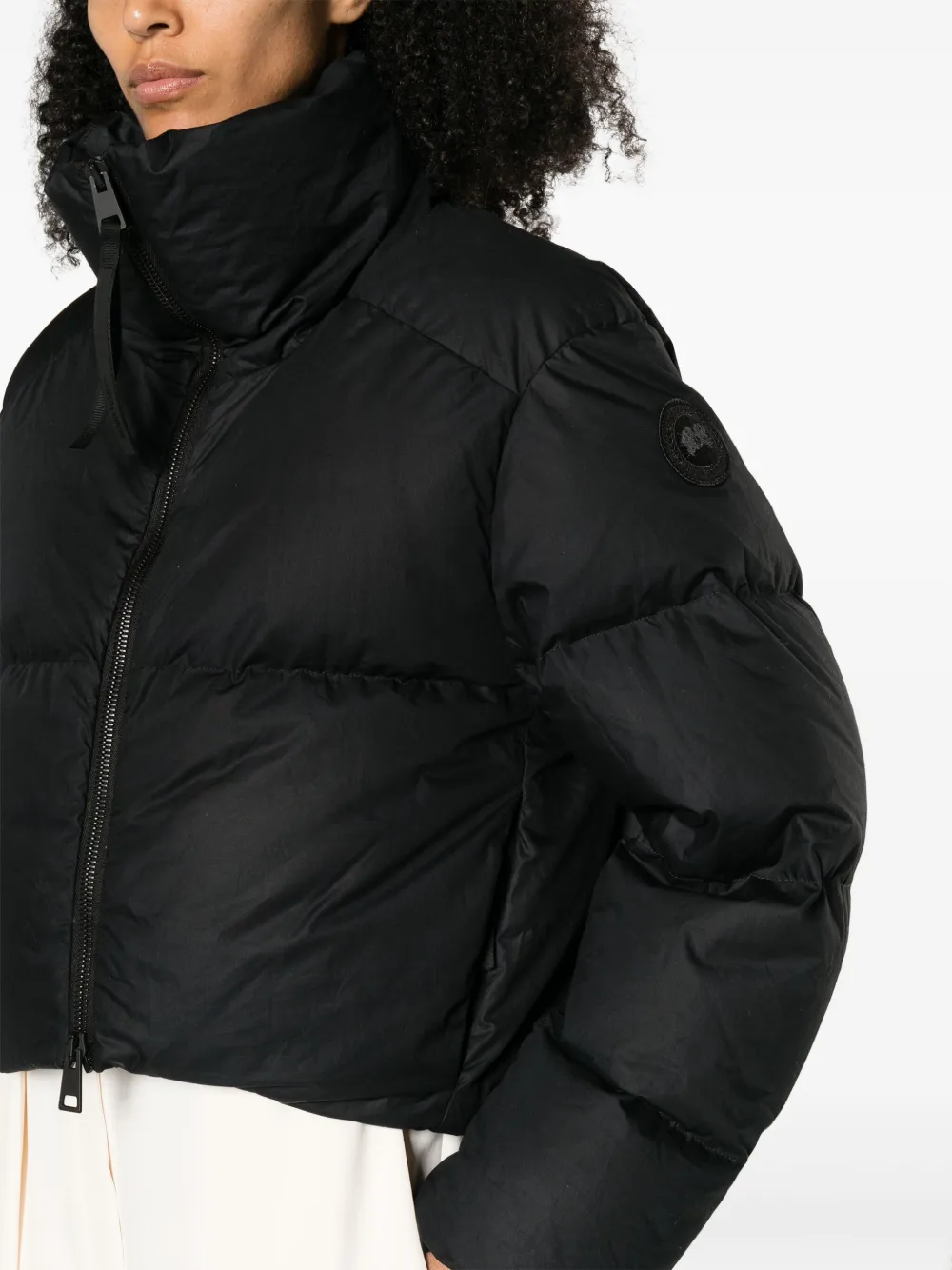 Черный, хлопок, наполнитель из смеси пуха и пера, водоотталкивающий материал, матовое покрытие, дутый материал, нашивка с логотипом на рукаве, воротник-труба, двусторонняя молния спереди, длинные рукава, манжеты в рубчик, два кармана на молнии по бокам, внутренний карман с клапаном, укороченная длина и подол с кулиской. На этой вещи есть штамп, подтверждающий ее подлинность.