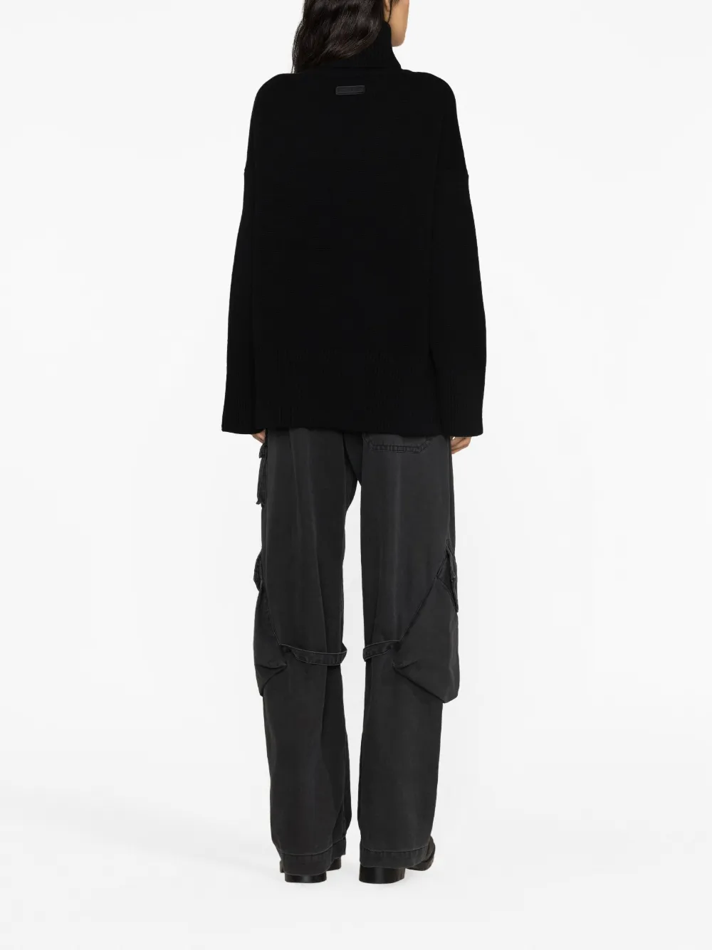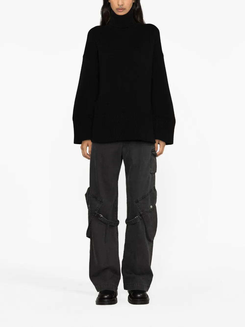 Черный, смесовый кашемир, трикотажный материал, высокий воротник, приспущенные плечи и длинные рукава.