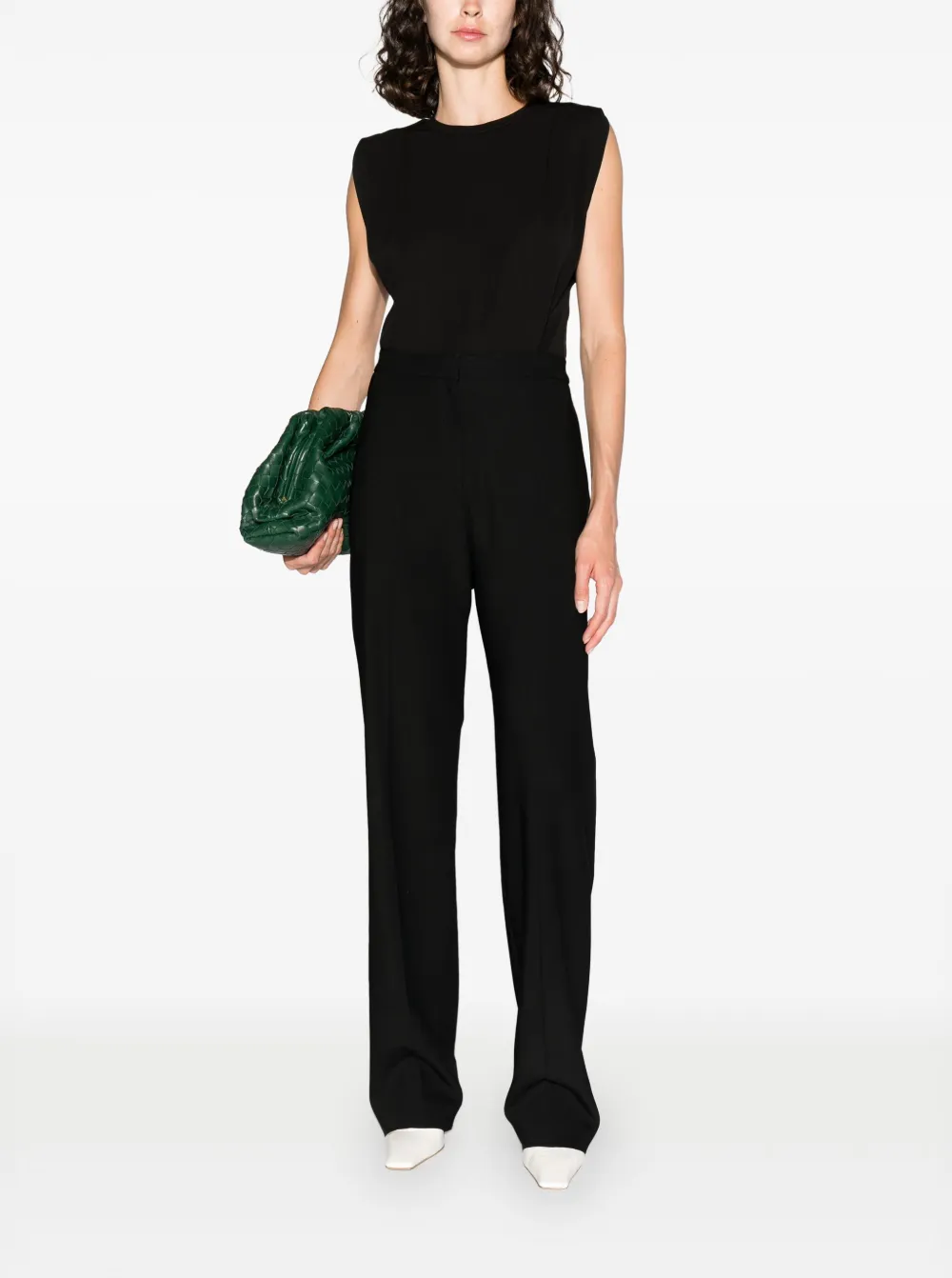 Черный, складки, круглый вырез, без рукавов и закругленный подол.