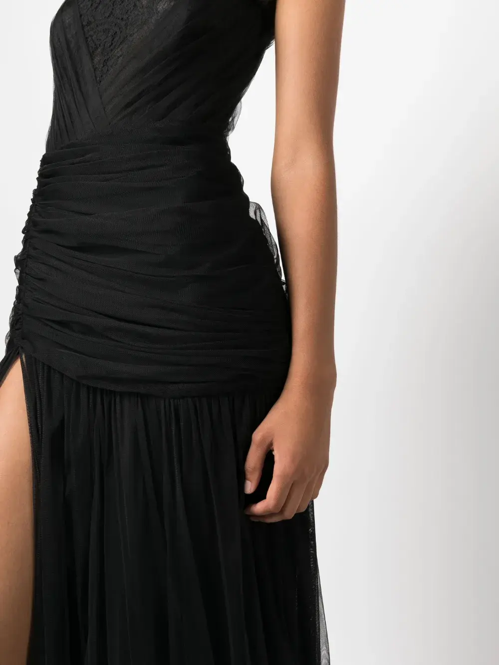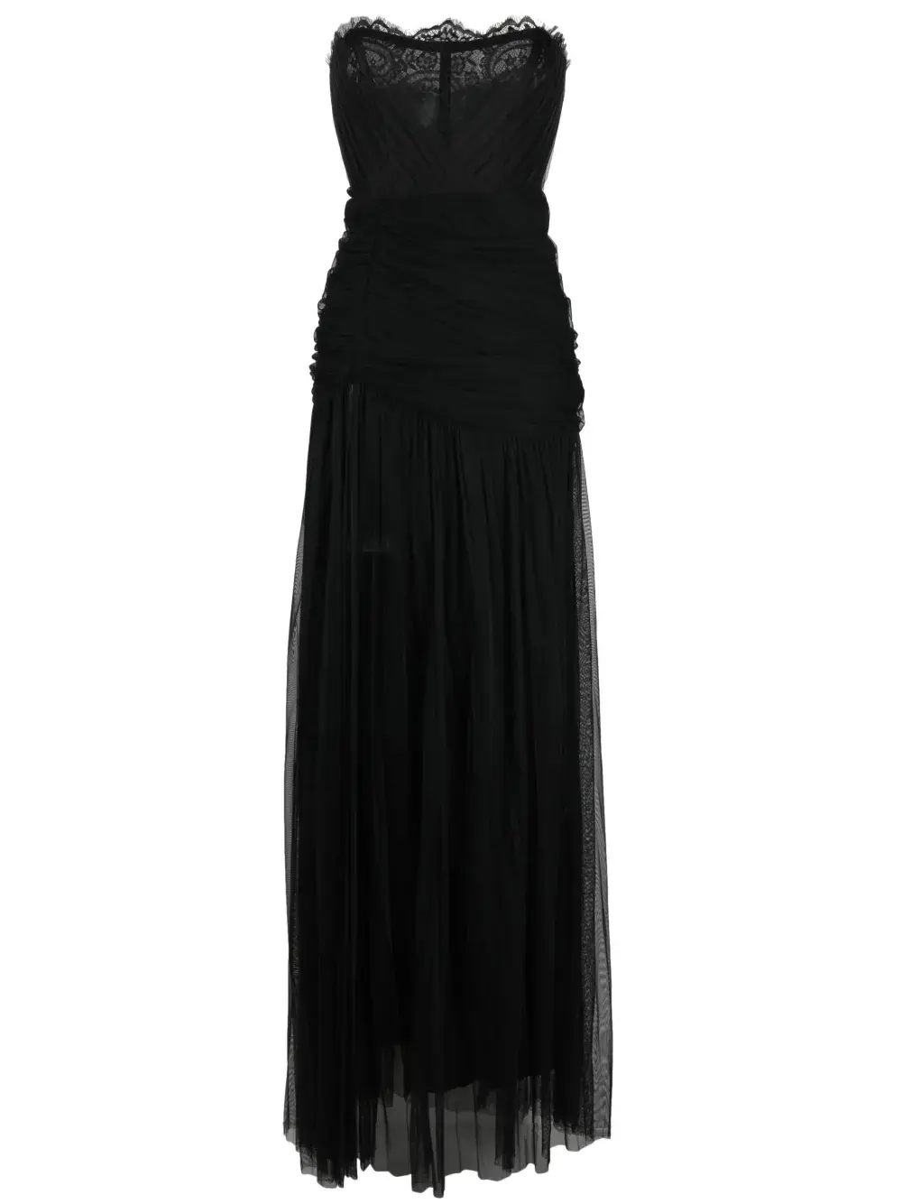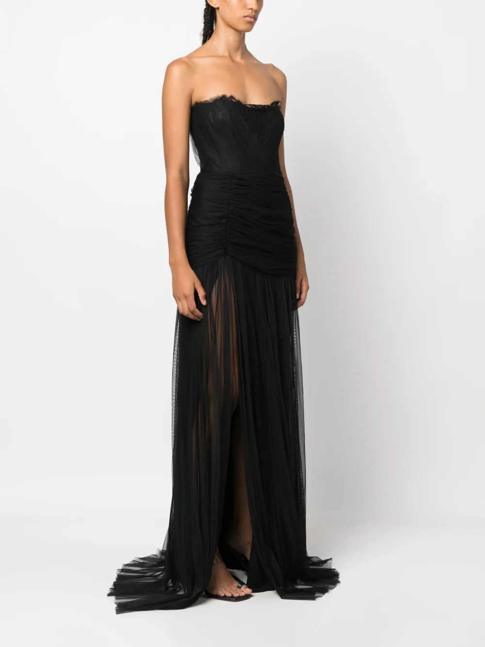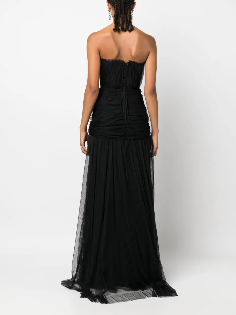 Черный, верхний слой из тюля, верх в корсетном стиле, складки, без бретелей, заниженная талия, боковой разрез, шнуровка сзади и расклешенный крой.