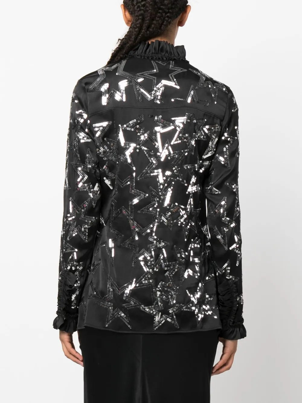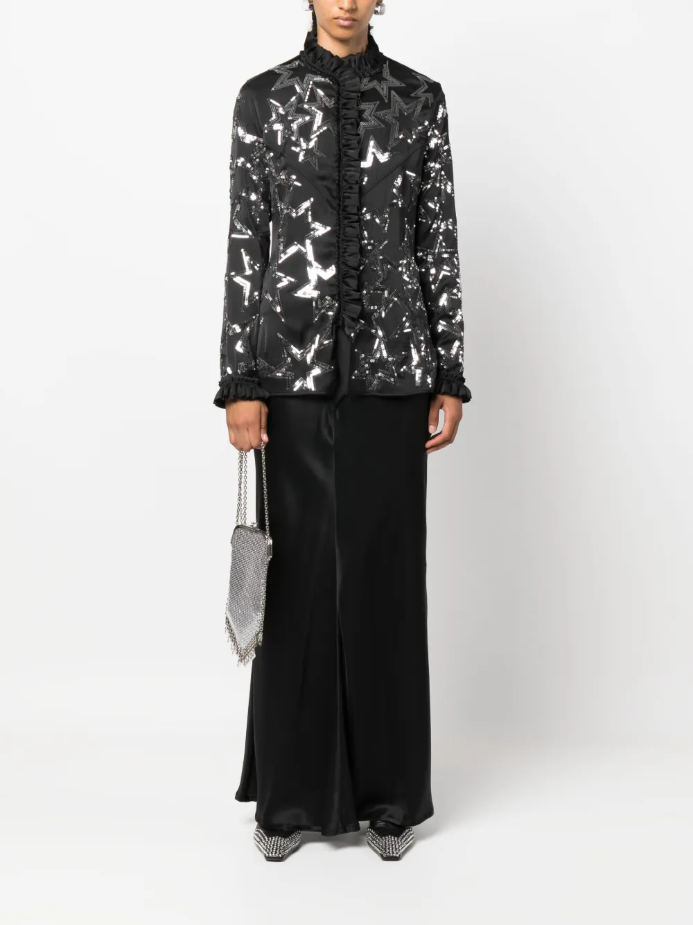 Черный, вышитые звезды, украшение из пайеток, отделка с оборками, длинные рукава, манжеты с оборками и прямой подол.