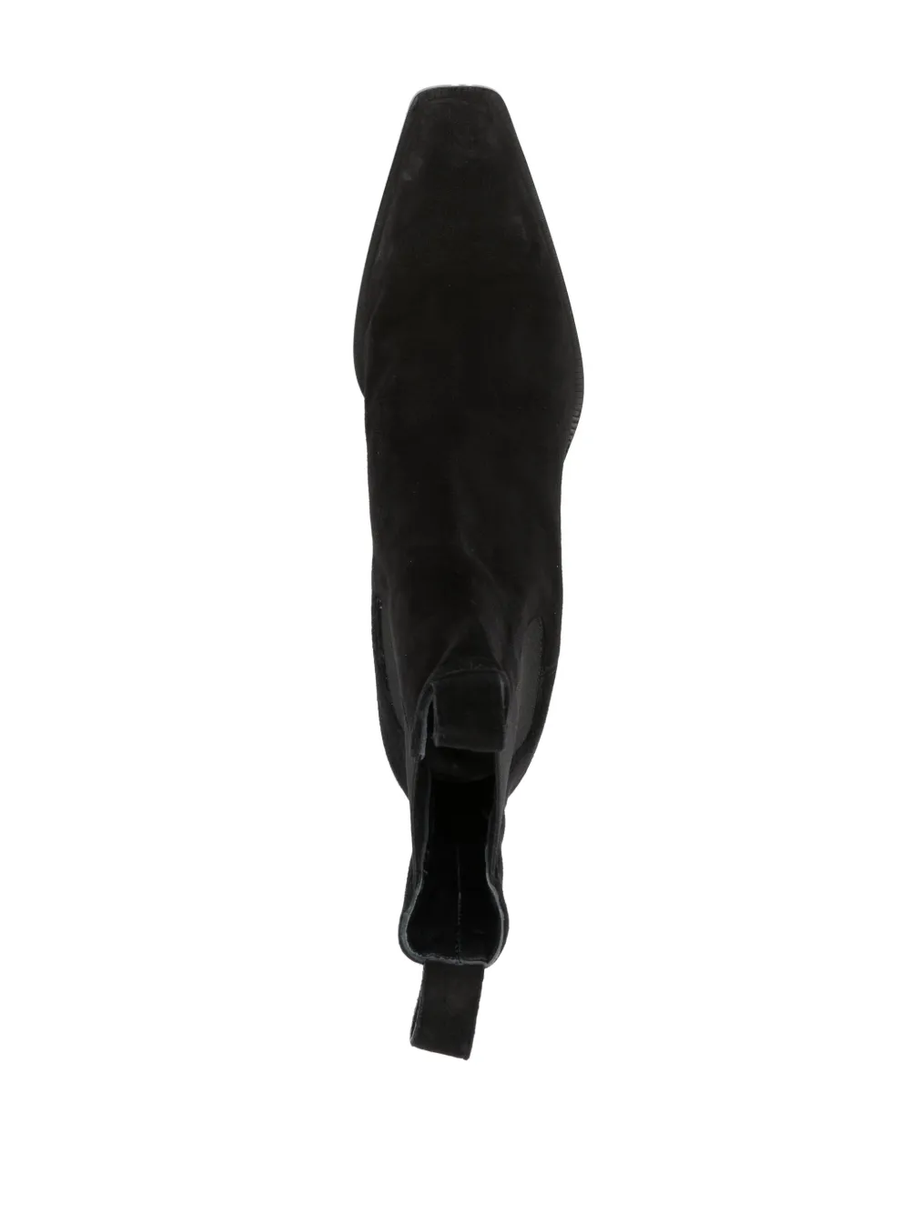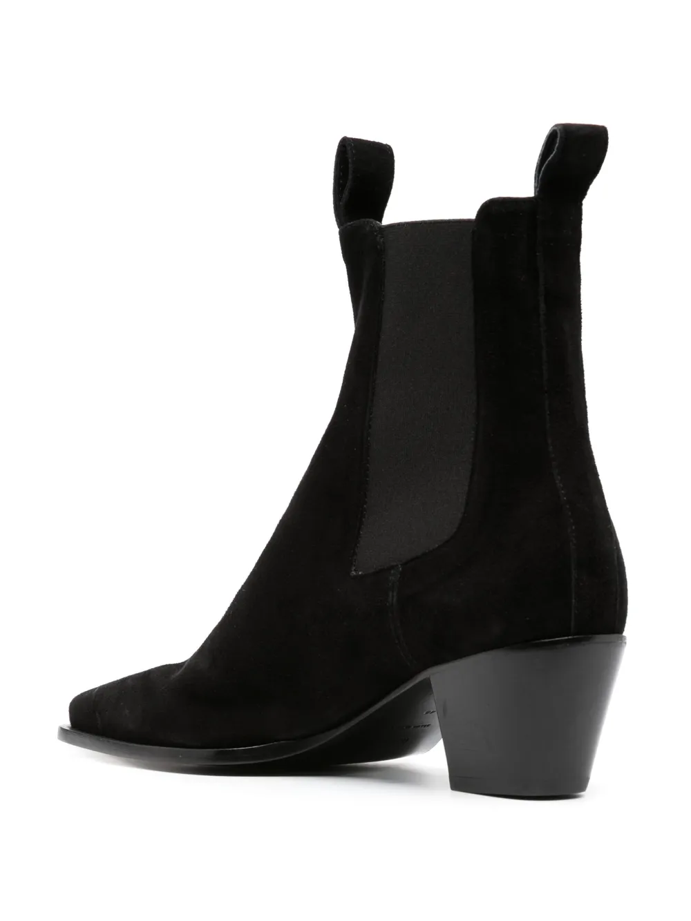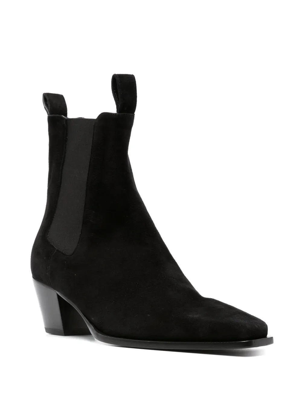 Черный, замша из телячьей кожи, модель без застежки, заостренный носок, эластичные боковые вставки, двойная петля для подтягивания и блочный каблук средней высоты.