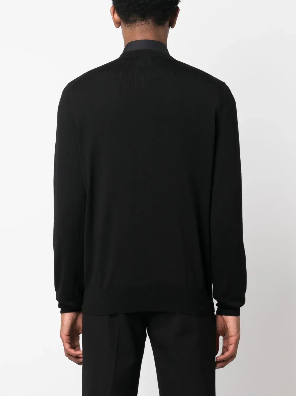 Черный, шерсть, цветочный узор, декор из бисера, отделка в рубчик, круглый вырез, длинные рукава и прямой подол.