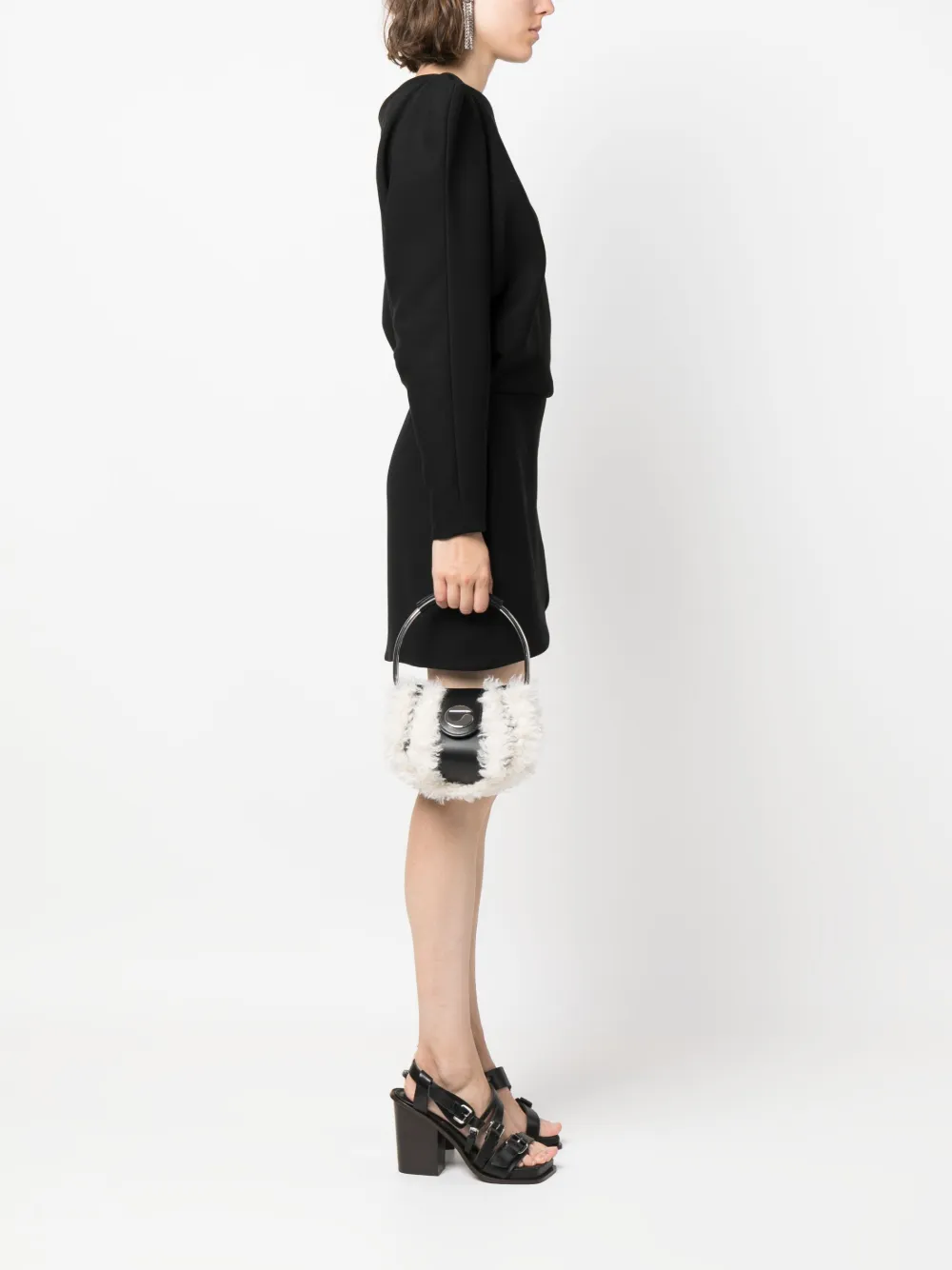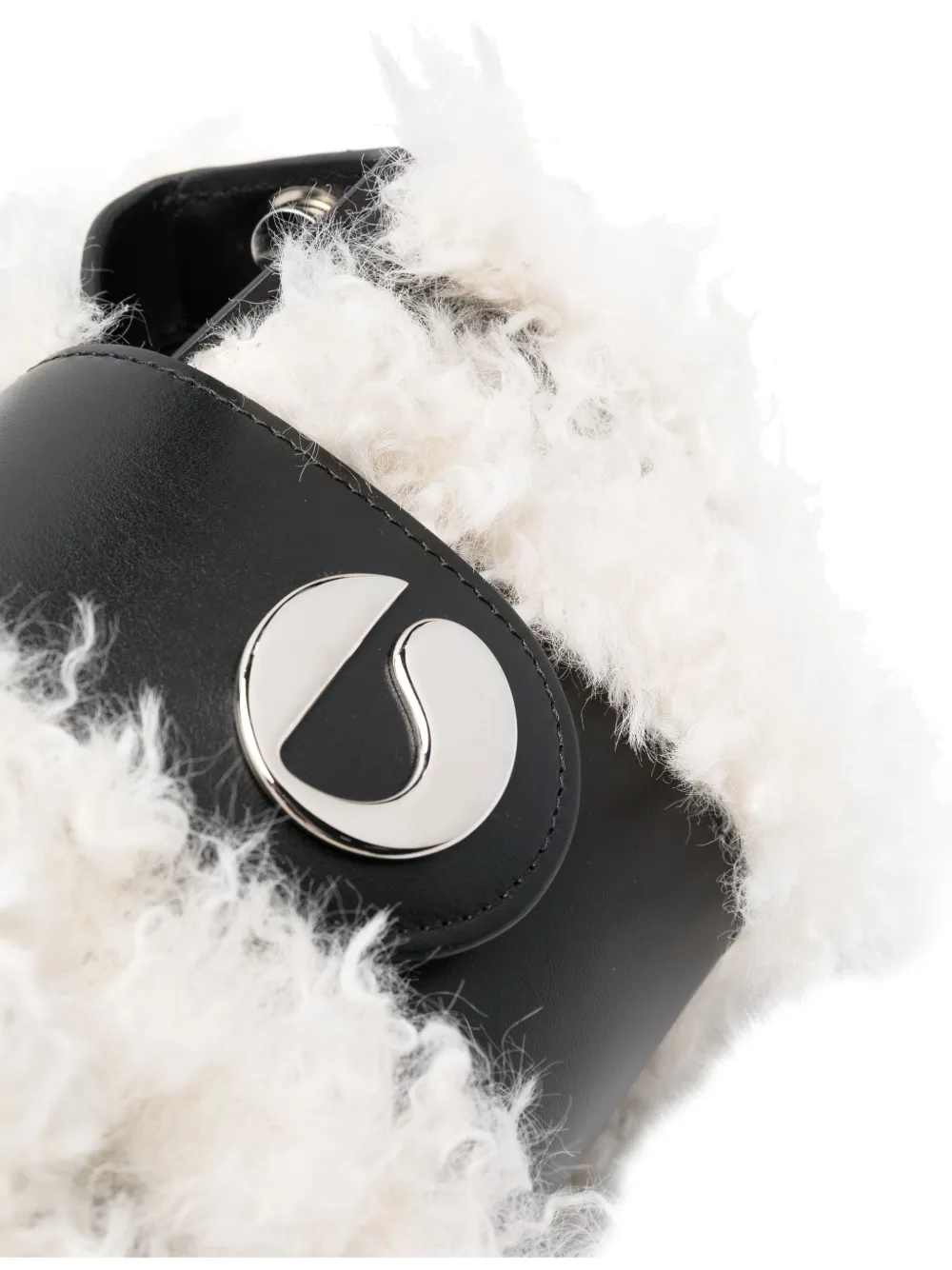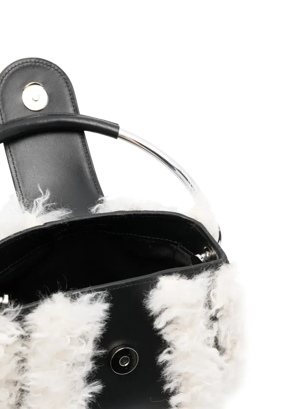 Черный/белый, телячья кожа, металлический логотип, вставки, верхняя ручка, искусственная овчина, откидной клапан на магните и основное отделение.