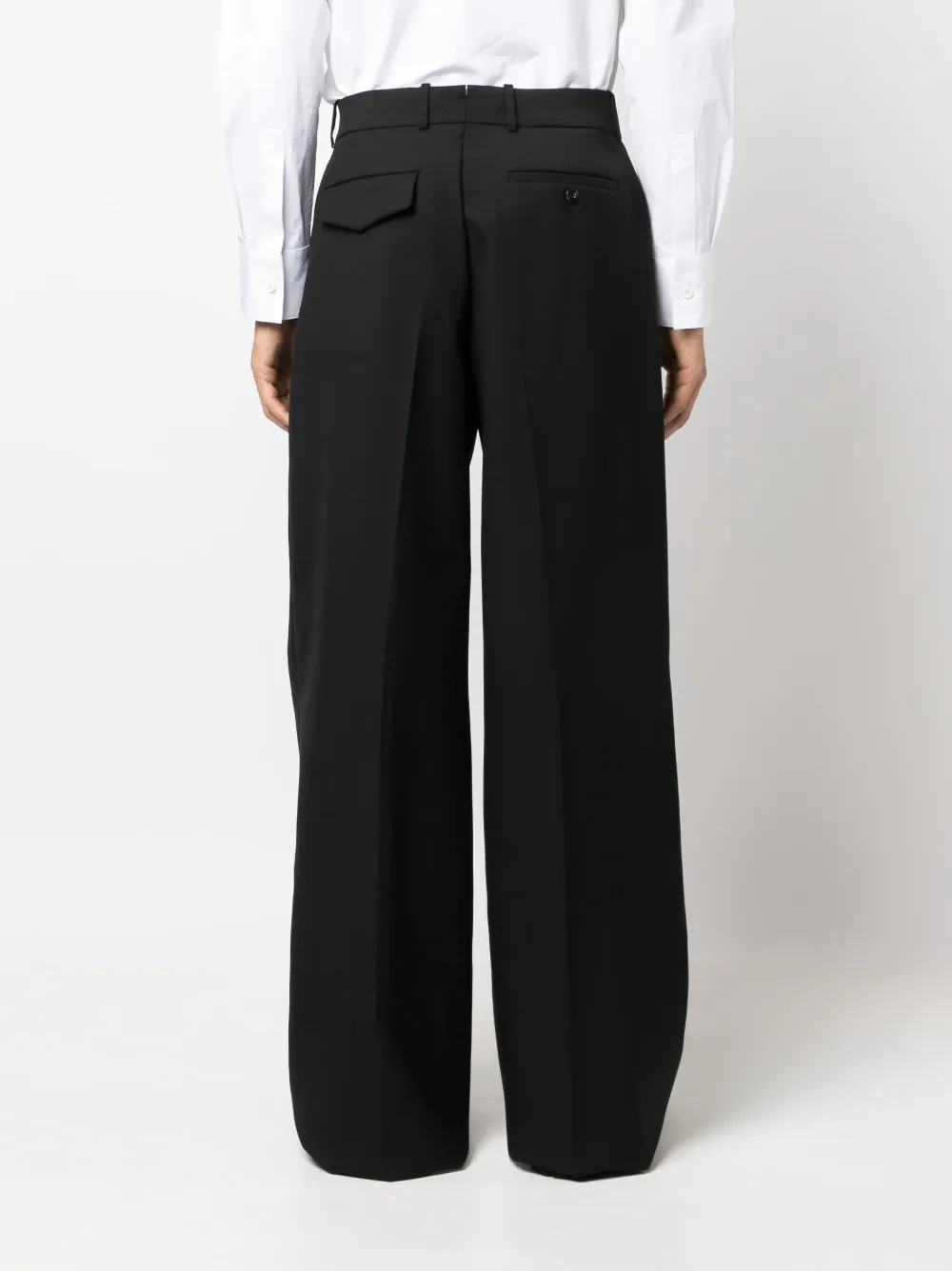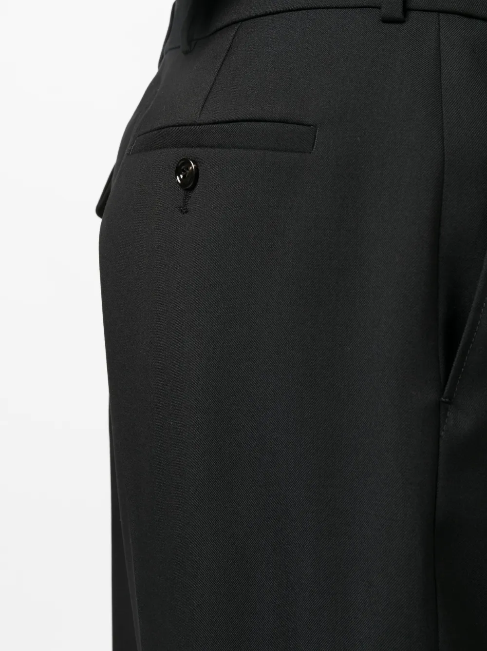 Черный, шерсть, завышенная талия, петли для ремня, потайная застежка спереди, два прорезных кармана по бокам, карман с клапаном сзади, задние карманы с листочкой, широкий крой и классический крой.