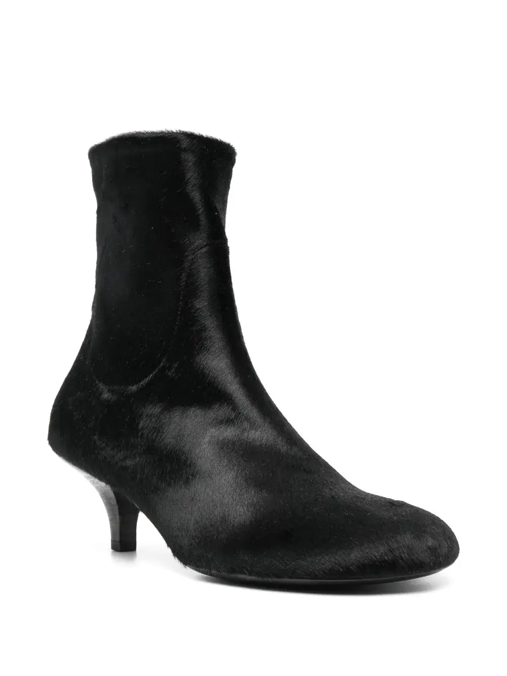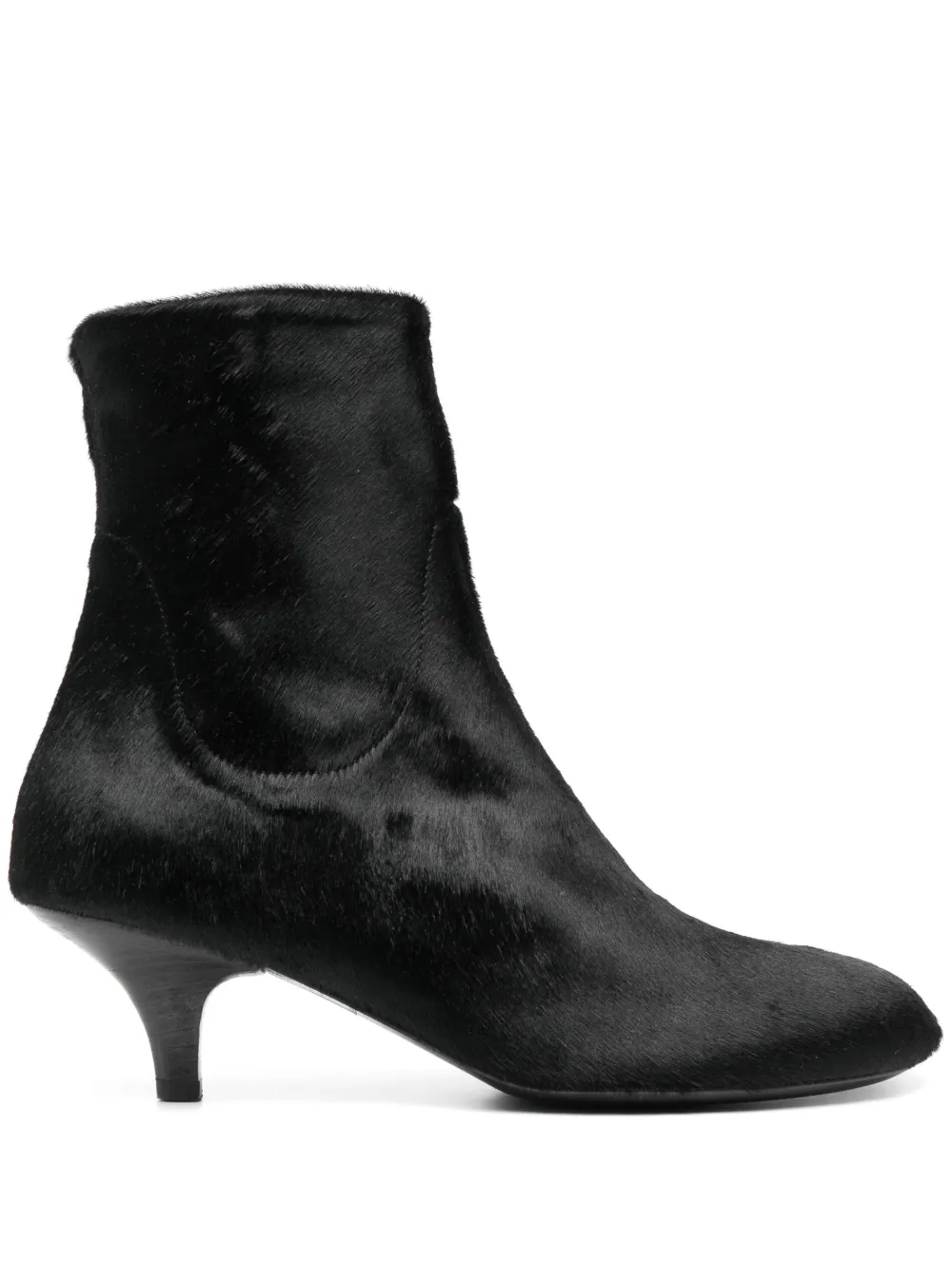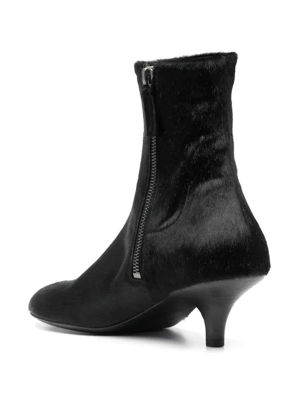 Черный, телячья кожа, закругленный носок, застежка на молнии сбоку и каблук-рюмка.