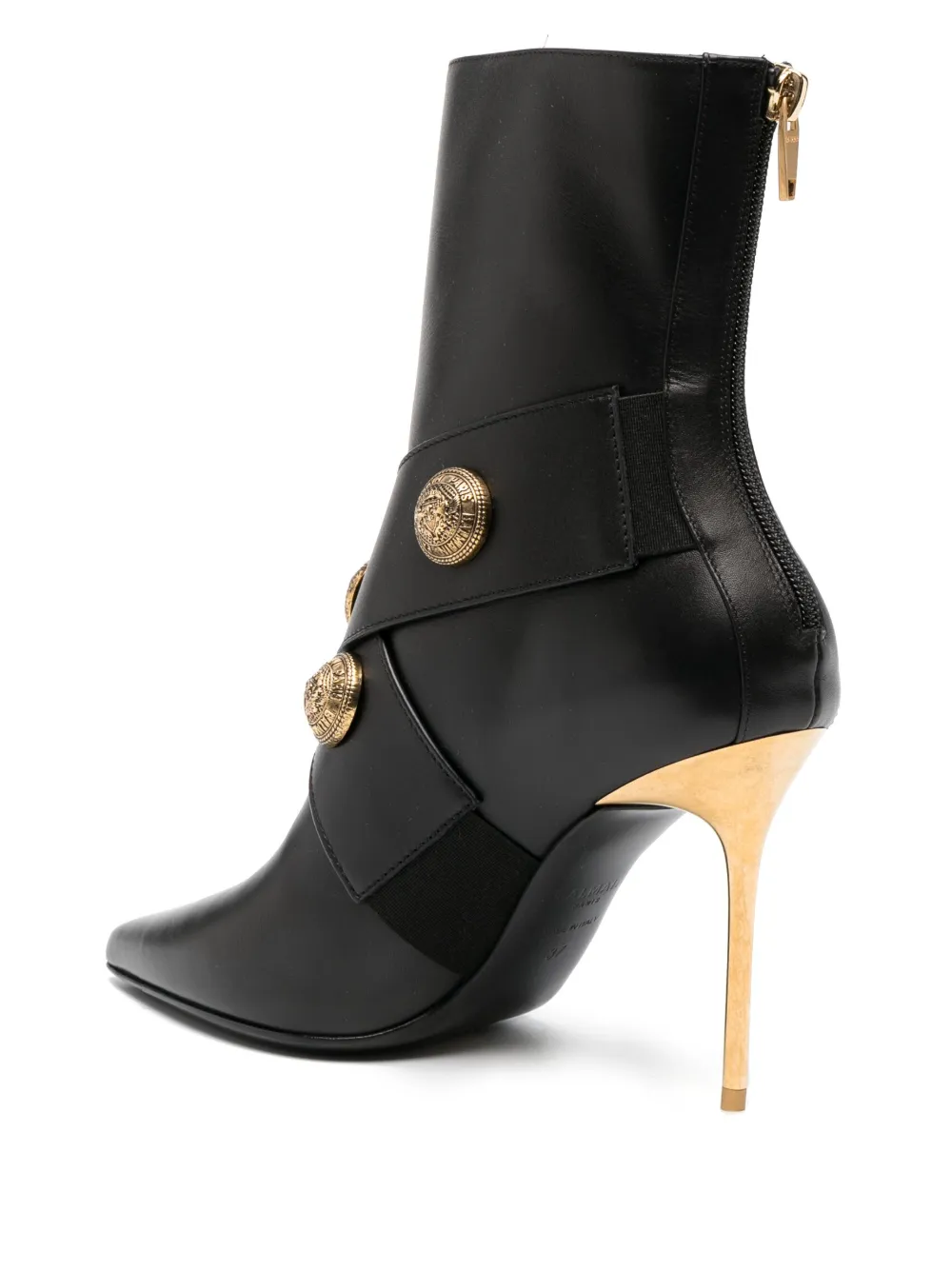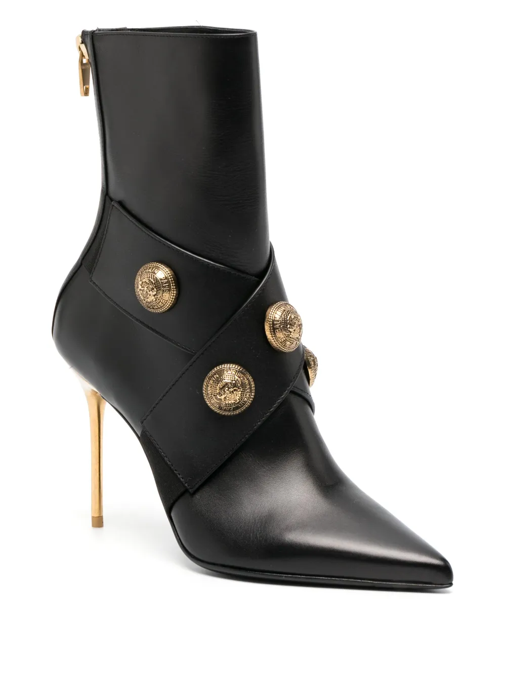 Черный, телячья кожа, гладкая текстура кожи, пуговицы с выгравированным логотипом, заостренный носок, застежка на молнии сзади и каблук на высокой шпильке.