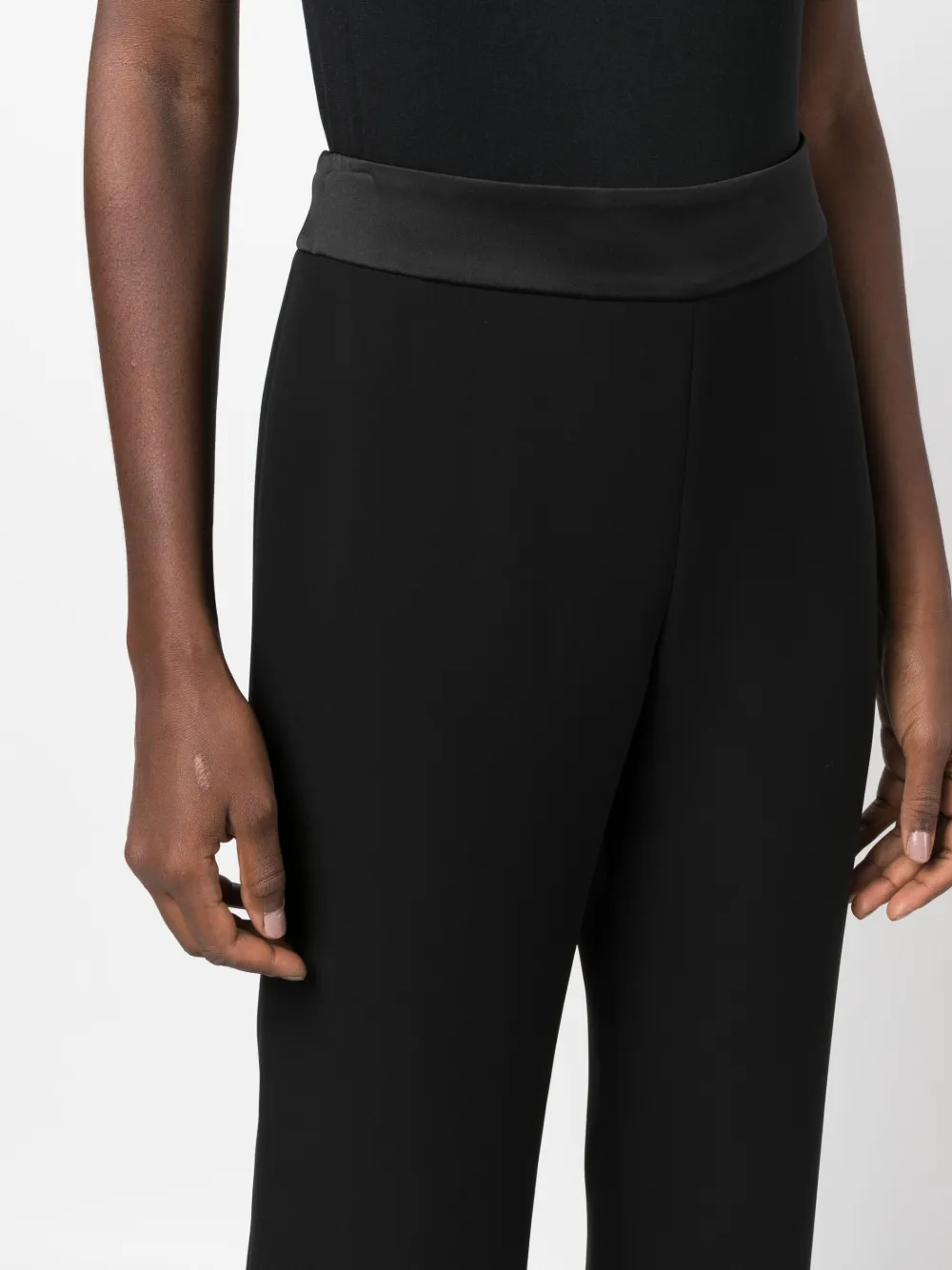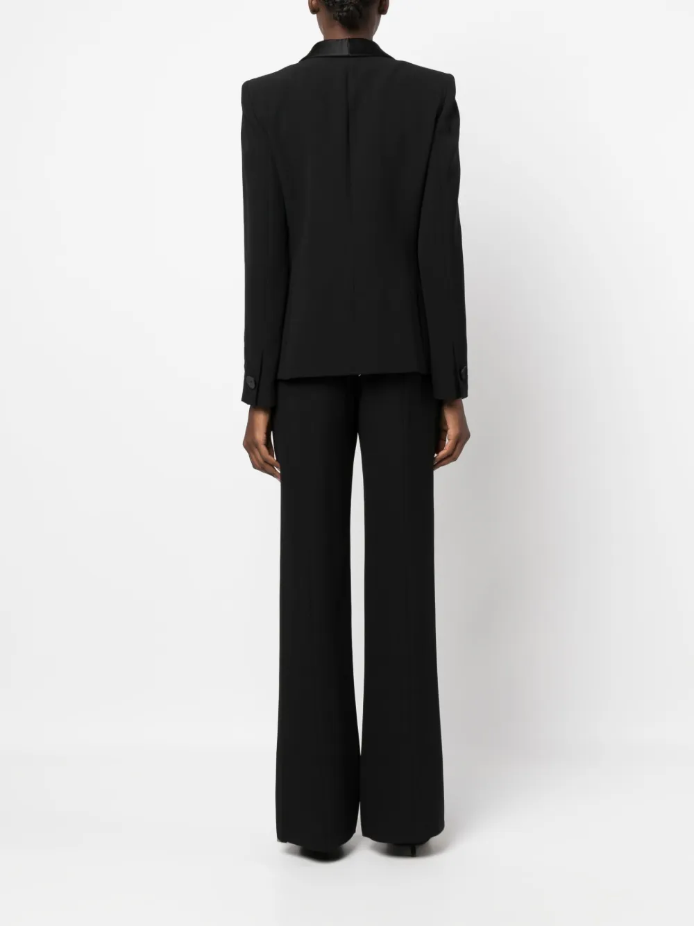 Черный, шелк, лацканы-шалька, застежка на пуговицах спереди, длинные рукава, манжеты на пуговицах, прорезной карман на груди, два прорезных кармана спереди, прямой подол, классический крой, стрелки, завышенная талия, расклешенный крой и два вшитых кармана по бокам.