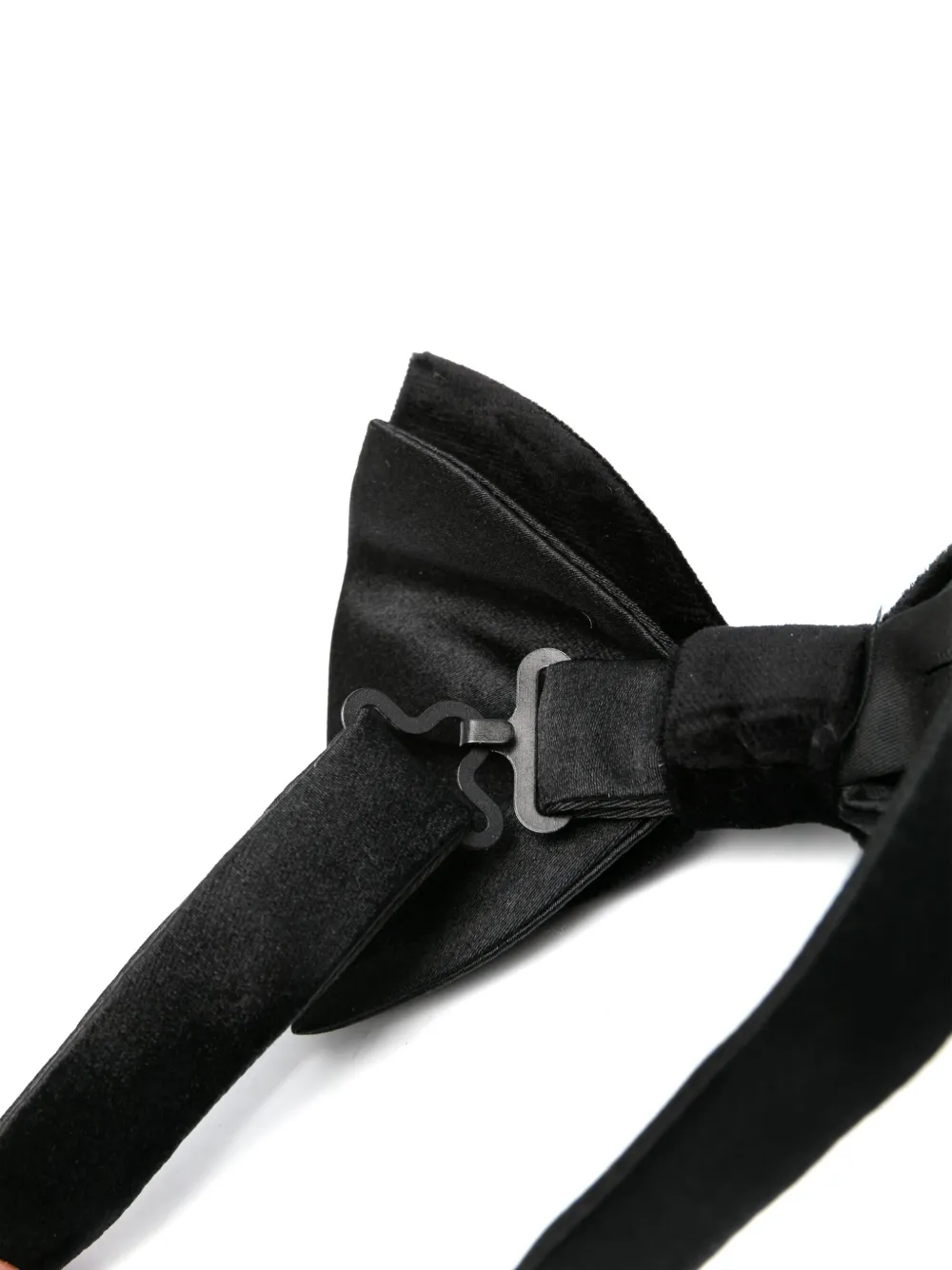 Черный, шелк, хлопок, бархатный эффект, бант, сатиновая фактура, застежка на крючок и регулируемый дизайн.