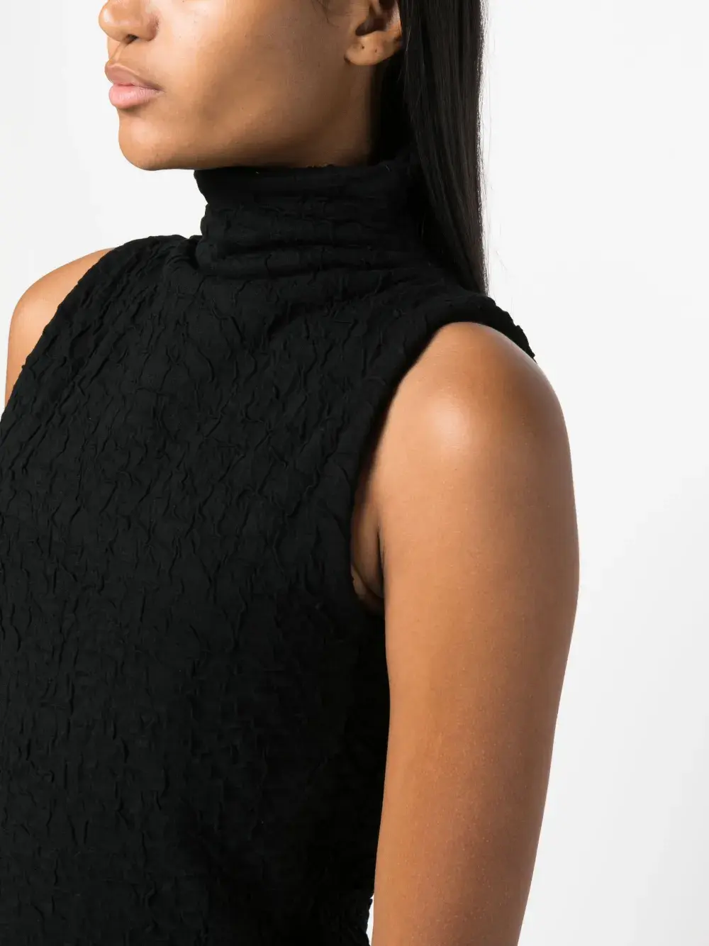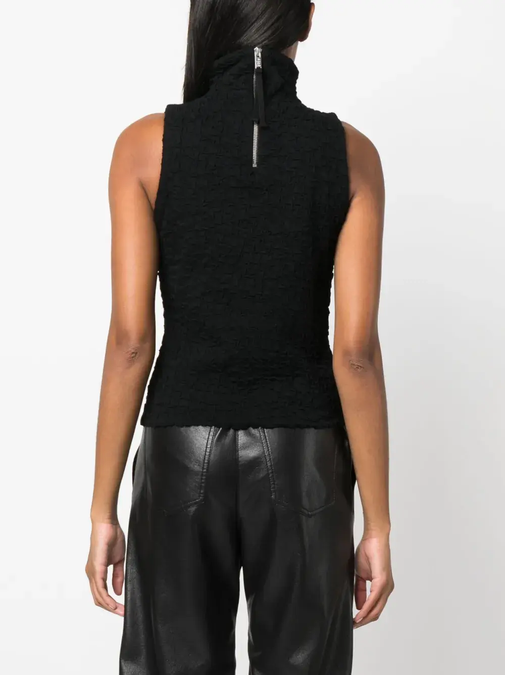 Жатый эффект, застежка на молнии сзади и без рукавов.