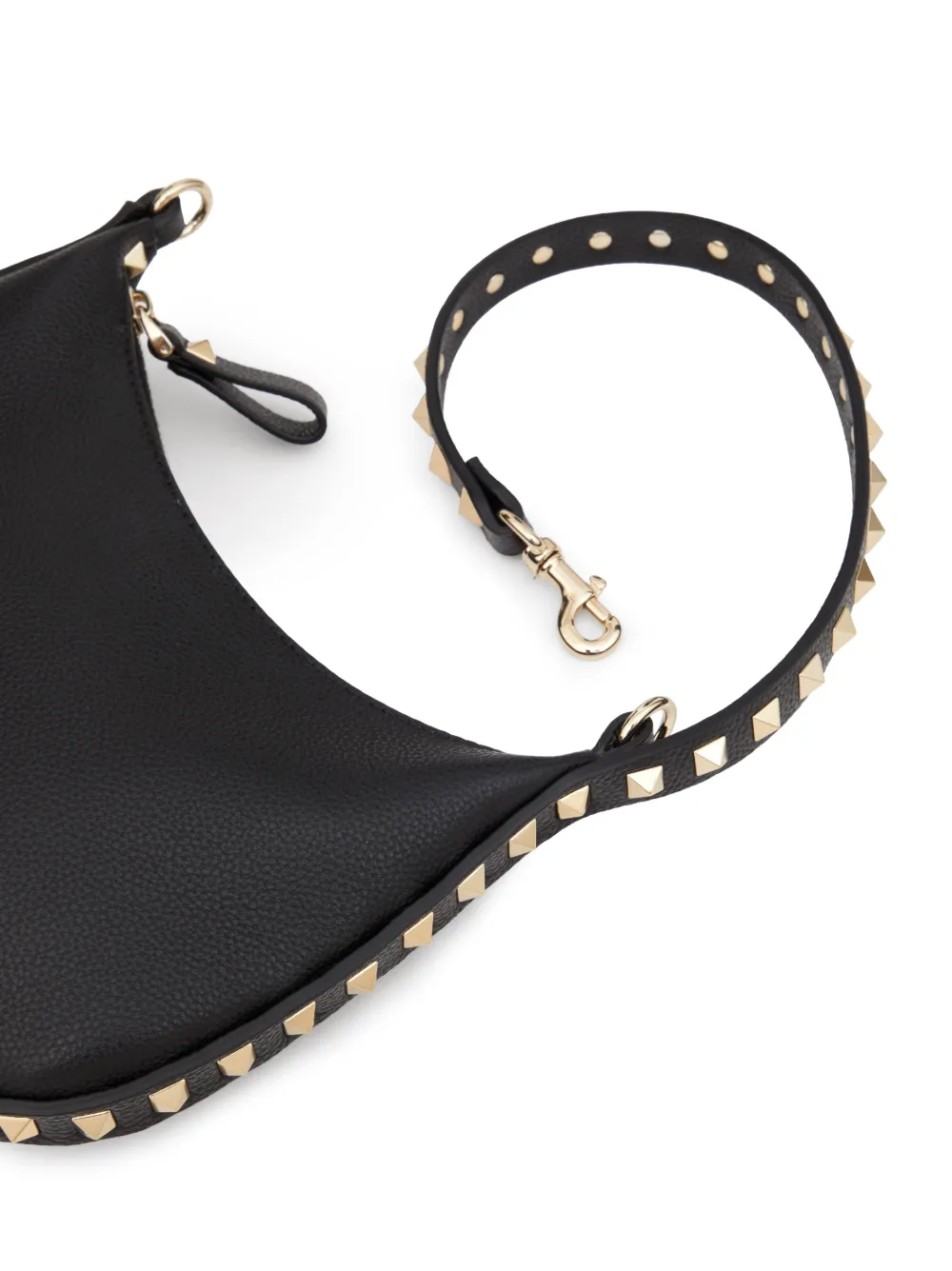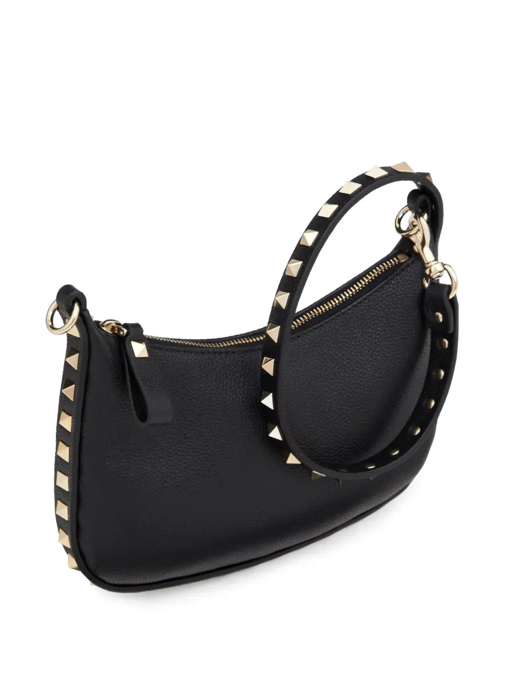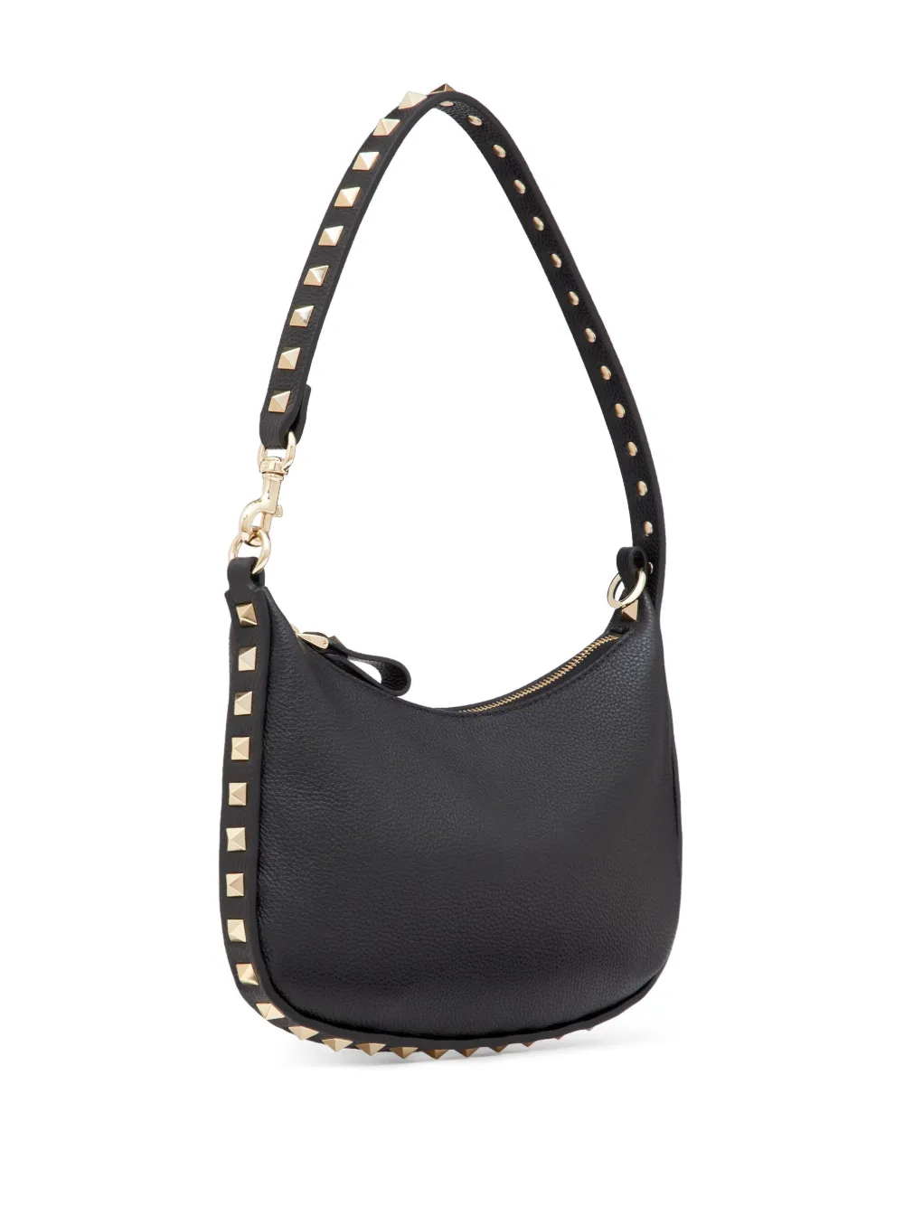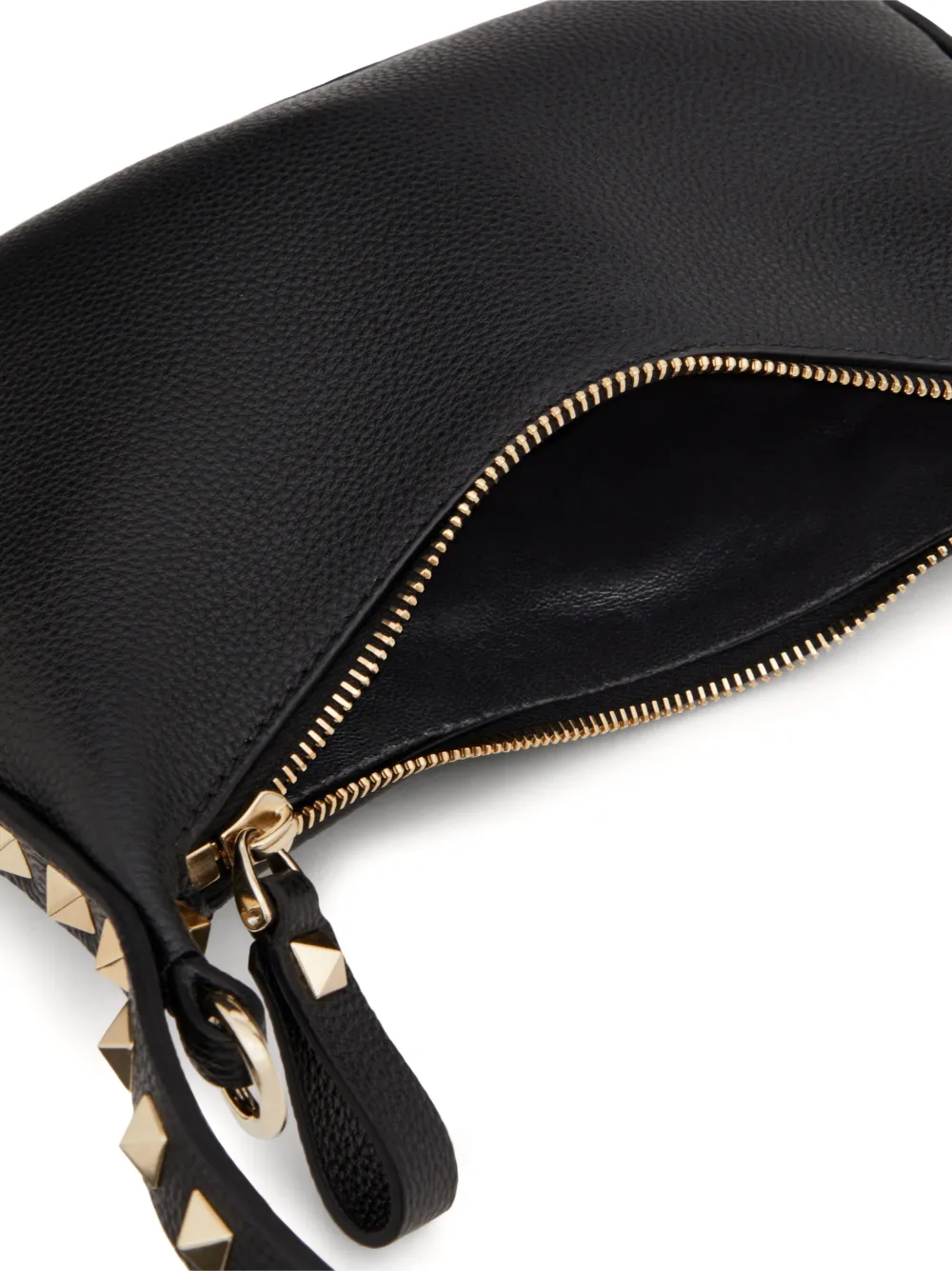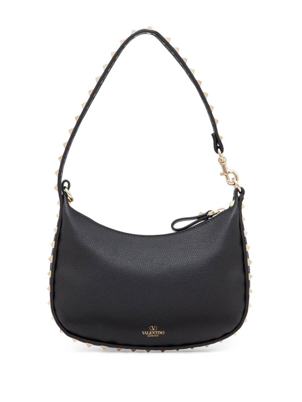 Черный, телячья кожа, золотистые заклепки Rockstud, логотип спереди, застежка на молнии сверху, ремень на плечо и основное отделение.