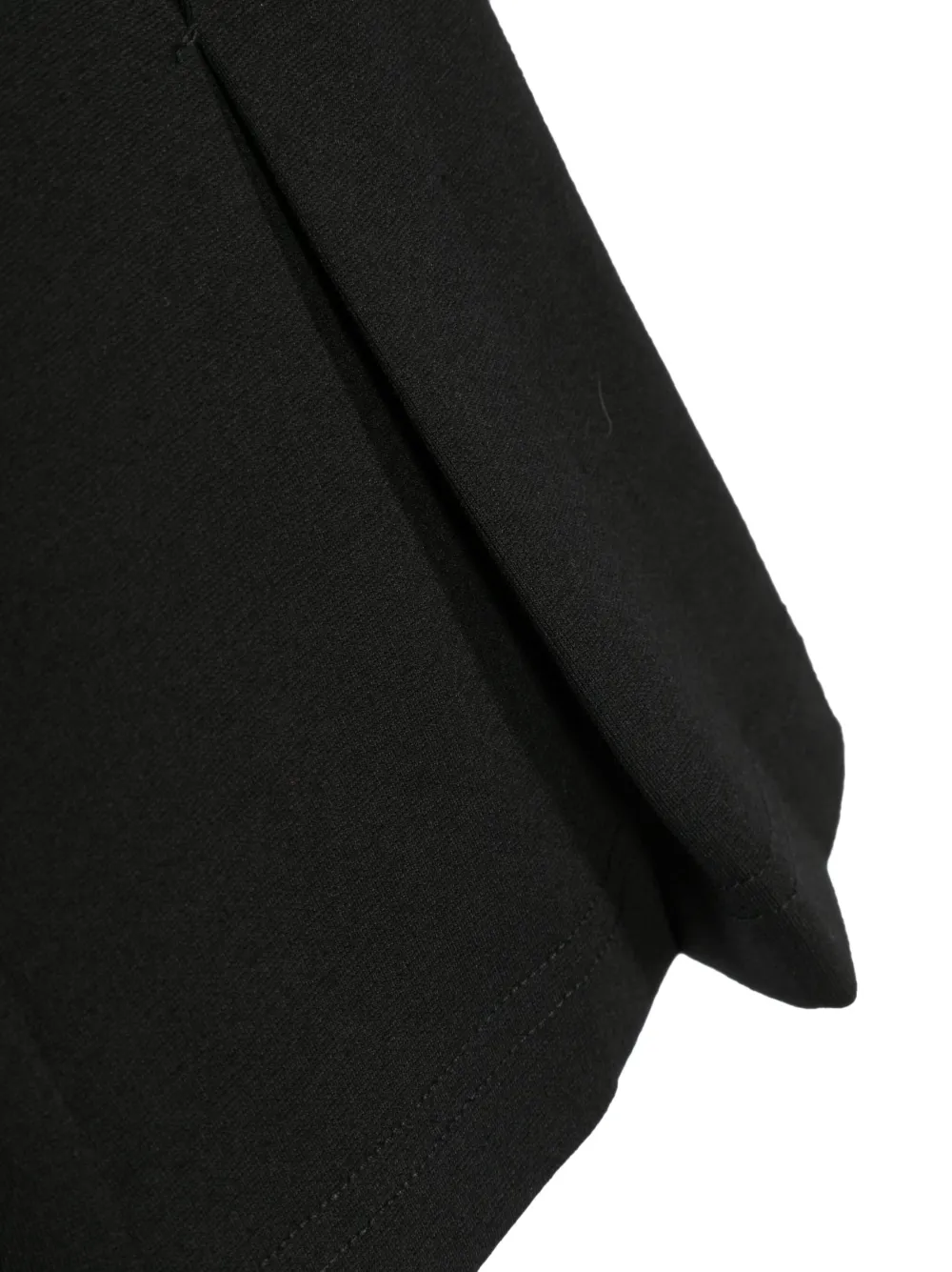 Черный, стрейчевая ткань, расклешенный крой, эластичный пояс и разрез.