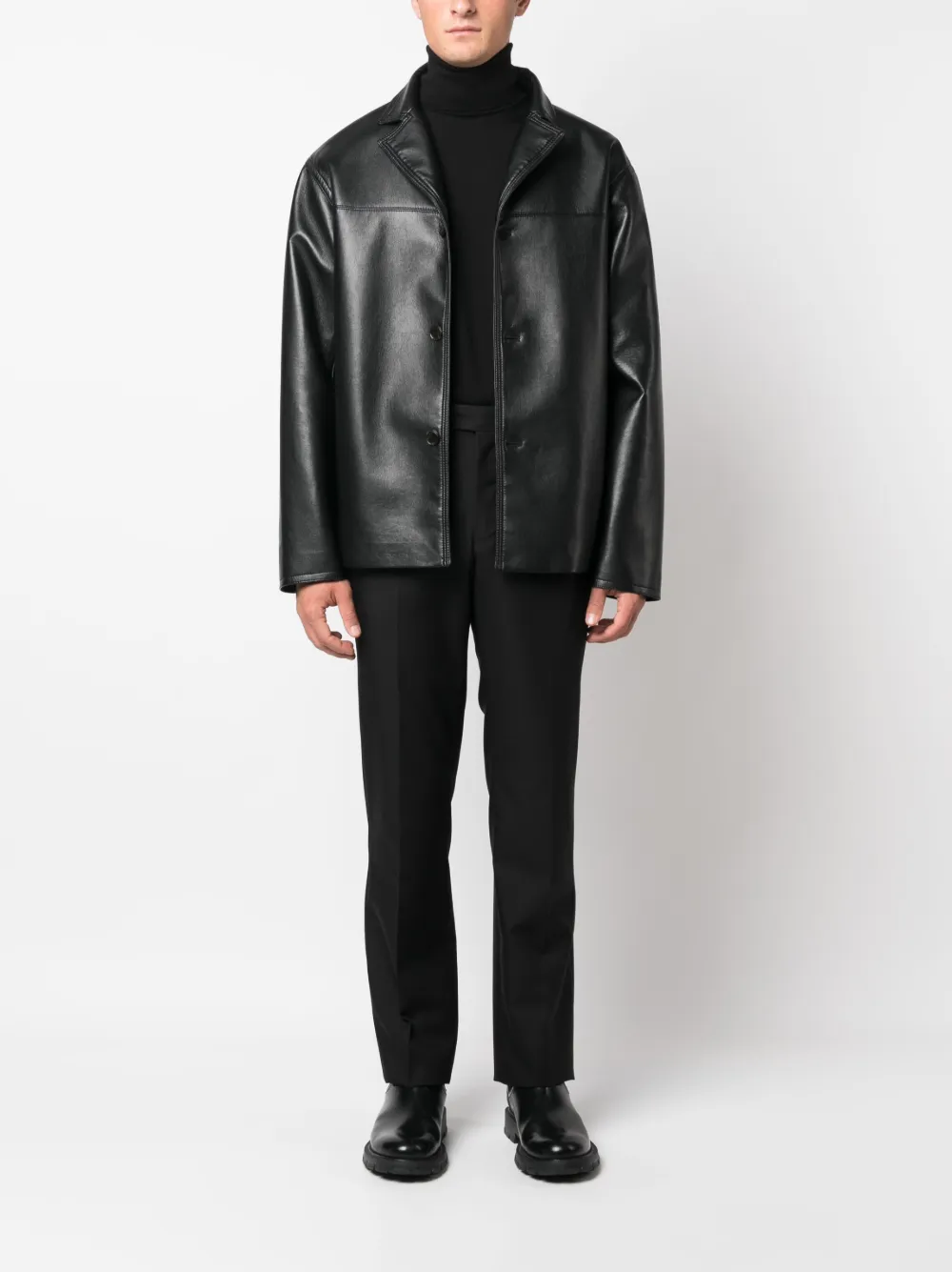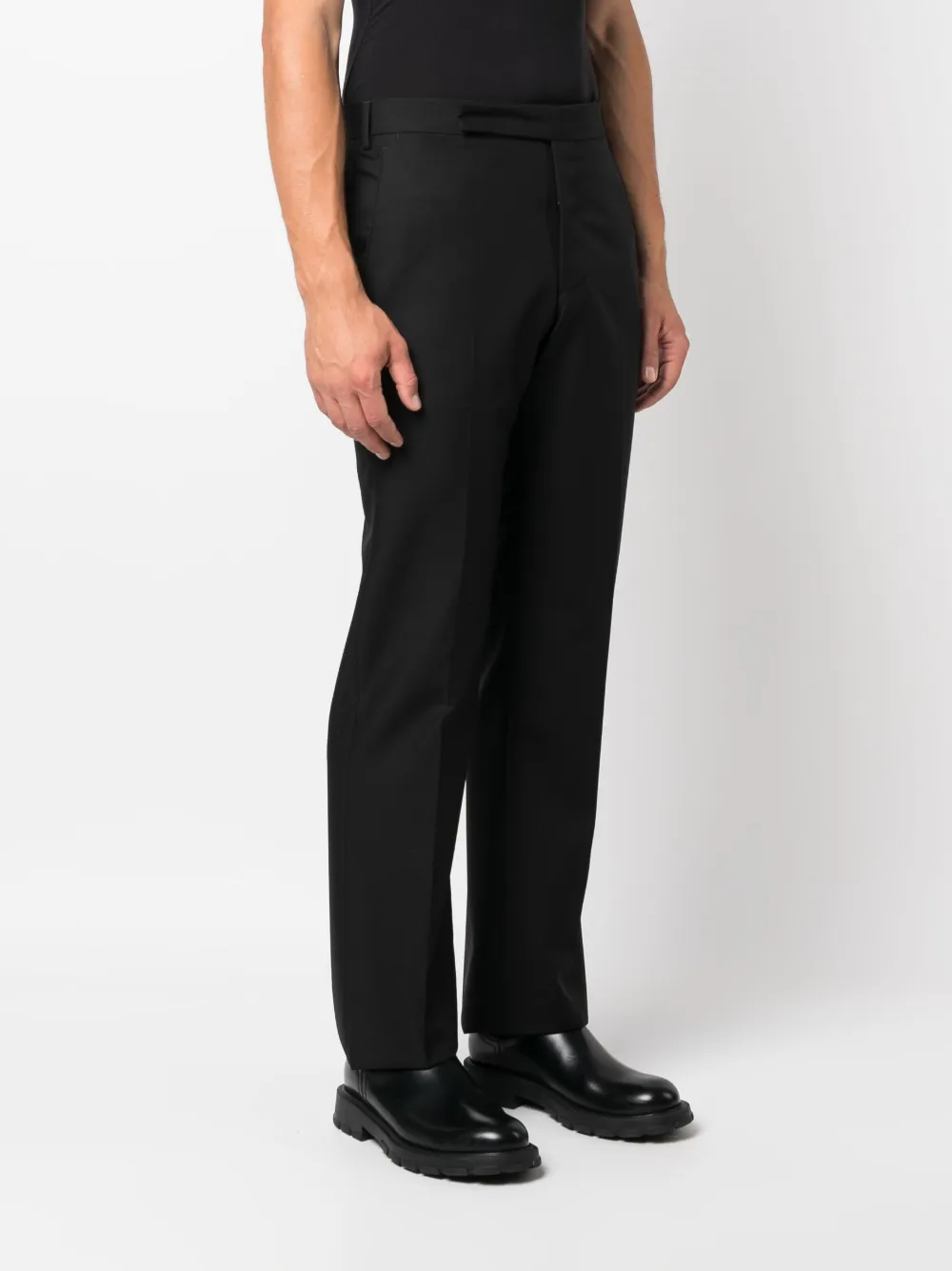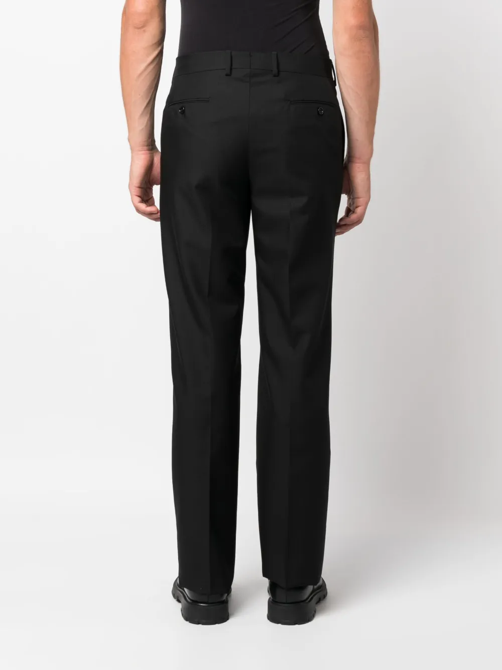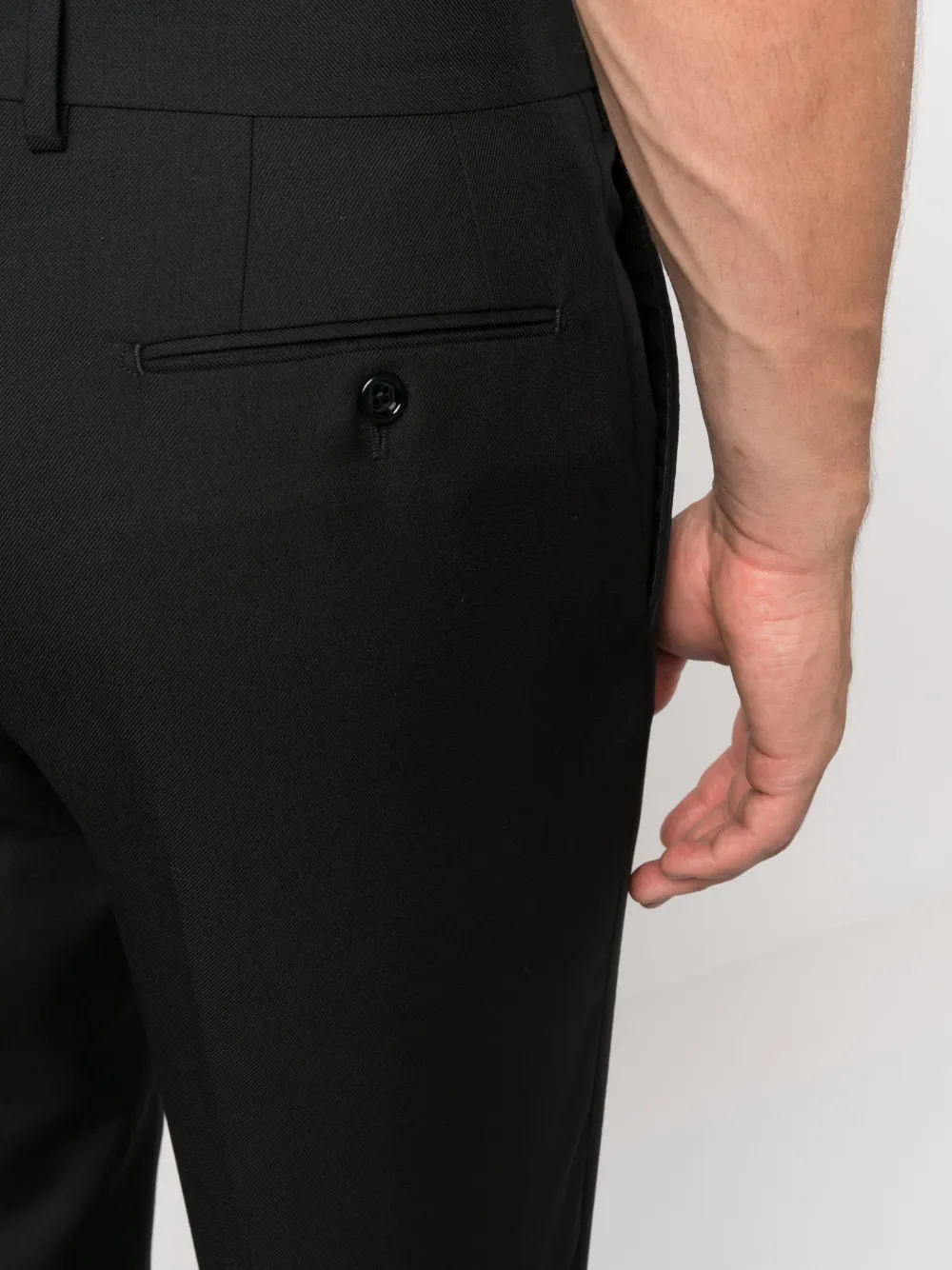 Черный, смесь шерсти и мохера, петли для ремня, потайная застежка спереди, два прорезных кармана на пуговицах сзади и зауженный крой.