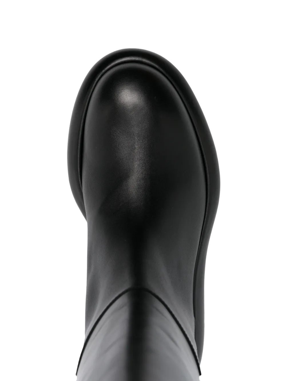 Черный, телячья кожа, закругленный носок, высота по колено, модель без застежки, стелька с логотипом и плоская резиновая подошва.