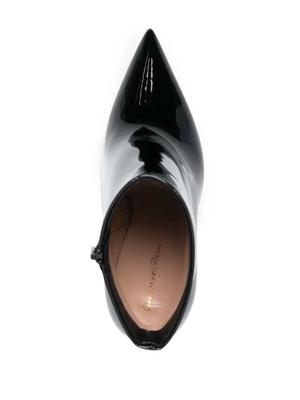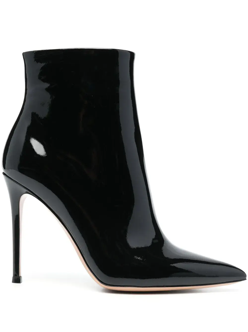 Черный, телячья кожа, лакированная отделка, высота по щиколотку, застежка на молнии сбоку, заостренный носок, кожаная стелька с логотипом и каблук на высокой шпильке.