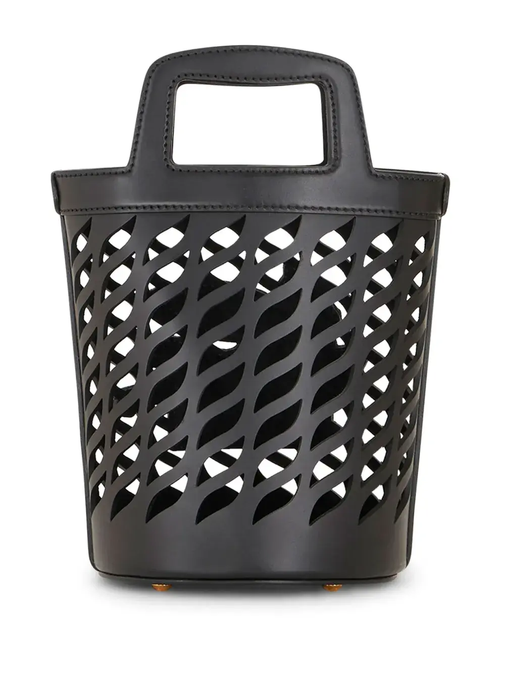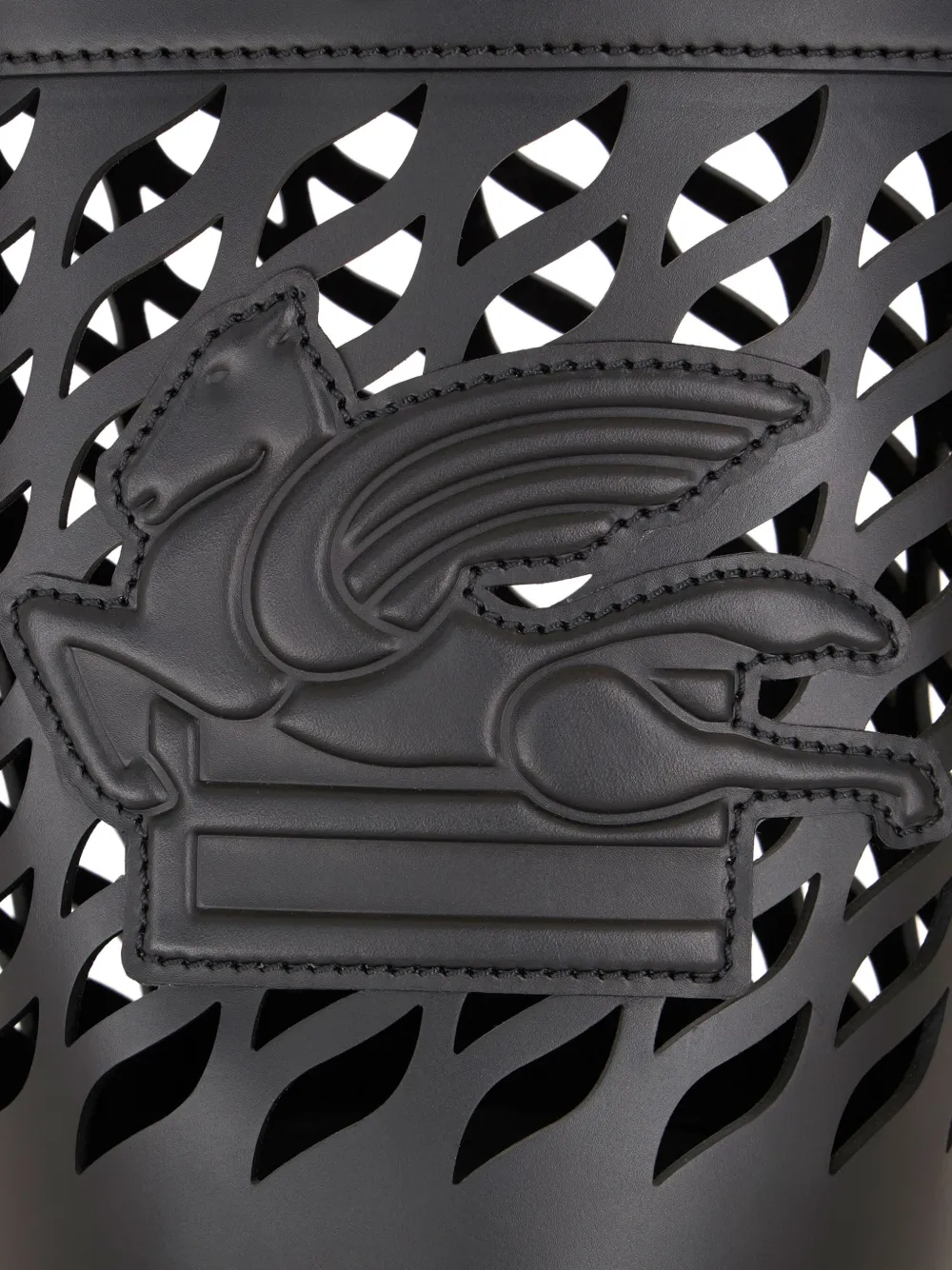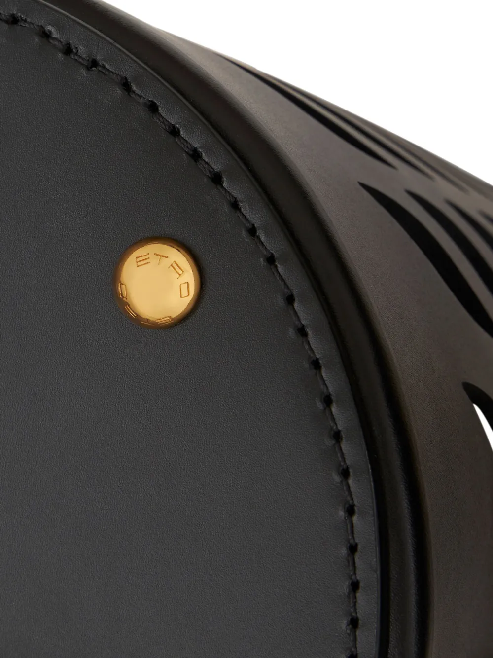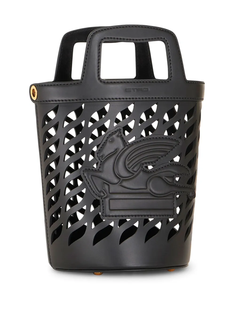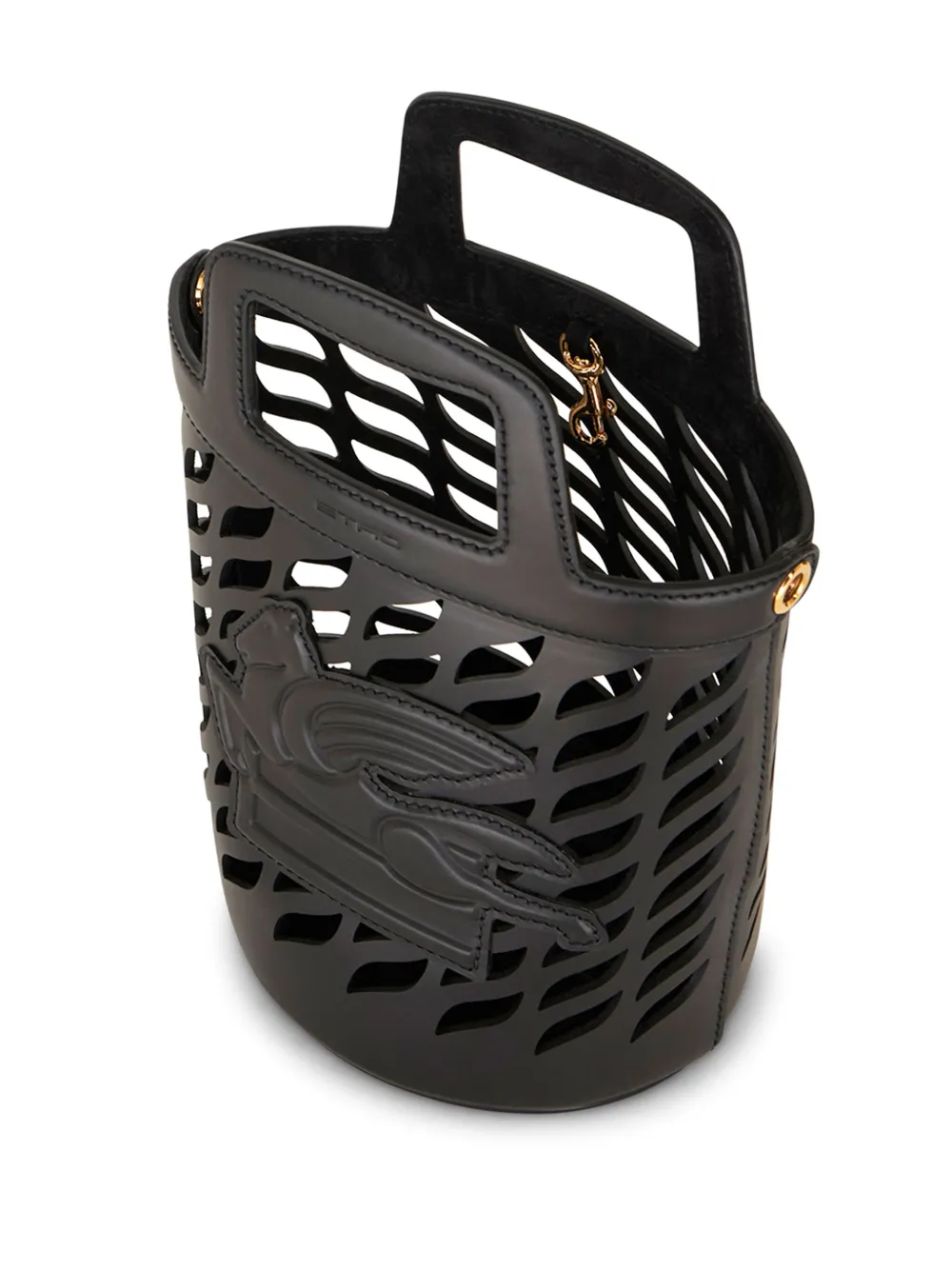 Черный, телячья кожа, модель ведро, узор Pegaso, перфорация, застежка-карабин, верхняя ручка, съемный ремень на плечо и основное отделение.