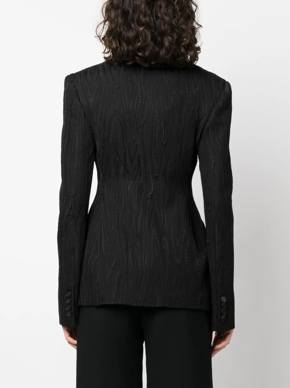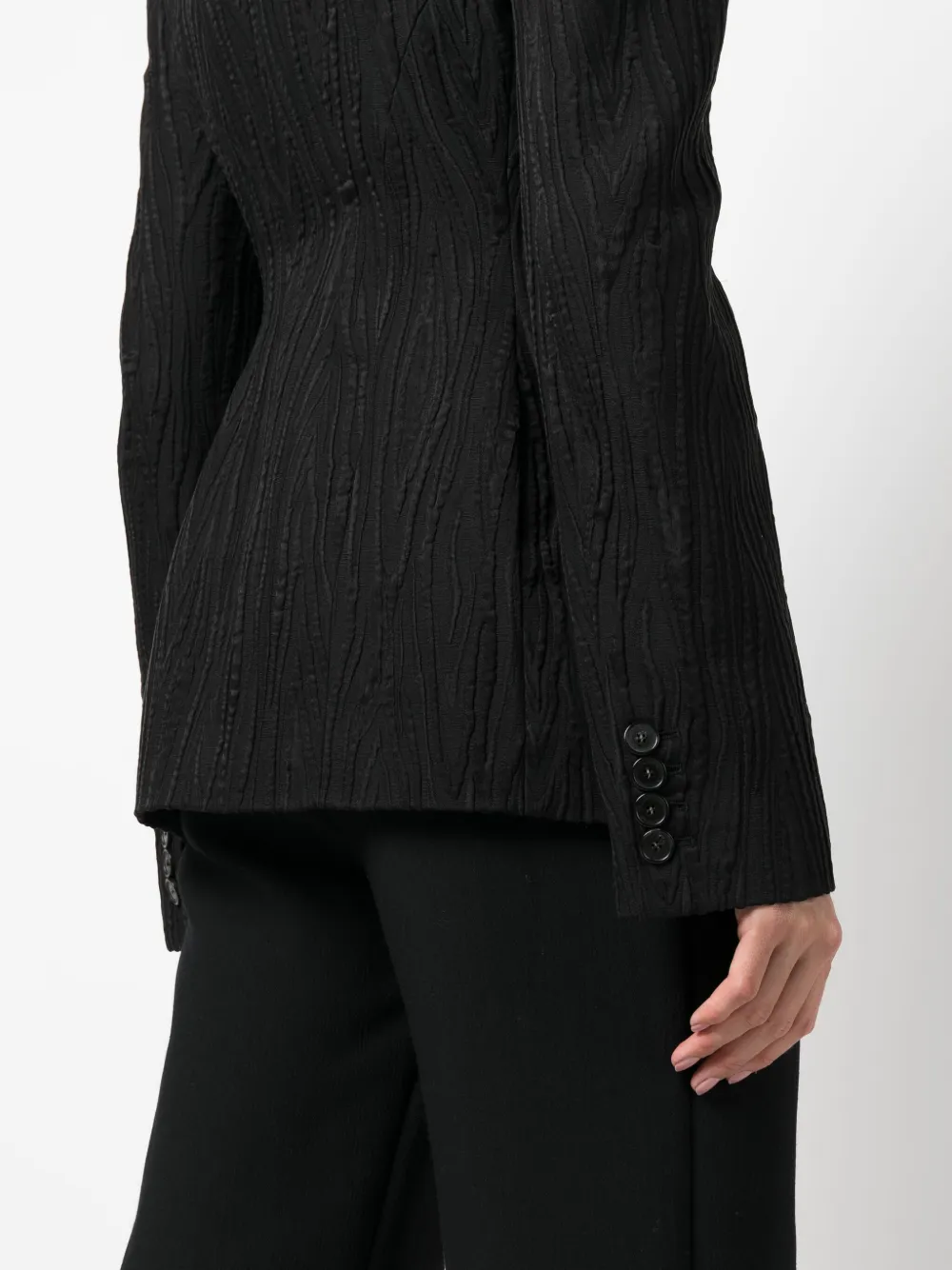 Подробнее о товаре: Черный, смесовый хлопок, жаккардовая модель, широкие заостренные лацканы, застежка на пуговицах спереди, длинные рукава, манжеты на пуговицах, приталенный силуэт, два передних кармана с клапанами, нагрудный прорезной карман и прямой подол. Узнать больше о том, какие товары получают отметку «Ответственный выбор», можно из материала «Как мы оцениваем экологичность и этичность».