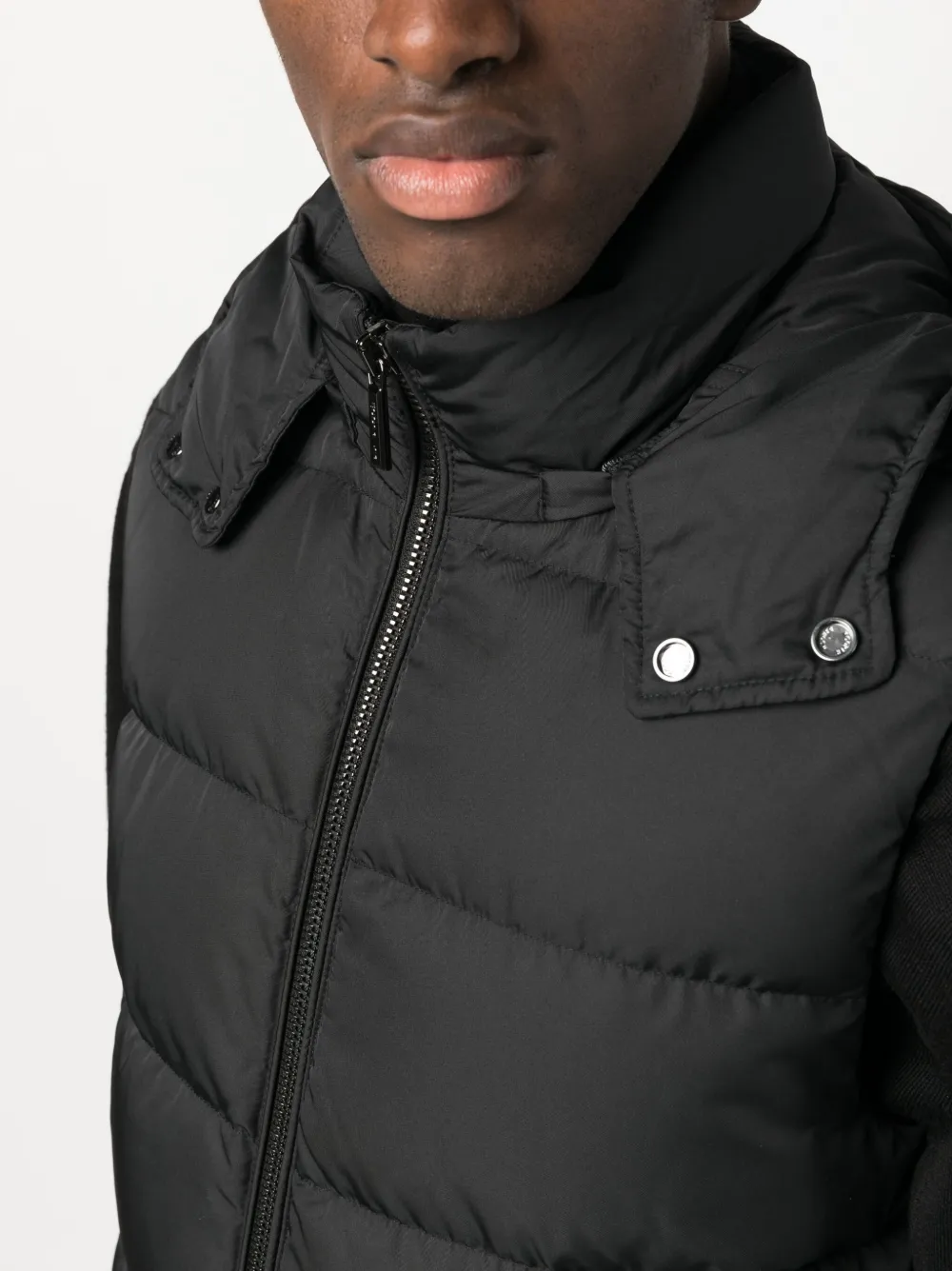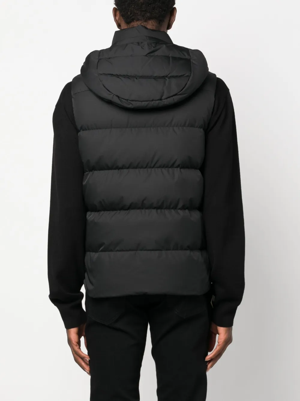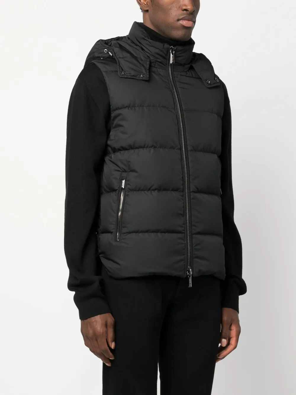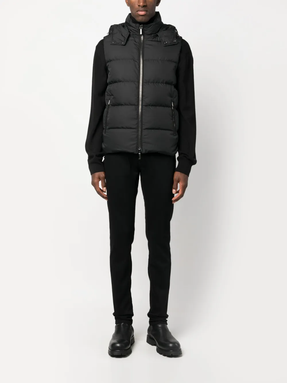Черный, наполнитель из пуха и перьев, дутый материал, стеганая модель, высокий воротник, классический капюшон, без рукавов, застежка на молнии спереди, два кармана на молнии по бокам и прямой подол.