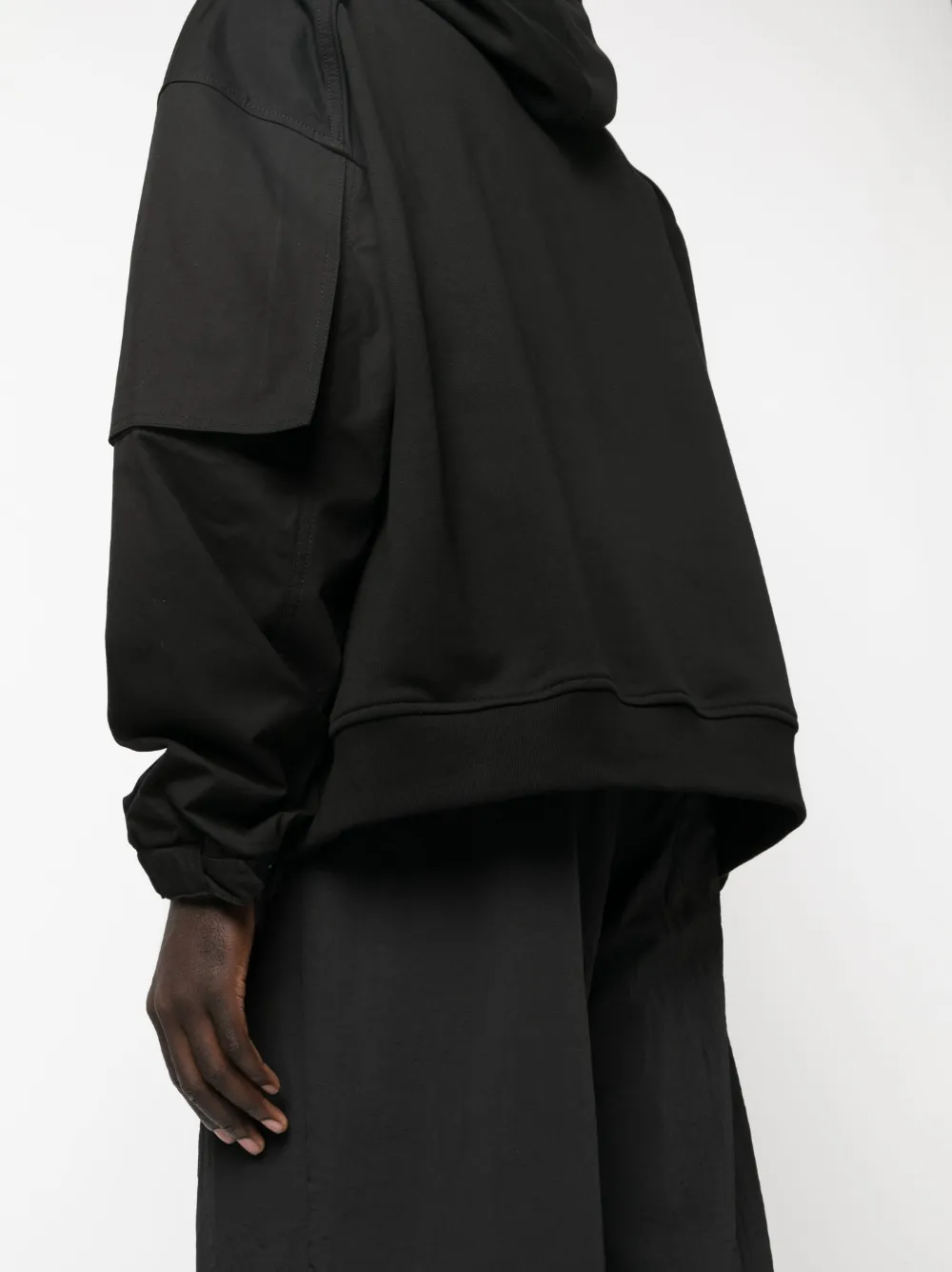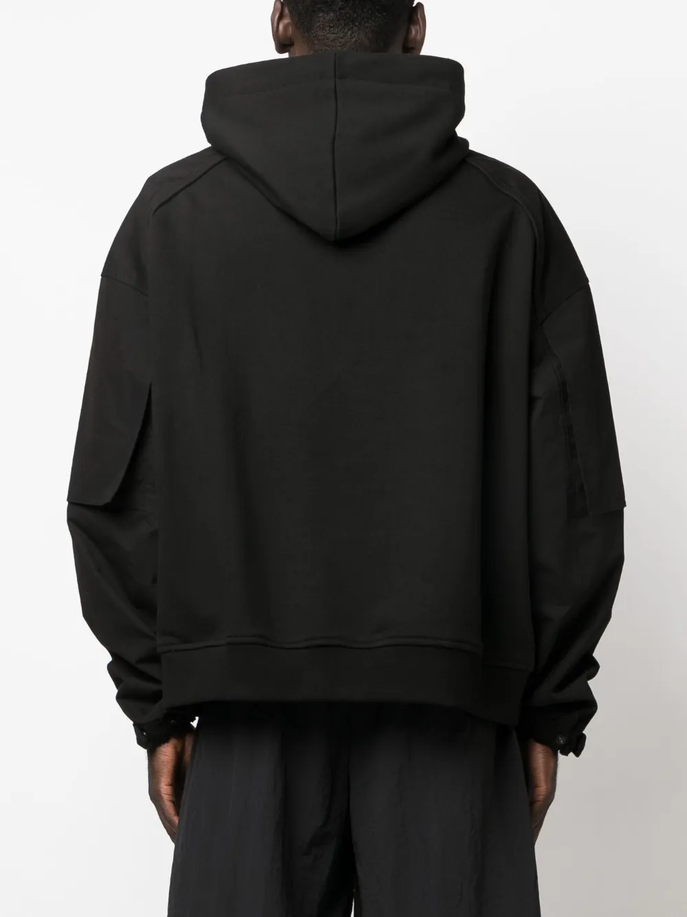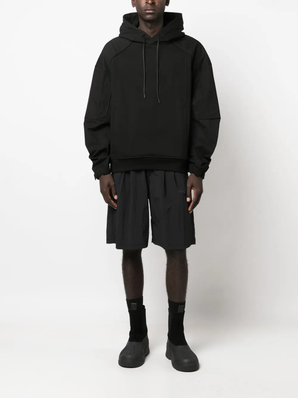 Черный, хлопок, вышитый логотип на груди, затягивающийся на шнурок капюшон, длинные рукава, эластичные манжеты, два прорезных кармана по бокам и прямой подол.