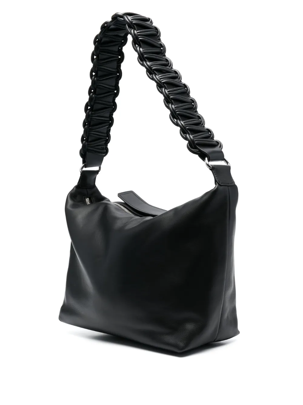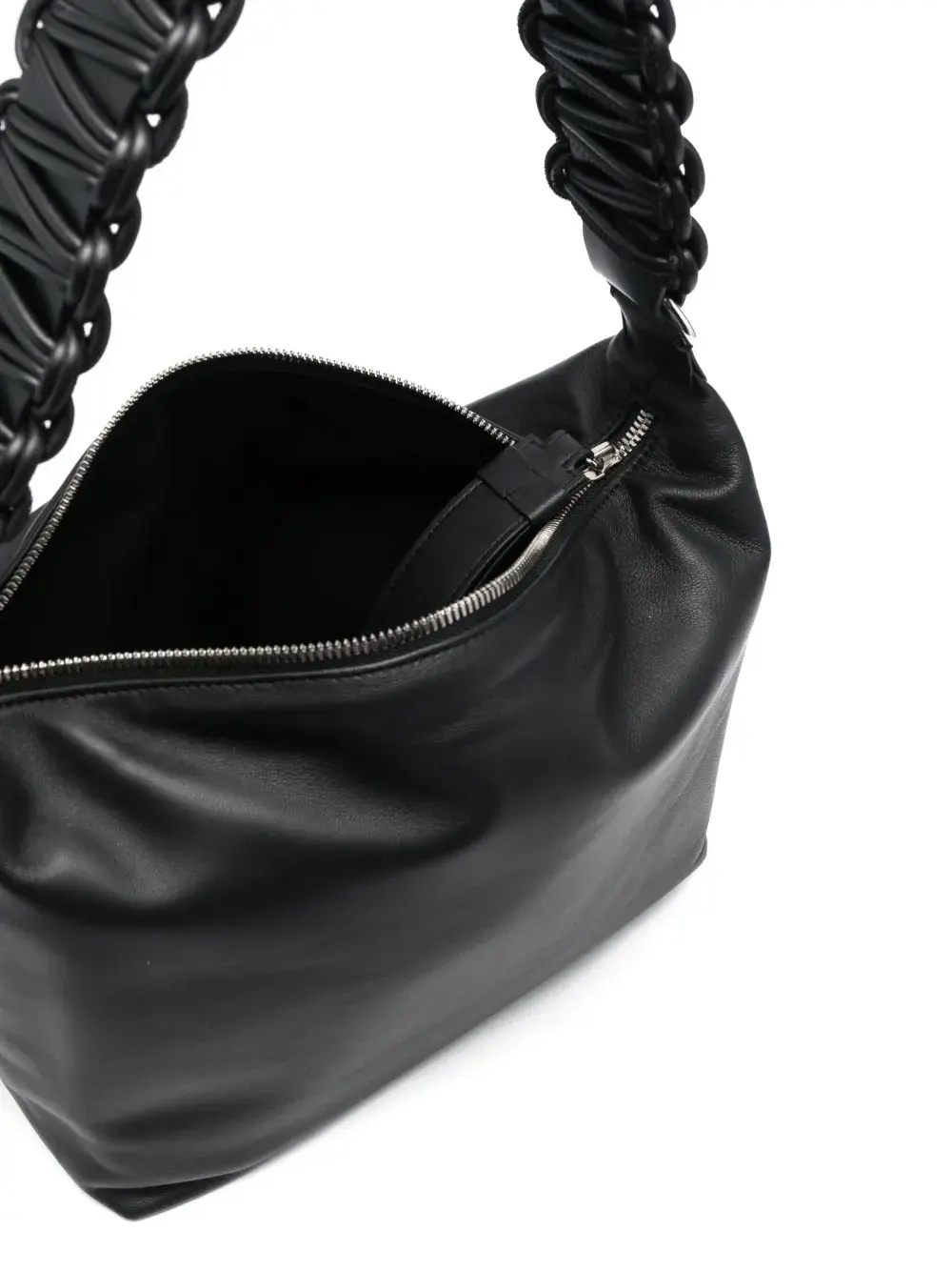 Черный, овечья кожа, плетеный ремень на плечо, застежка на молнии сверху и основное отделение.