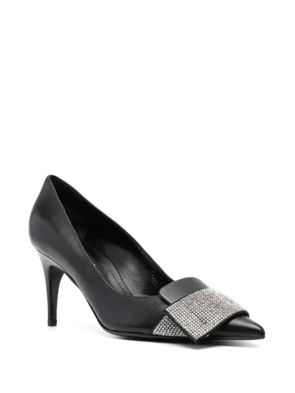 Черный, телячья кожа, овечья кожа, декор из кристаллов, заостренный носок, модель без застежки, стелька с логотипом, каблук на высокой шпильке и кожаная подошва.