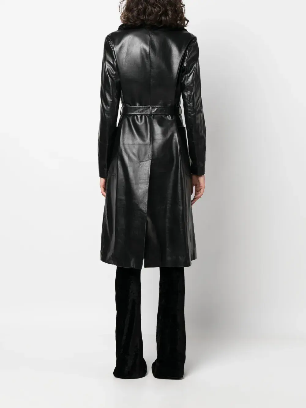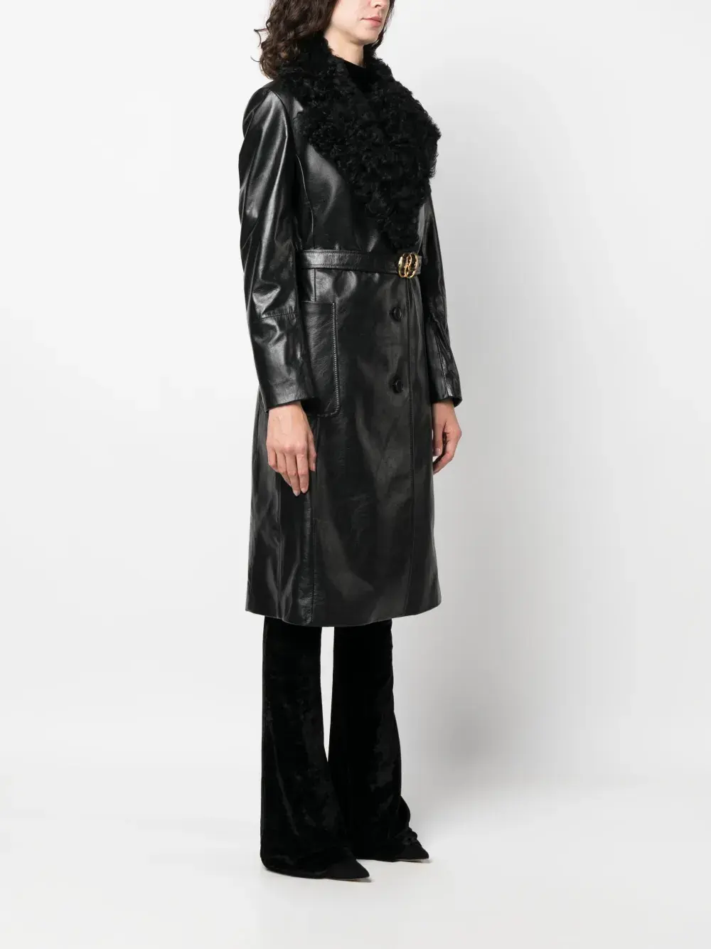 Черный, телячья кожа, овечья кожа, воротник из овечьей шерсти, застежка на пряжке с логотипом, ремень на талии, накладные карманы сбоку, длинные рукава, длина ниже колена и манжеты со ступенчатой отделкой.
