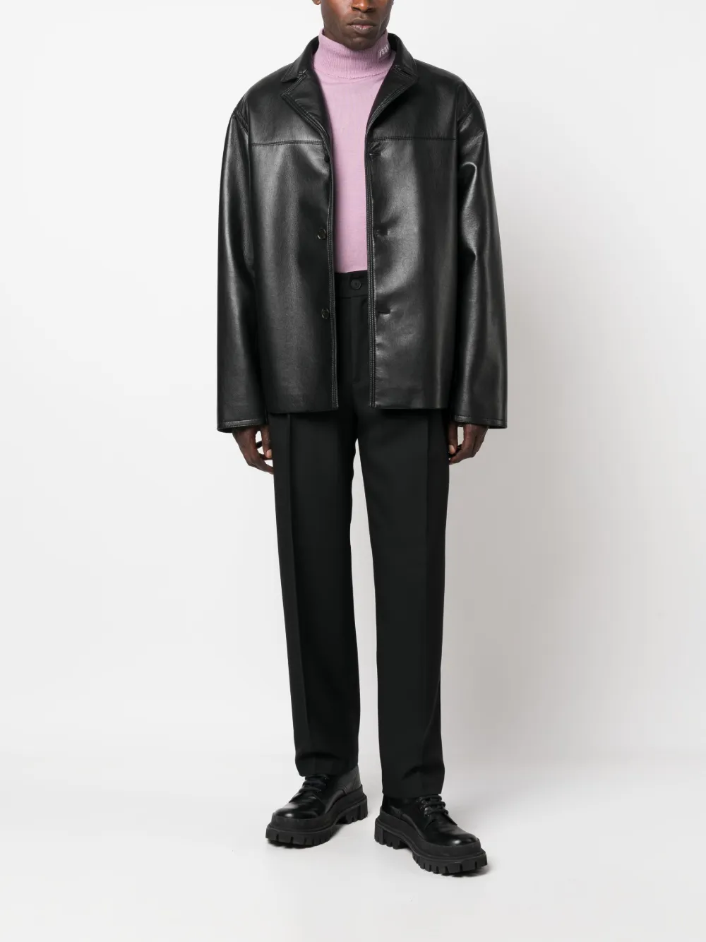 Черный, нашивка с логотипом сзади, стрелки, петли для ремня, застежка на молнии и пуговице спереди, прямой крой, два вшитых кармана по бокам и два кармана с листочкой сзади.